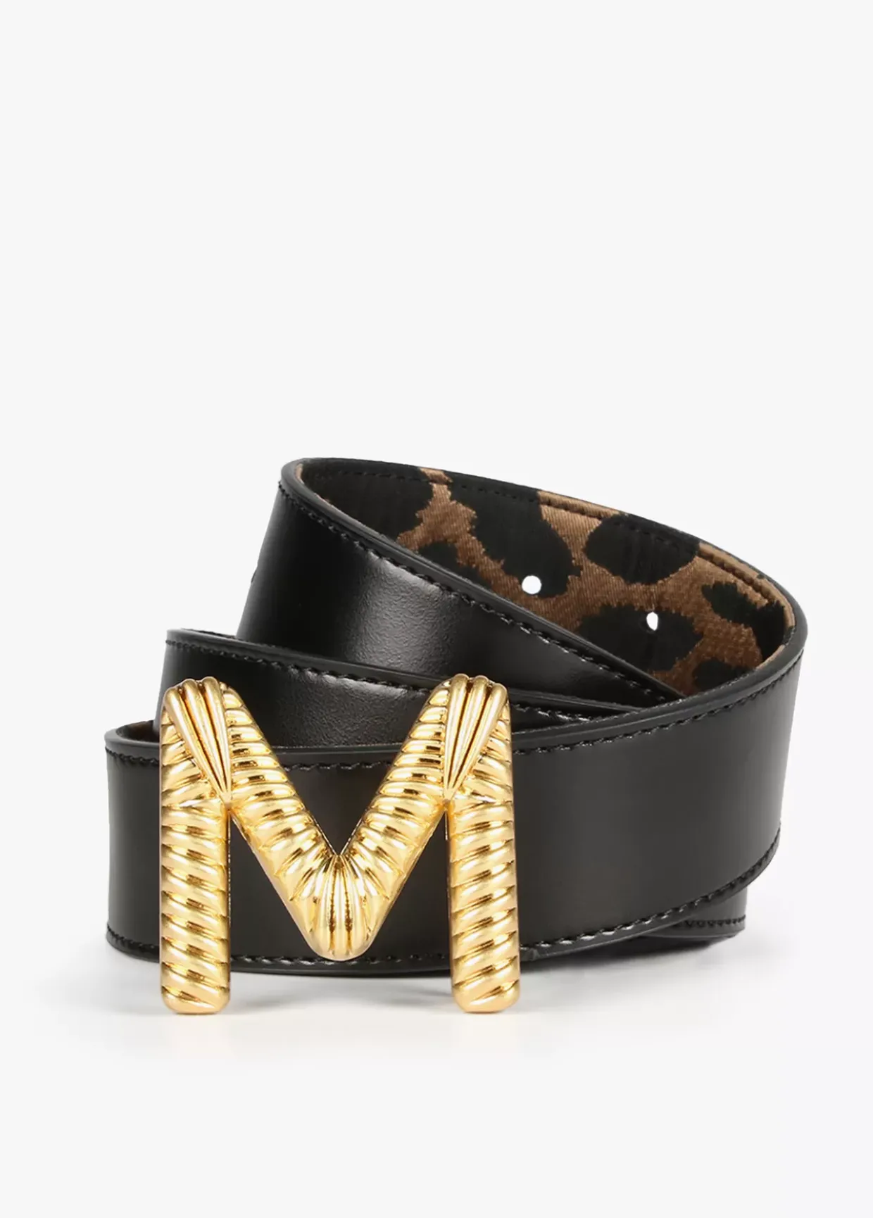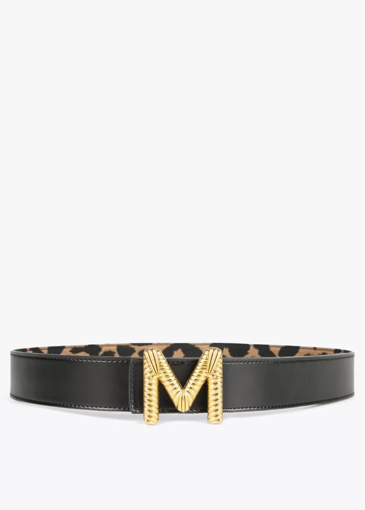 Cinturón reversible con estampado animal y color negro. Letra logo dorada y grabada a modo de hebilla.