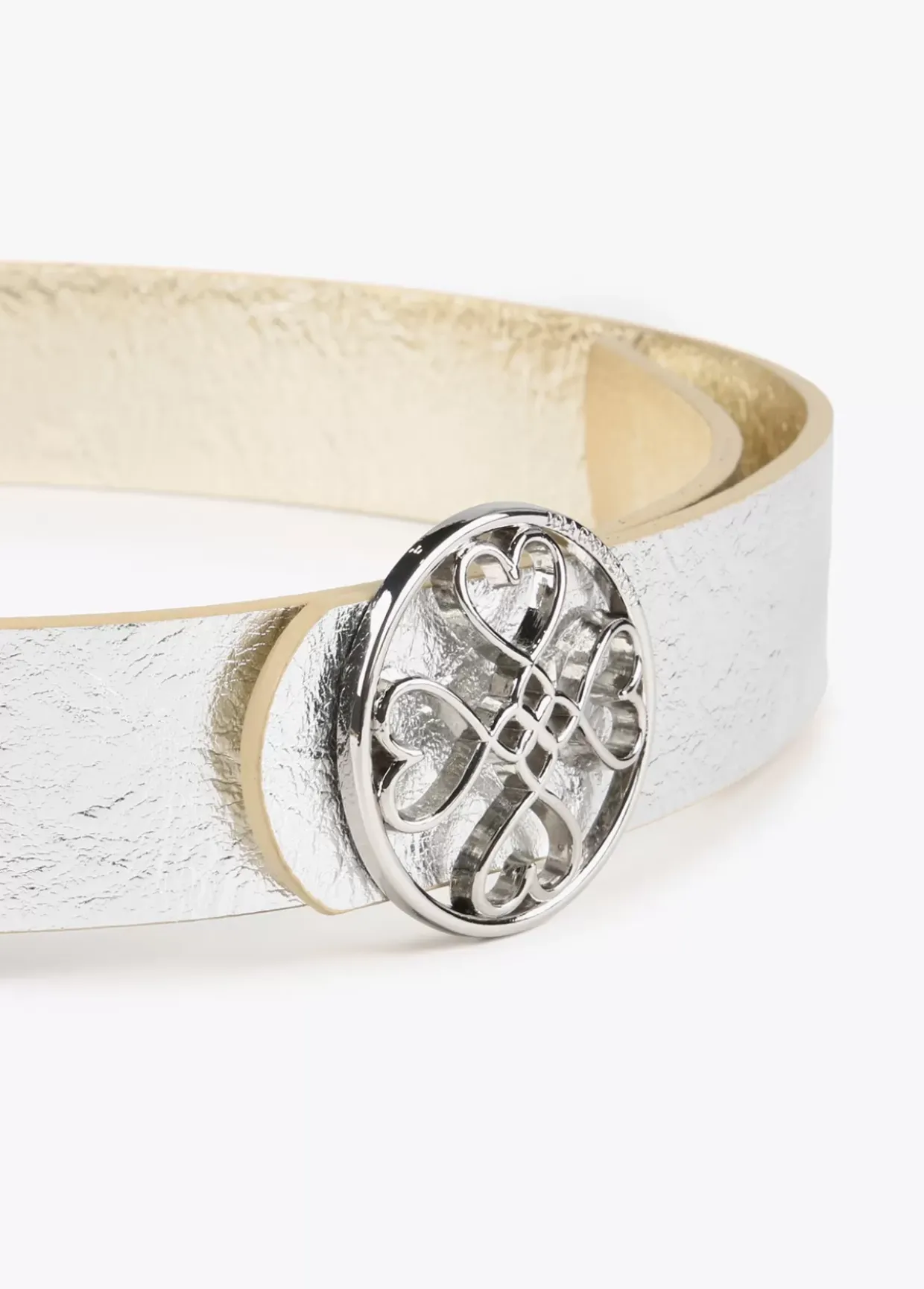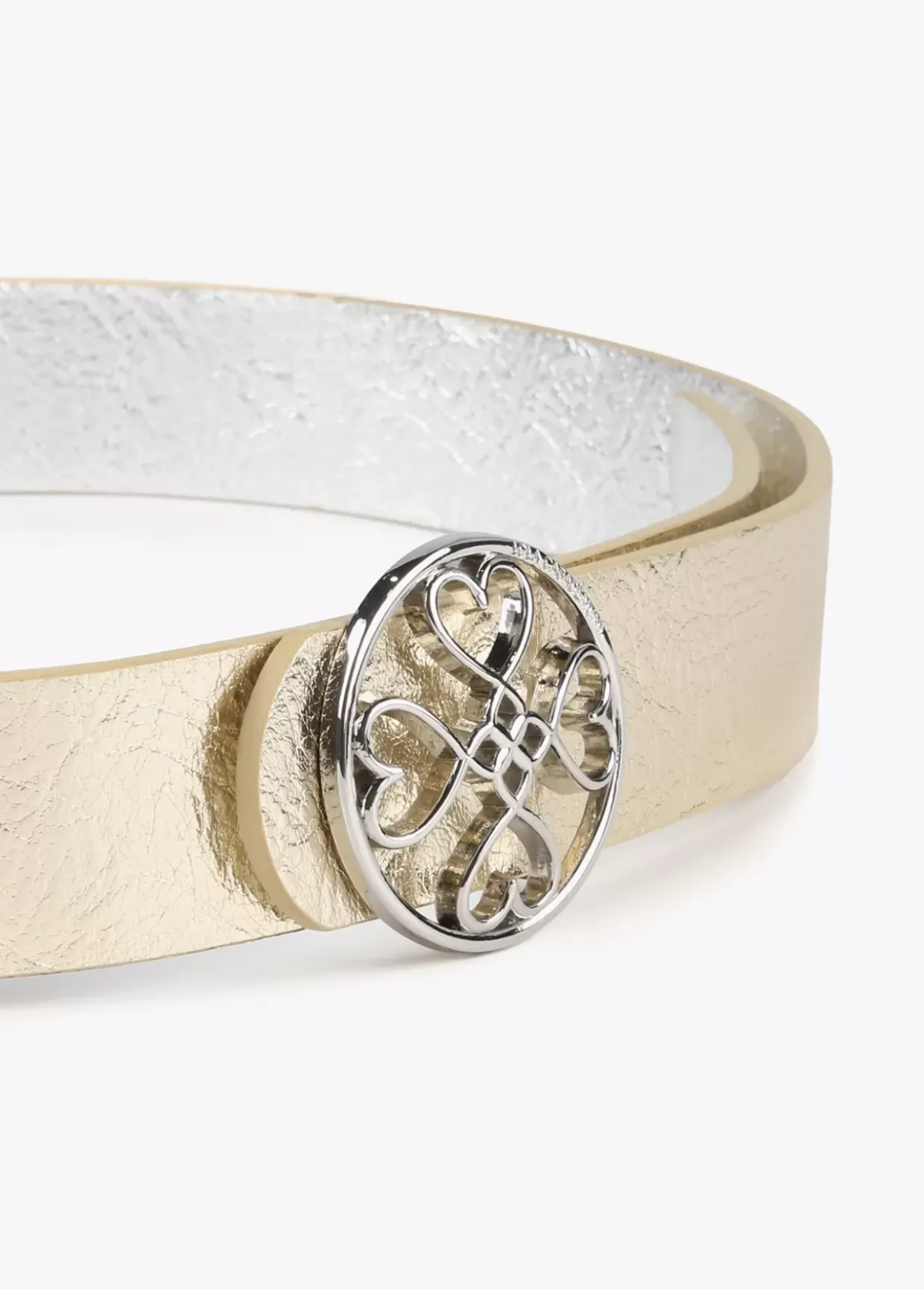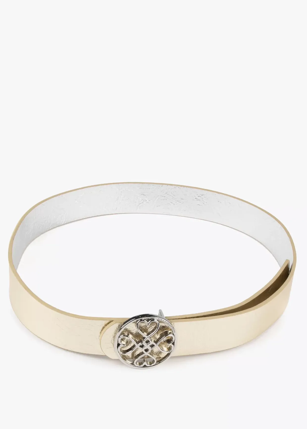 Cinturón reversible en efecto piel con hebilla dorada con corazones infinitos.
