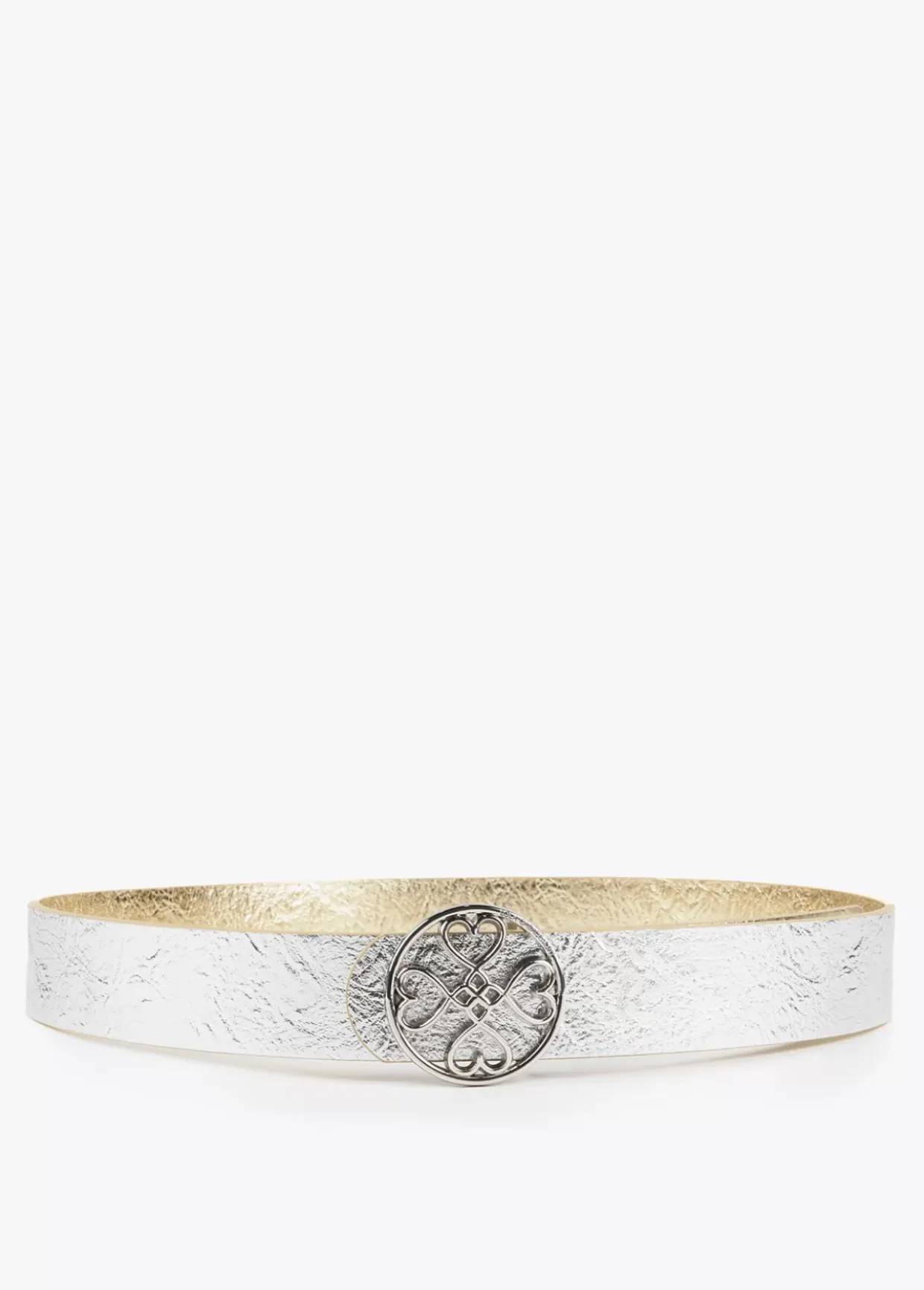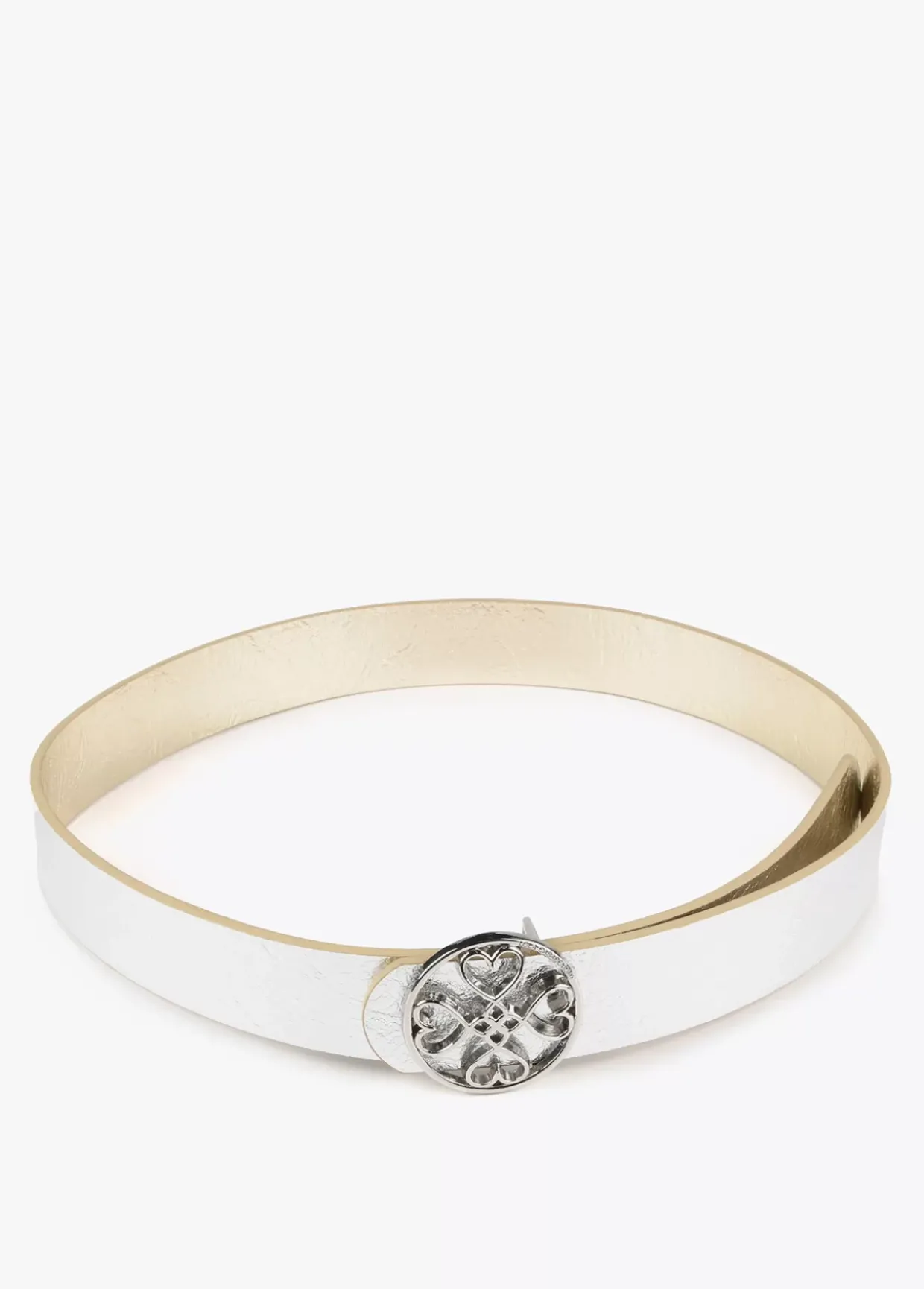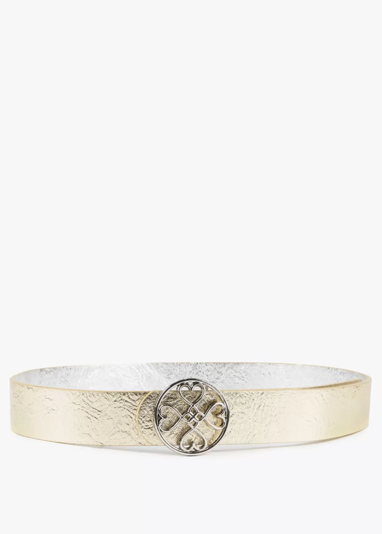 Cinturón reversible en efecto piel con hebilla dorada con corazones infinitos.