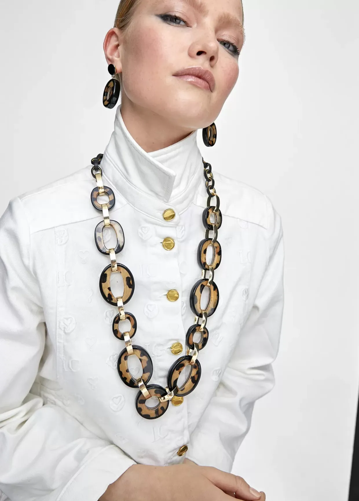 Collar largo de aros ovalados en animal print y detalles dorados. Cierre ajustable y medallita logotipada.