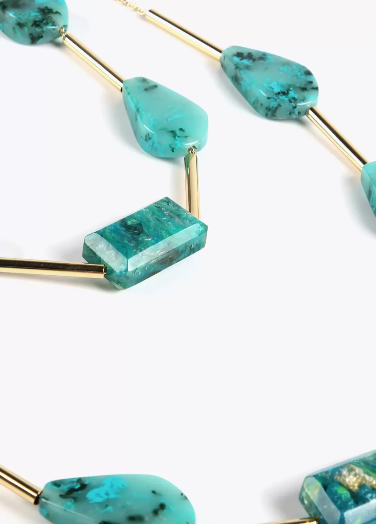 Collar doble con maxi piezas en color turquesa combinadas con detalles dorados. Cierre ajustable y medallita logotipada.