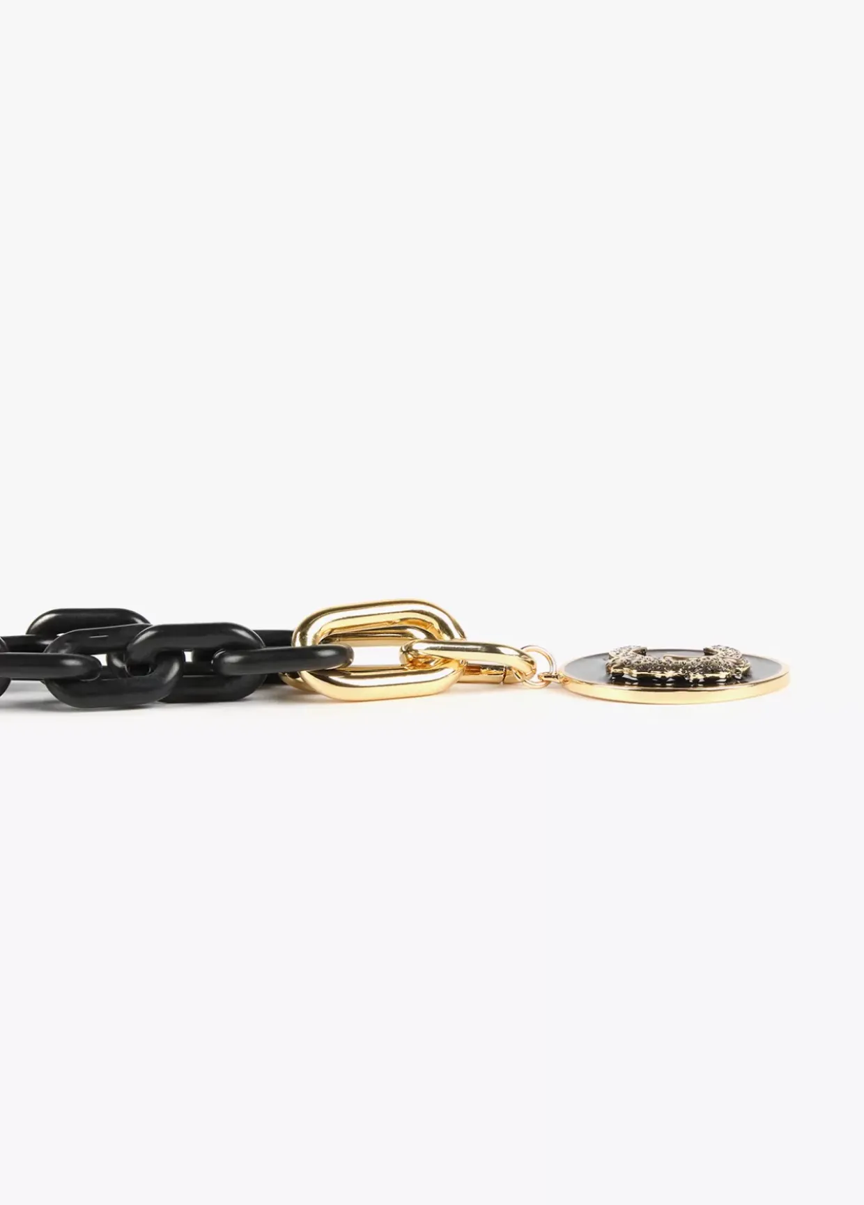 Collar tipo gargantilla de cadena negra con detalles dorados y medallón logo animal.