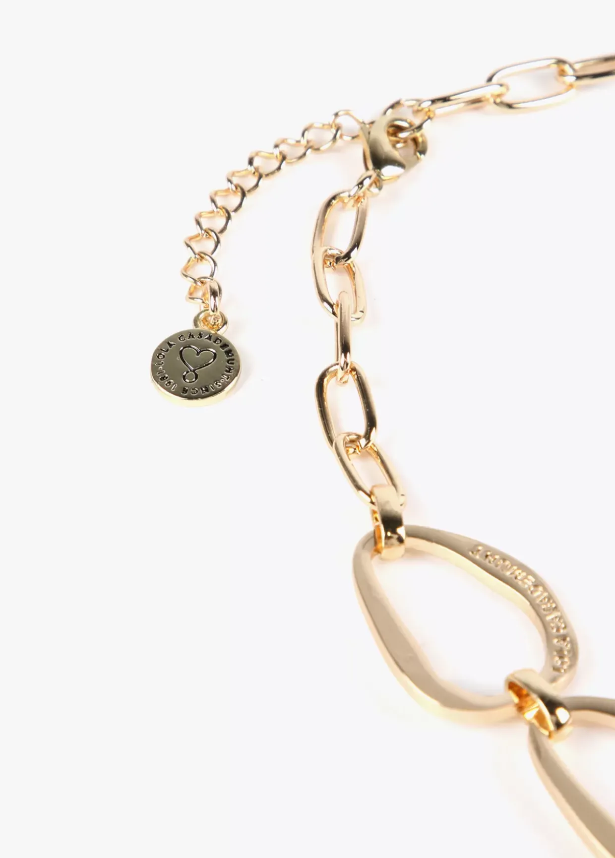 Collar dorado largo con cadena de óvalos. Cierre ajustable y medallita logotipada.