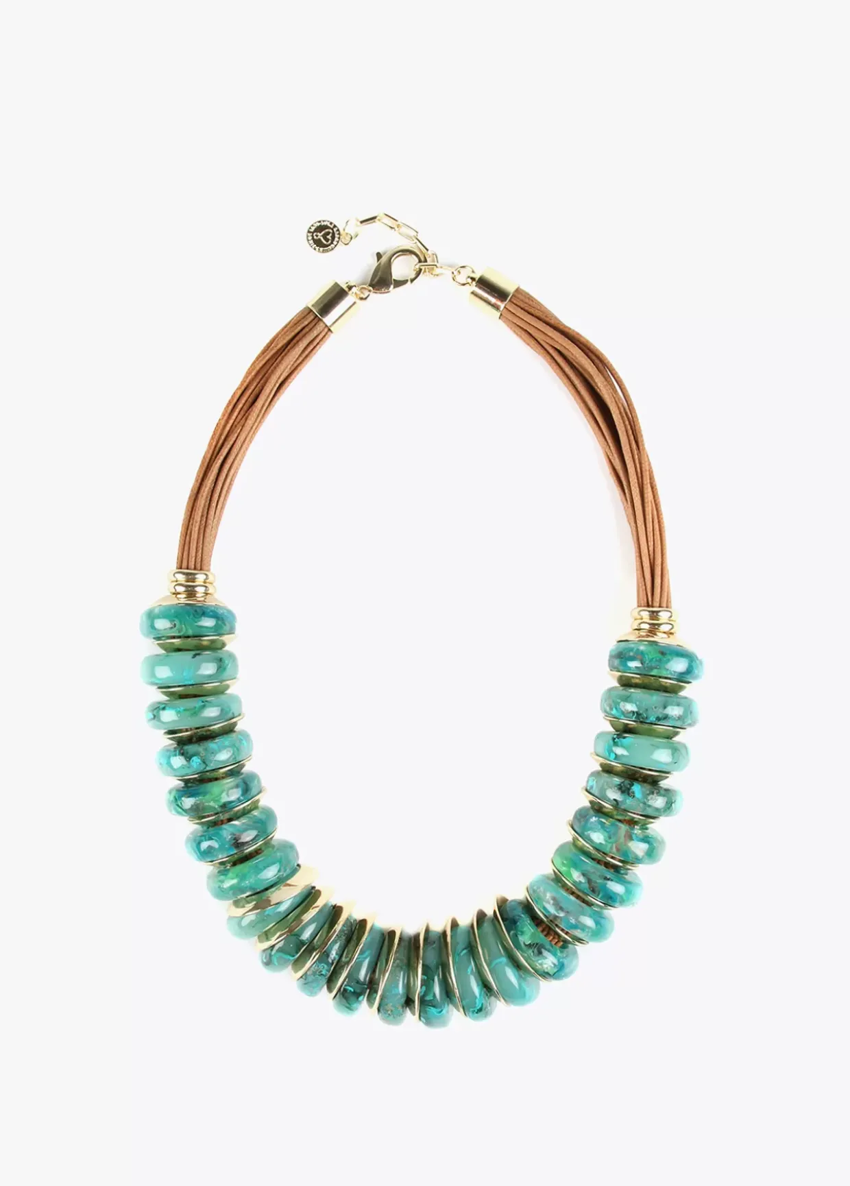 Collar de piezas redondas en tonos crudos y turquesa y metá¡licas en color dorado. Cierre ajustable y medallita logotipada.