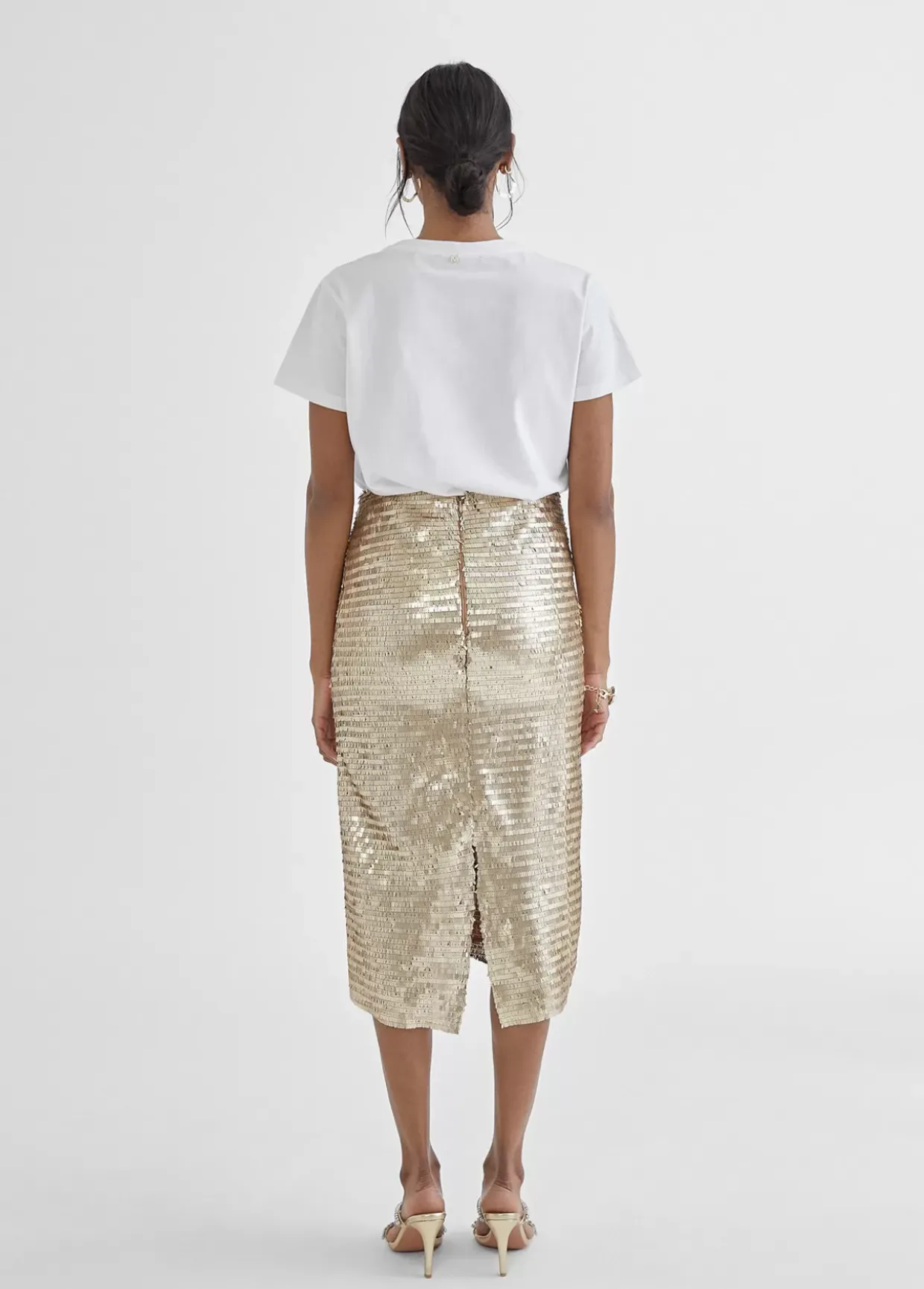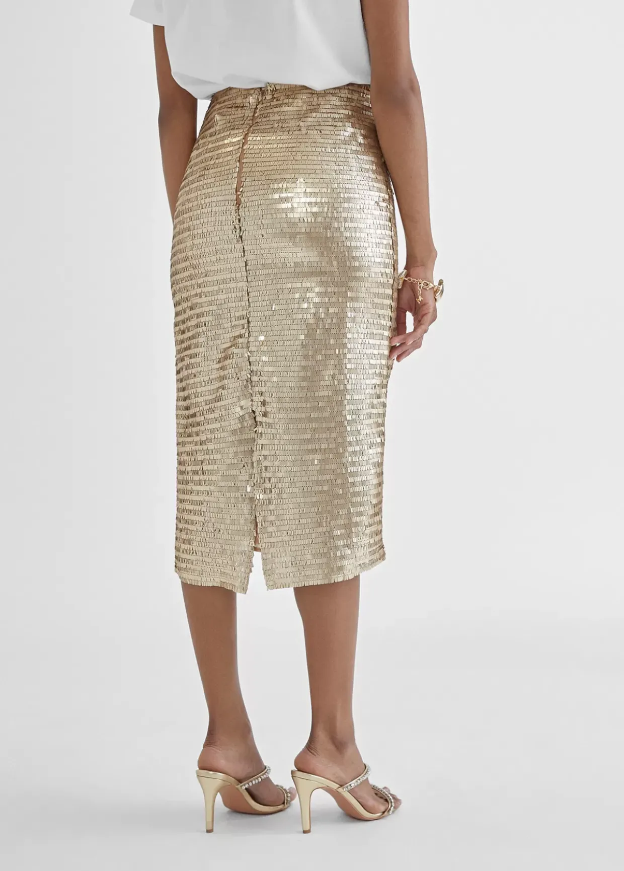 Falda dorada estilo lápiz de lentejuelas en color dorado. Cierre trasero con cremallera.