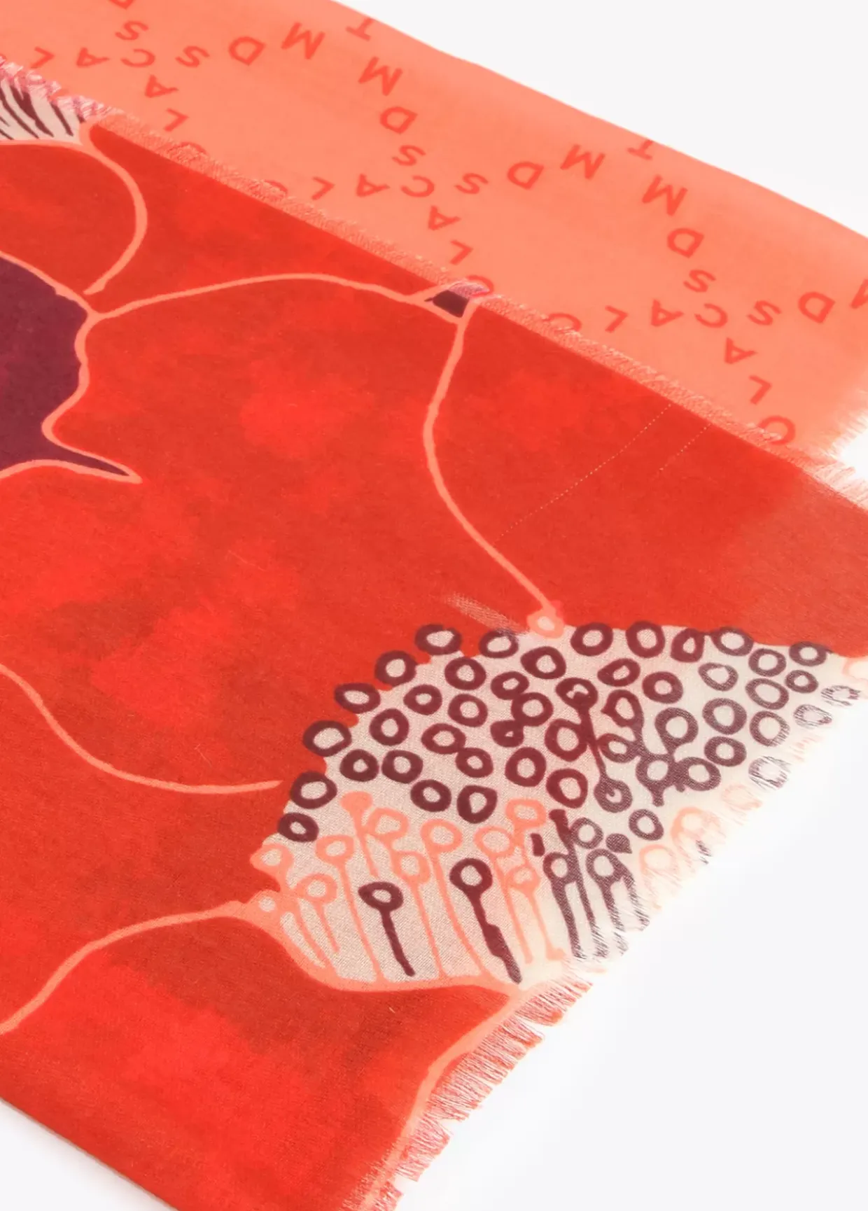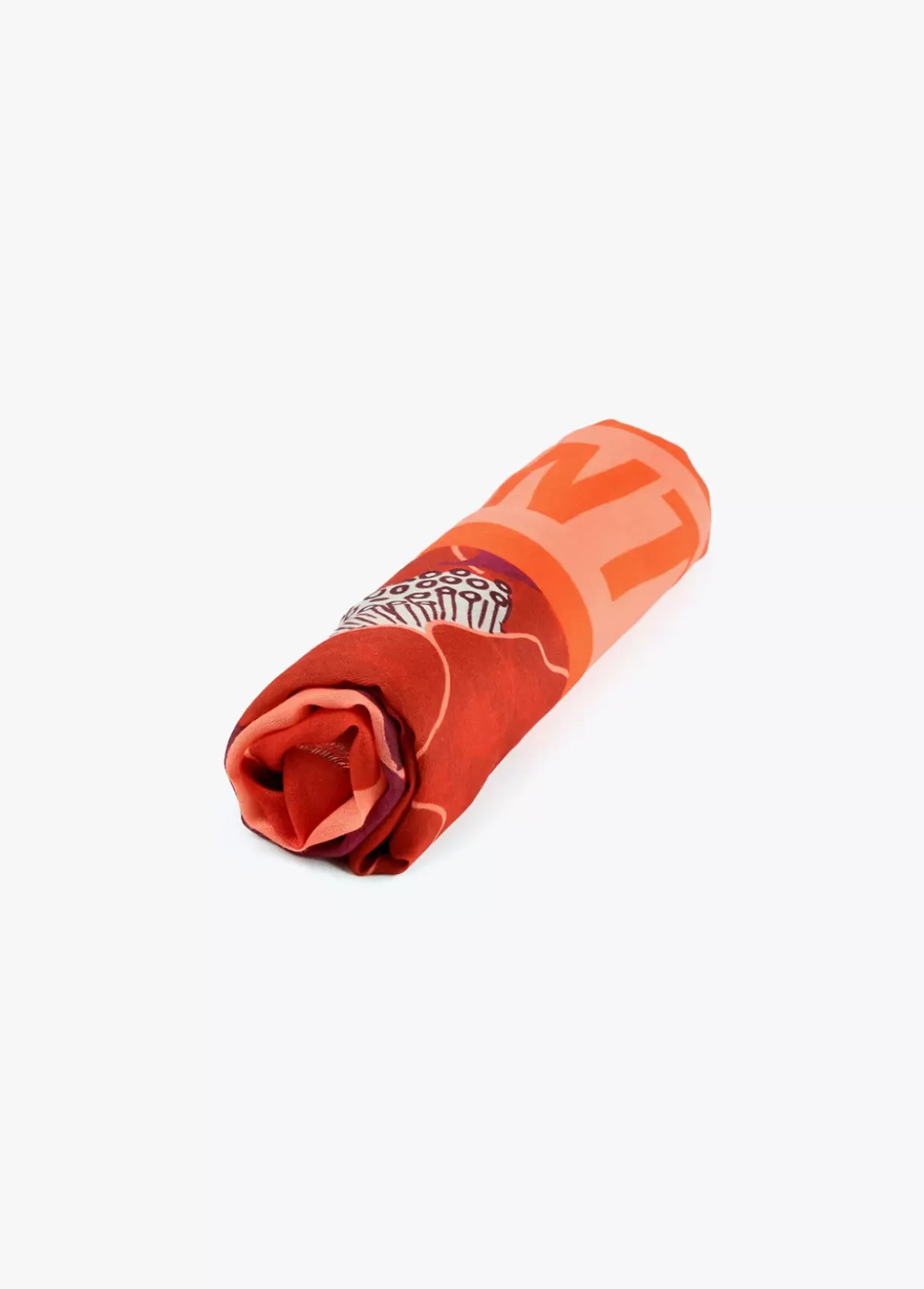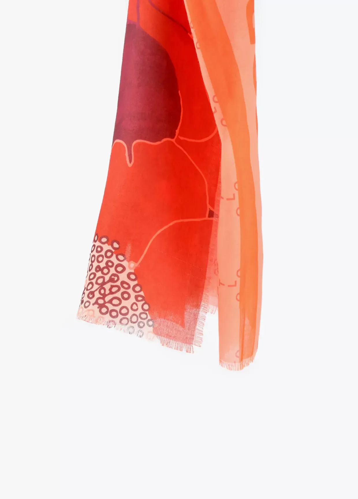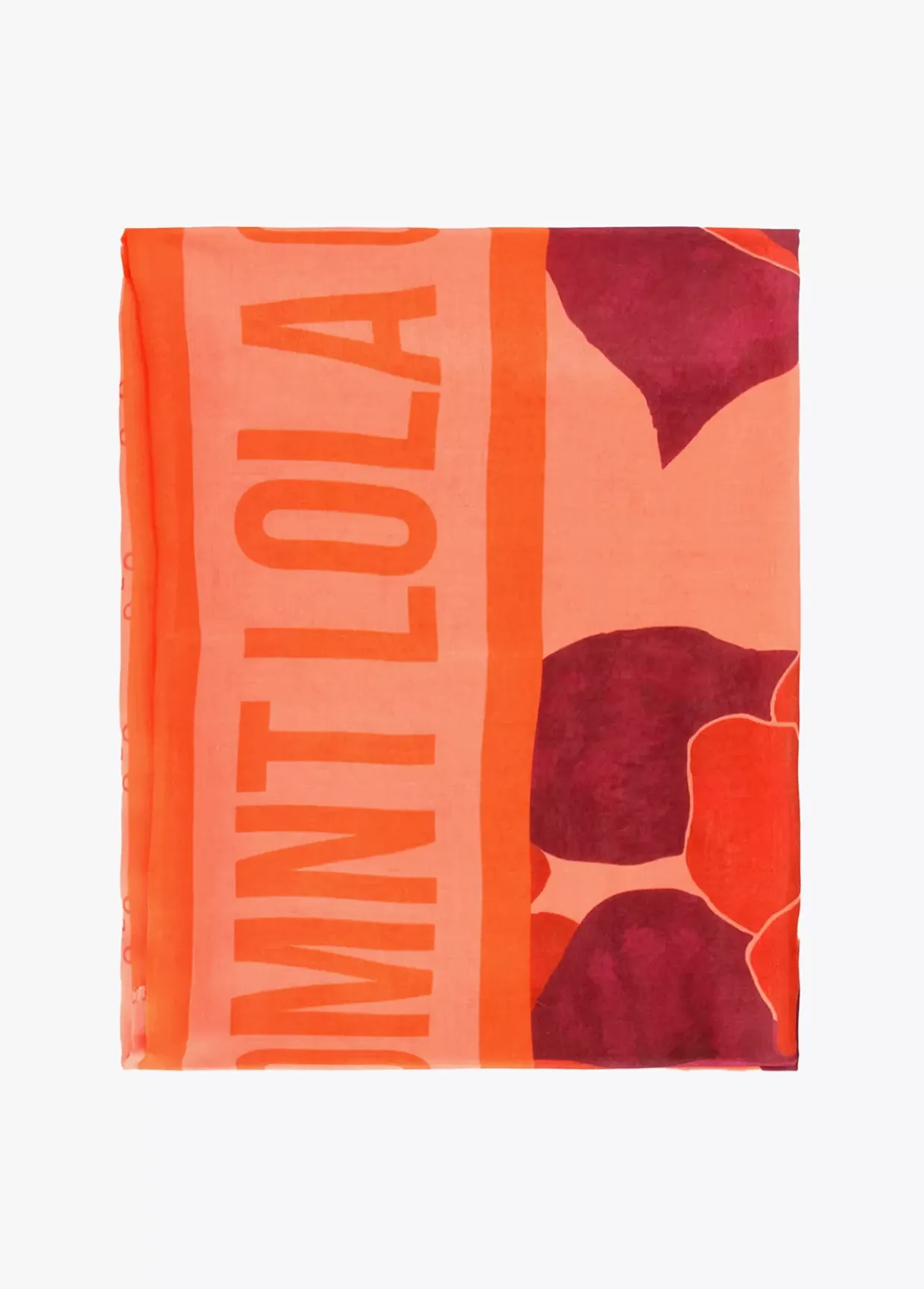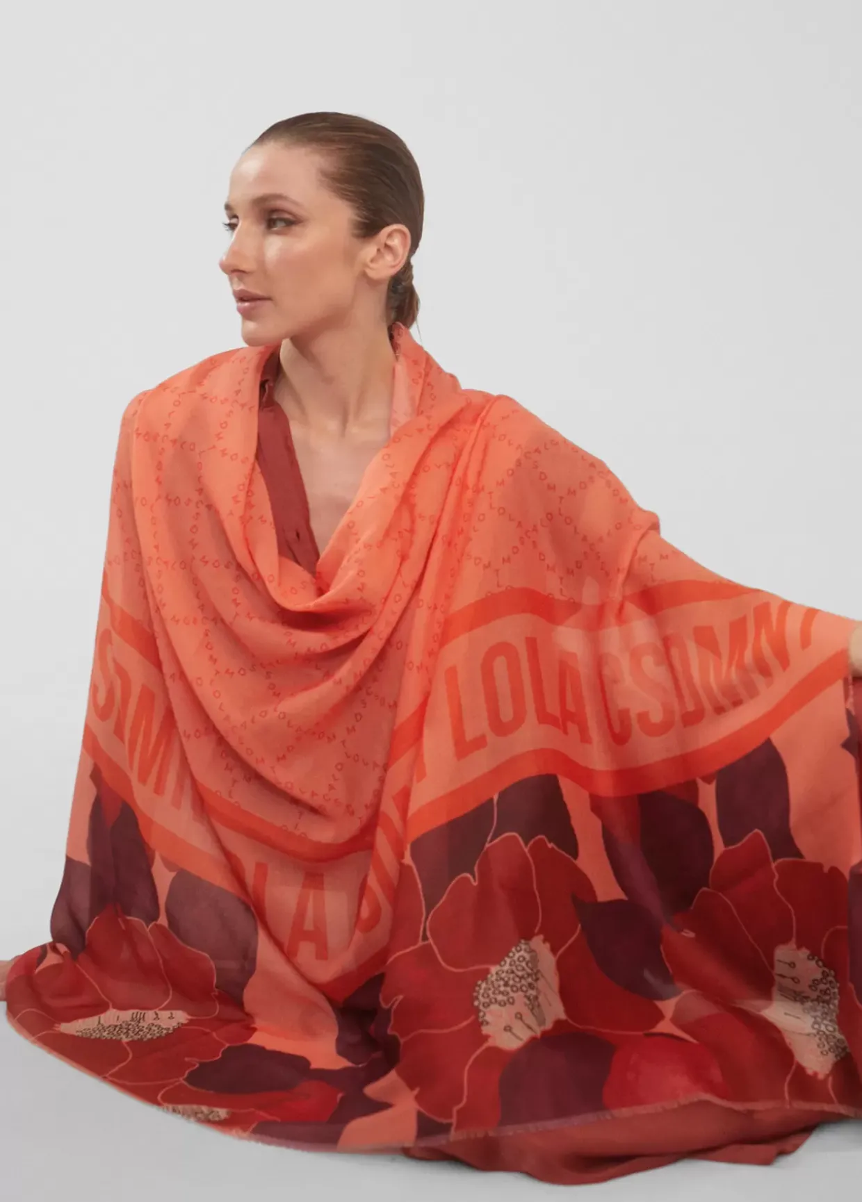 Fulard con maxi monograma combinado con motivos florales en tonos naranjas.