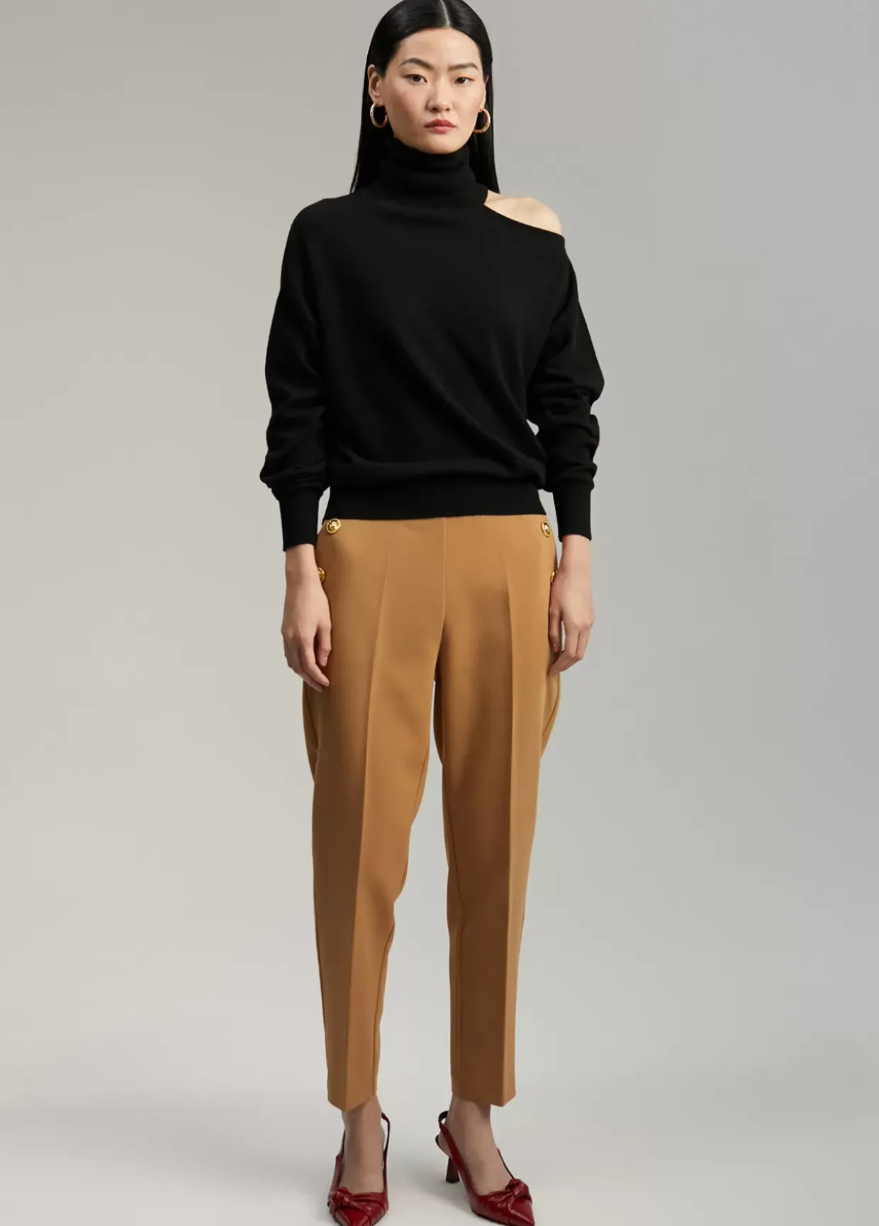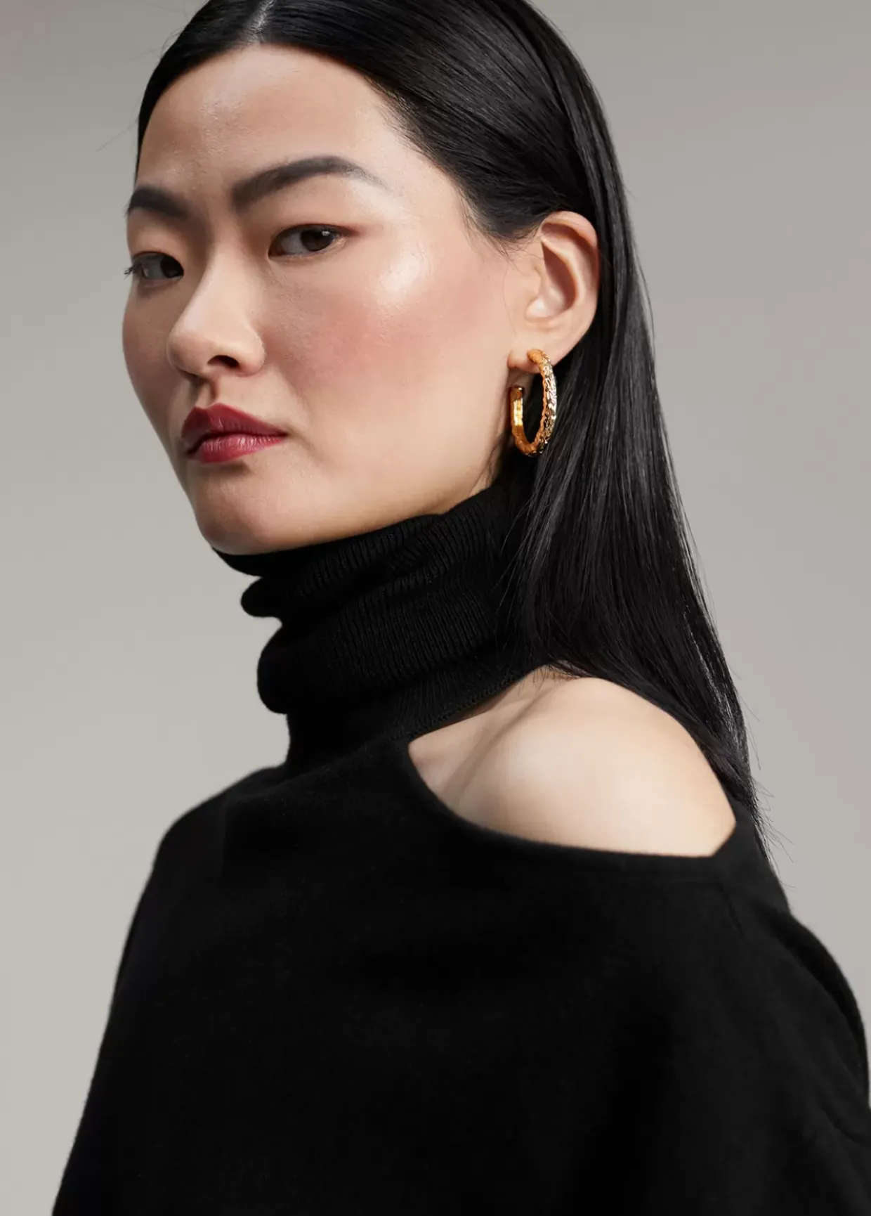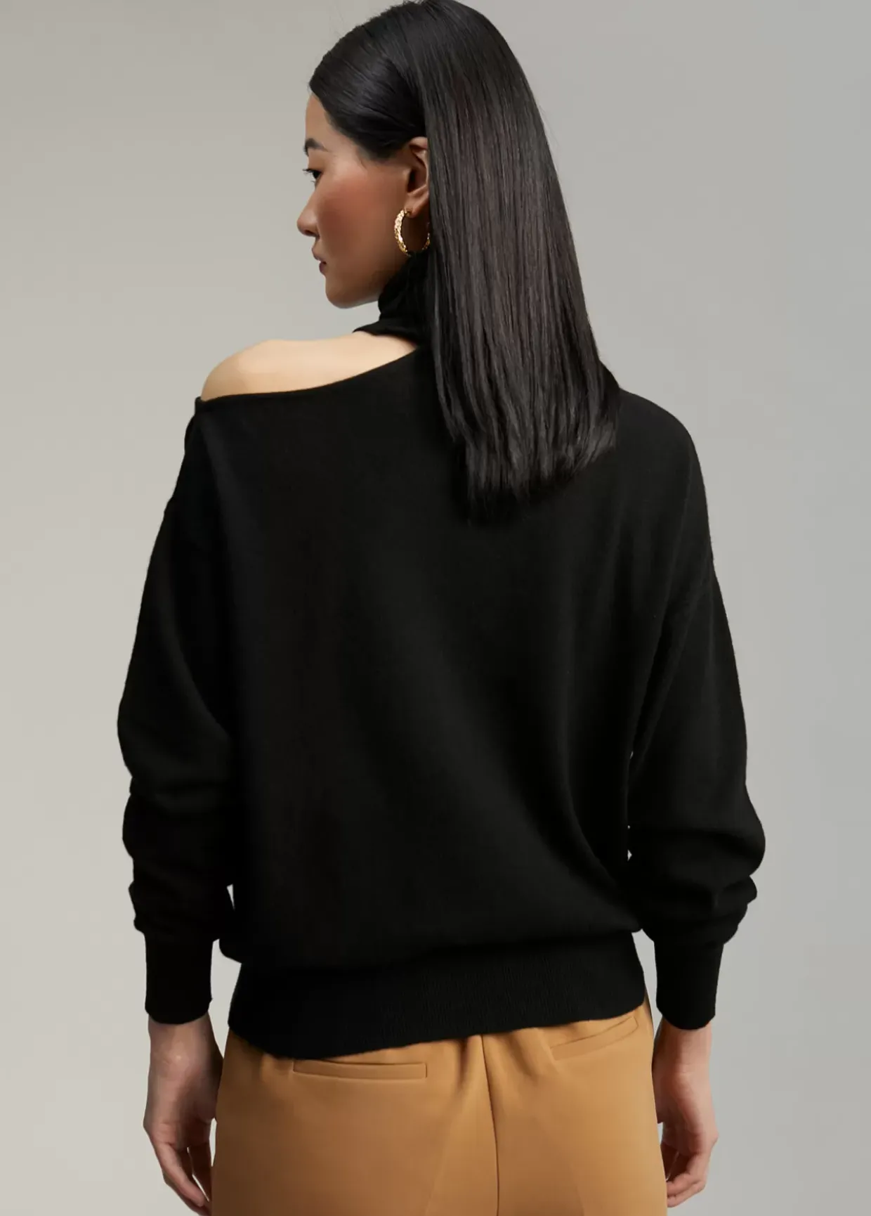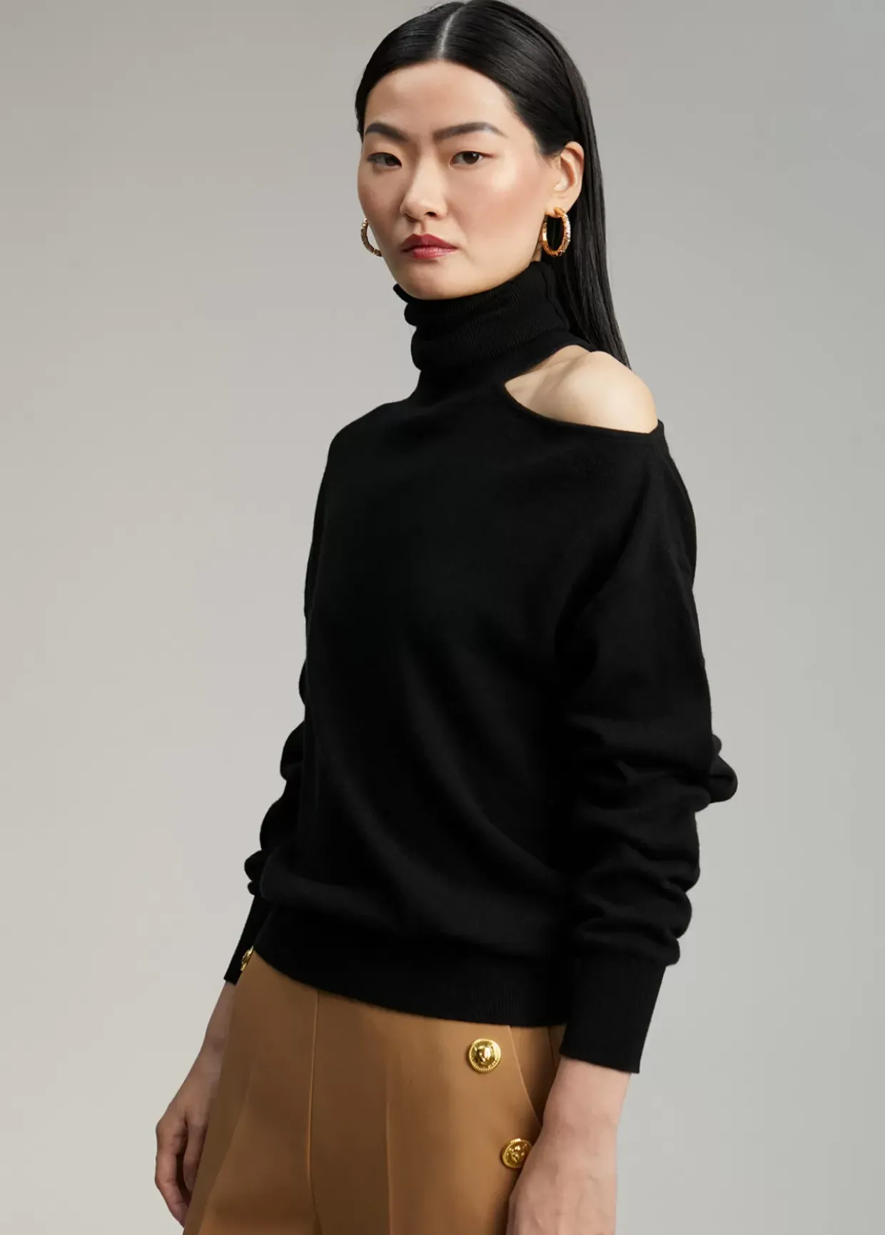 Jersey cuello alto y manga larga. Detalle de abertura en hombro.