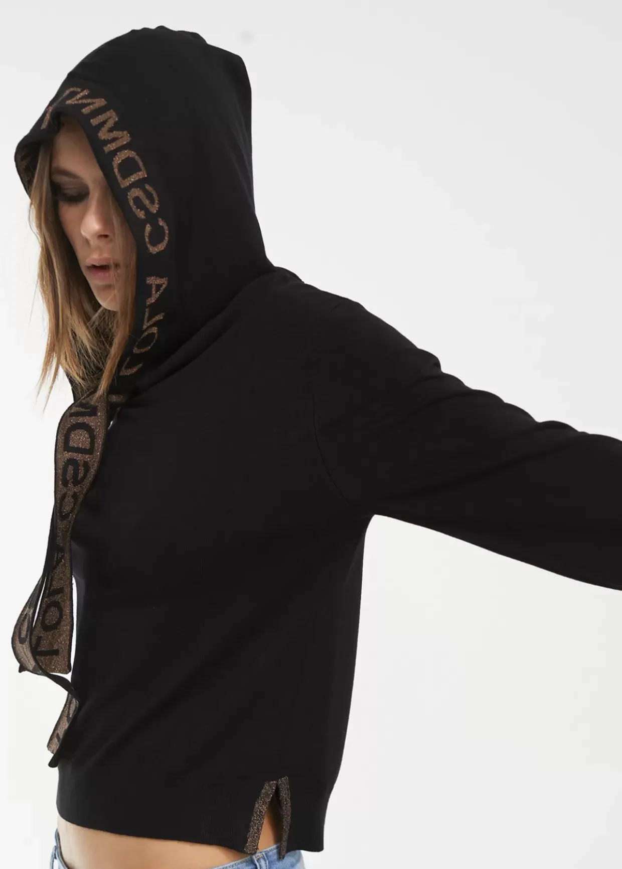 Jersey de punto con capucha. Detalle en lazo y capucha de logo en lúrex bicolor.