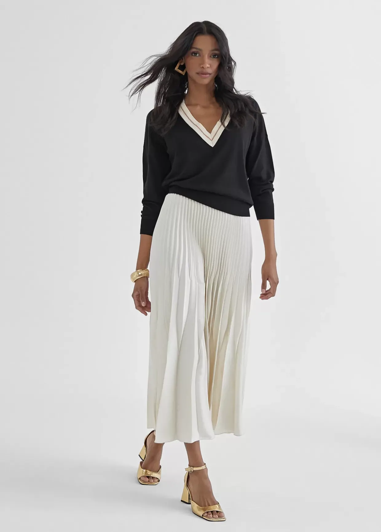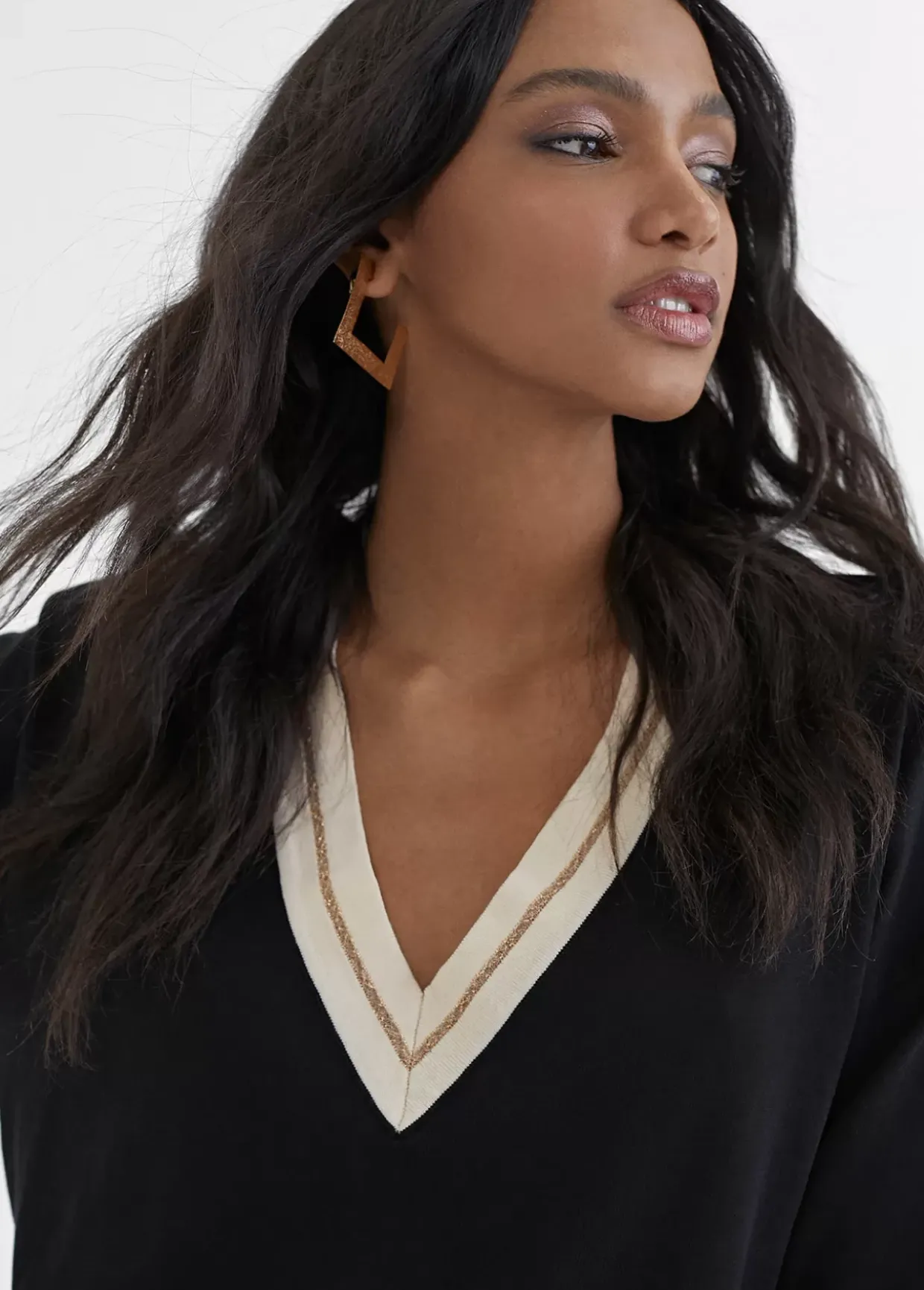 Jersey punto fino de manga larga. Escote pico con rib contrastado a color. Ajustado en puños y bajo.