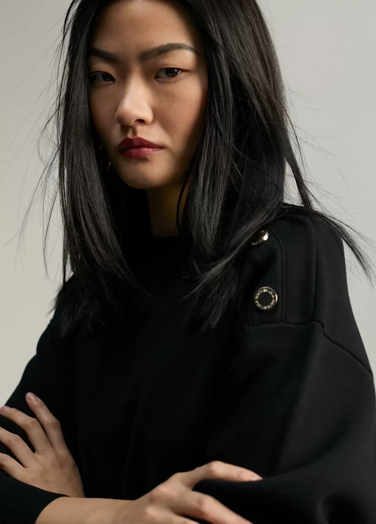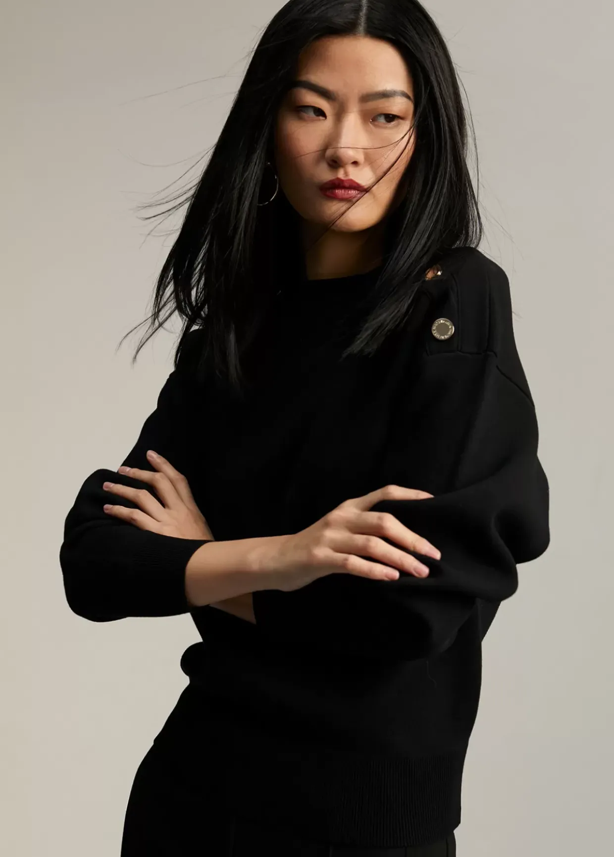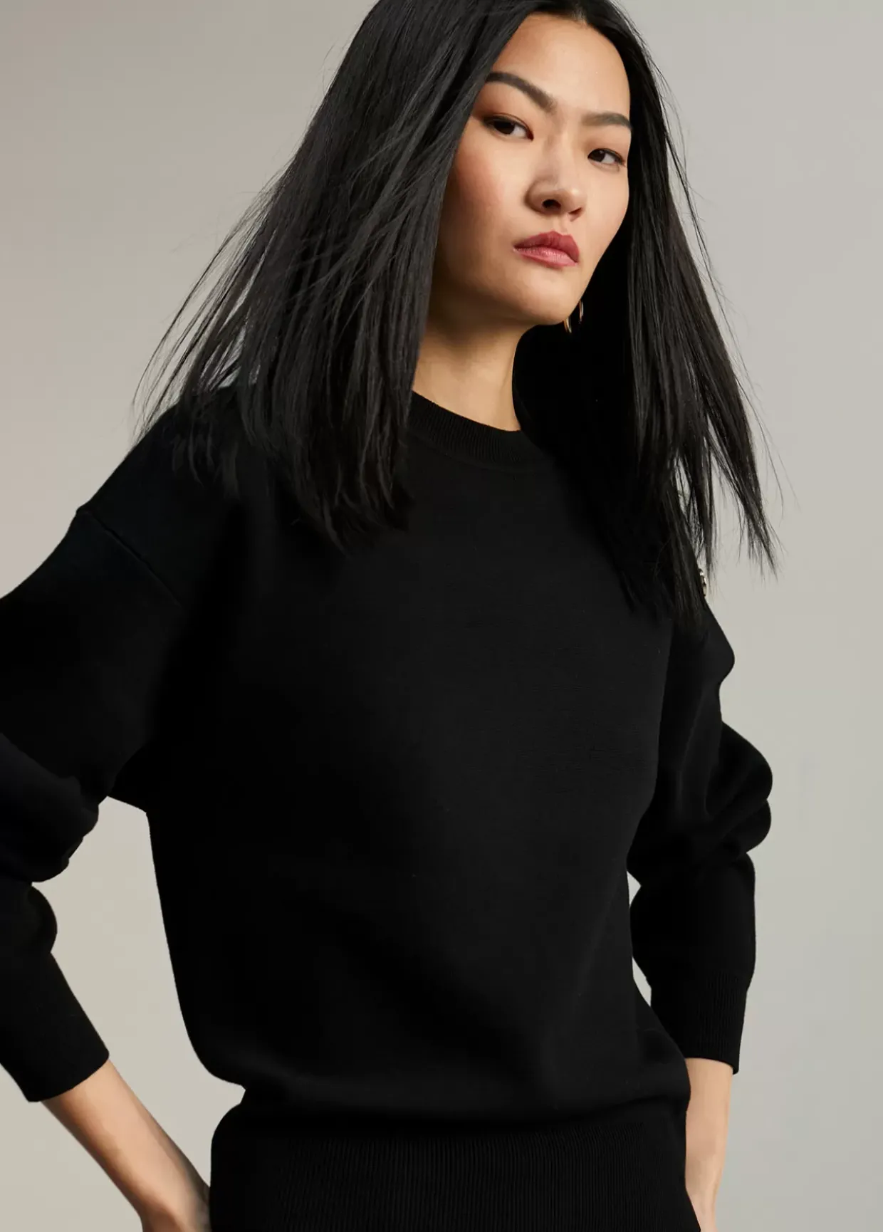 Jersey de punto de manga larga y cuello caja. Detalle de botones dorados en hombro.