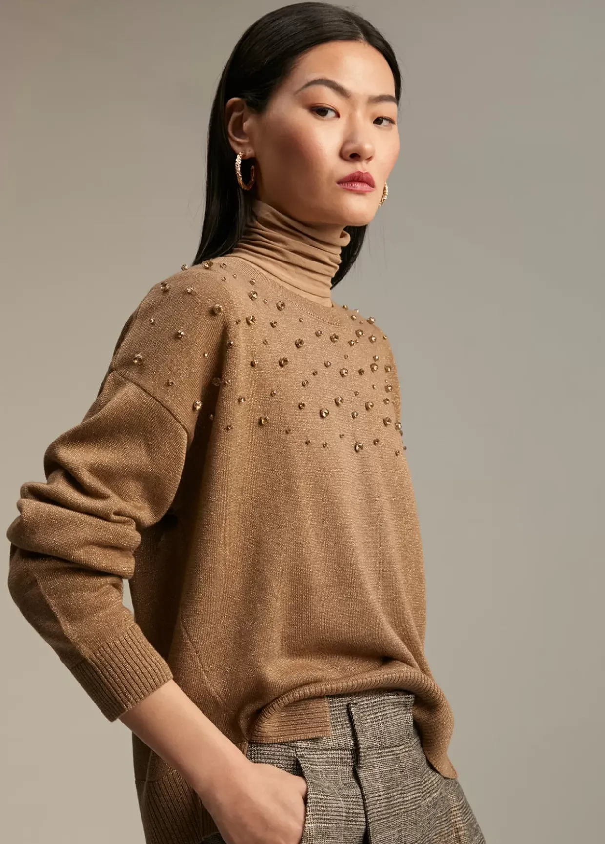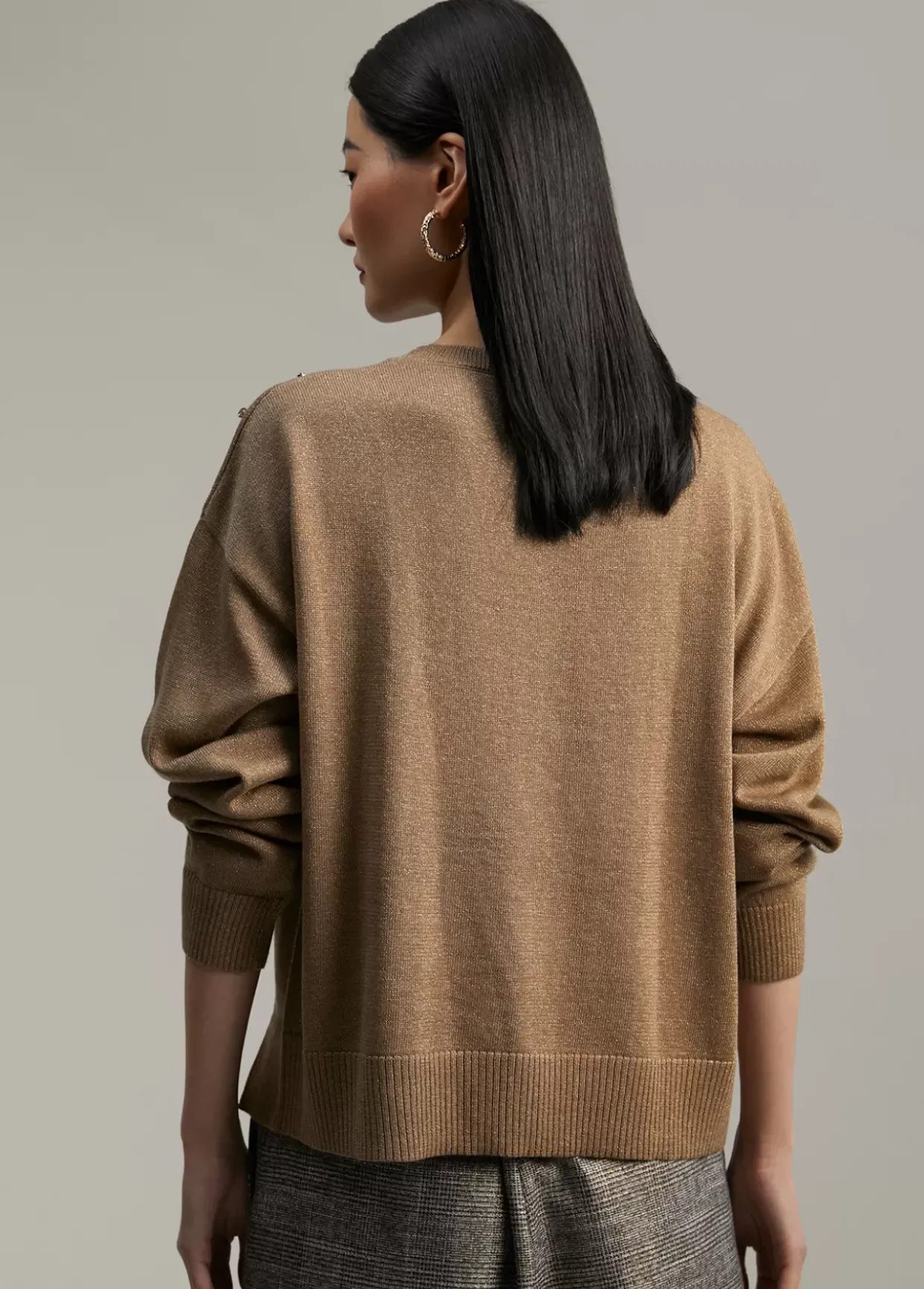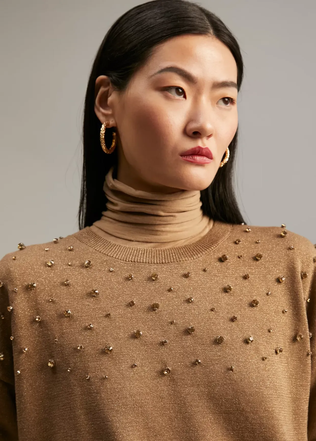 Jersey recto de cuello caja. Detalle joyas en frontal superior. Rib en canalé en cuello, puños y bajo.