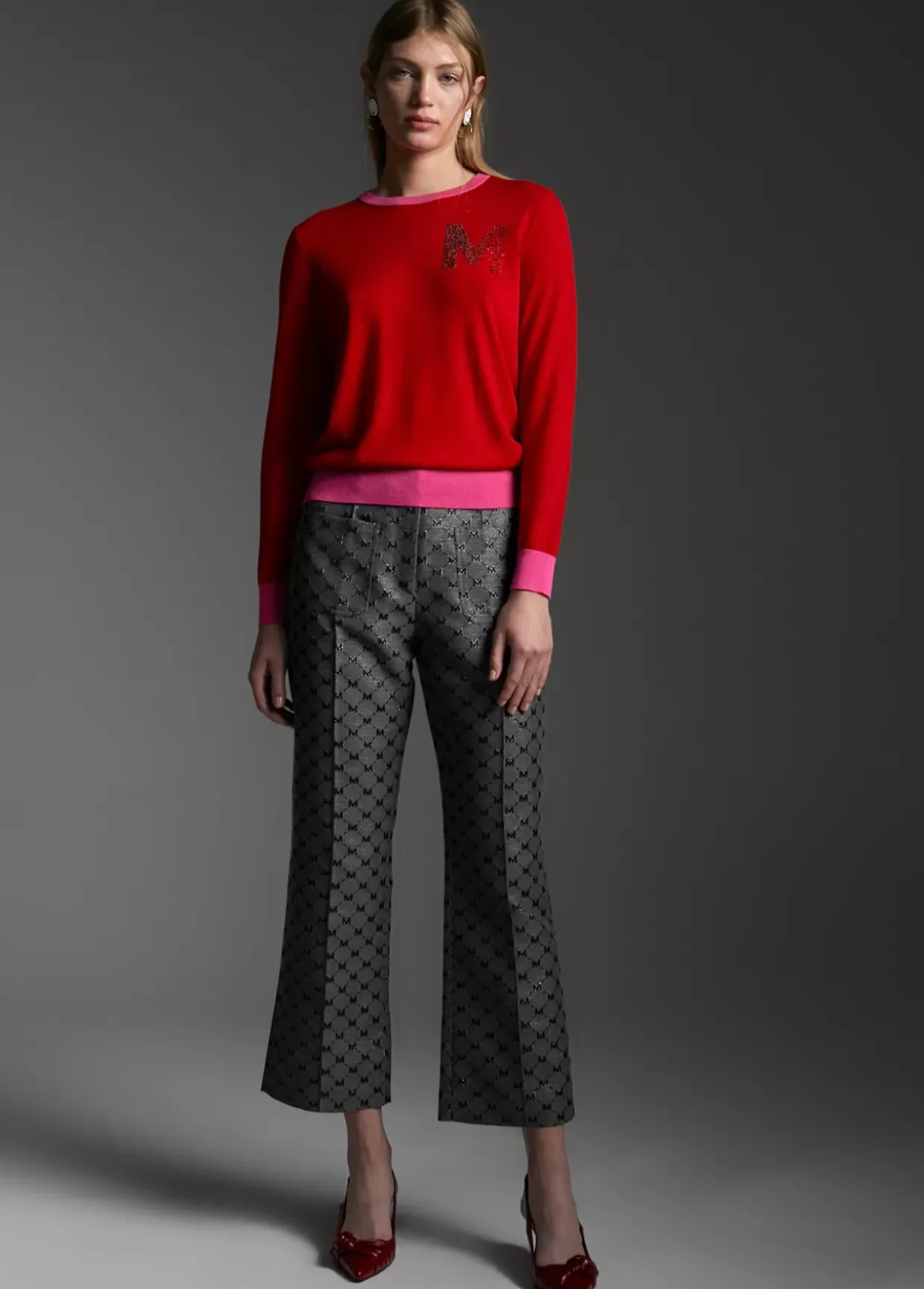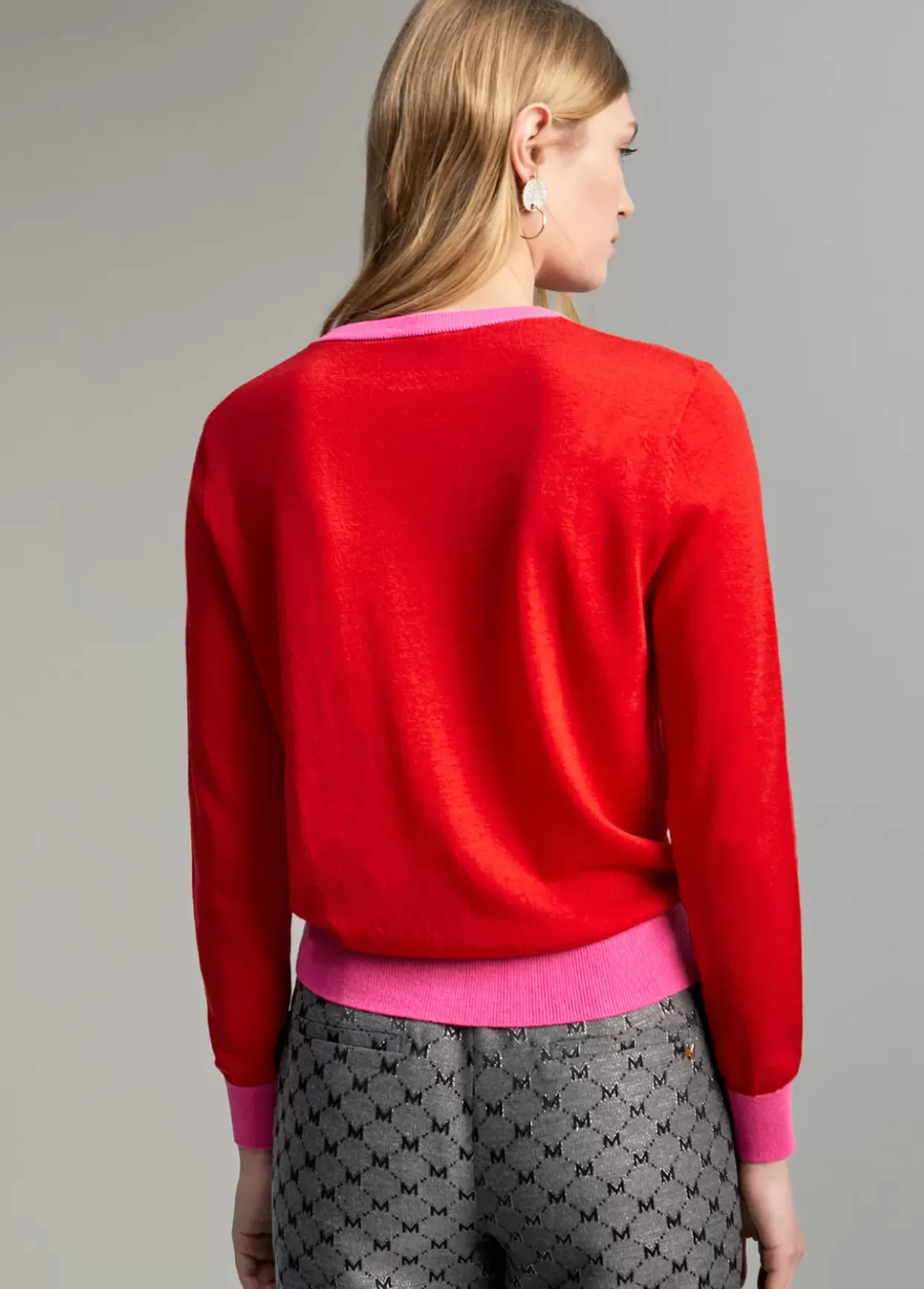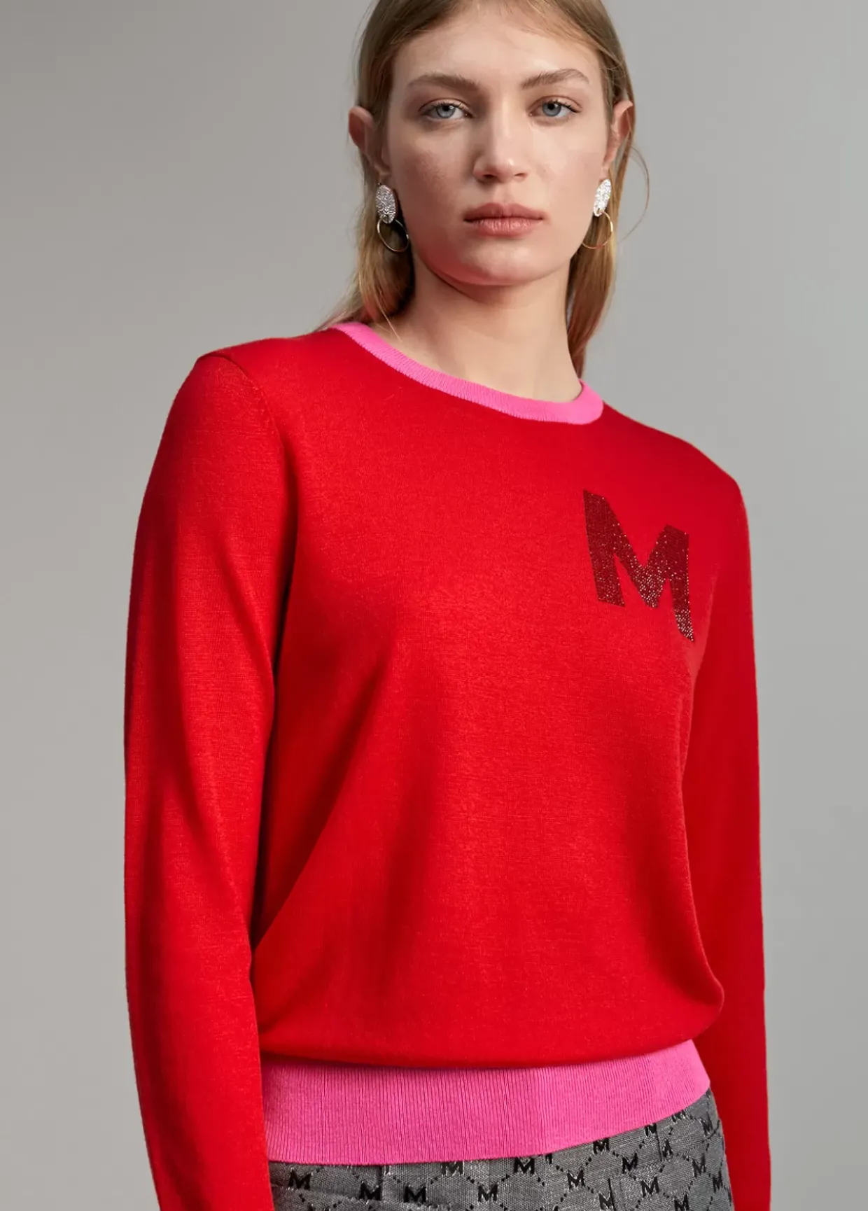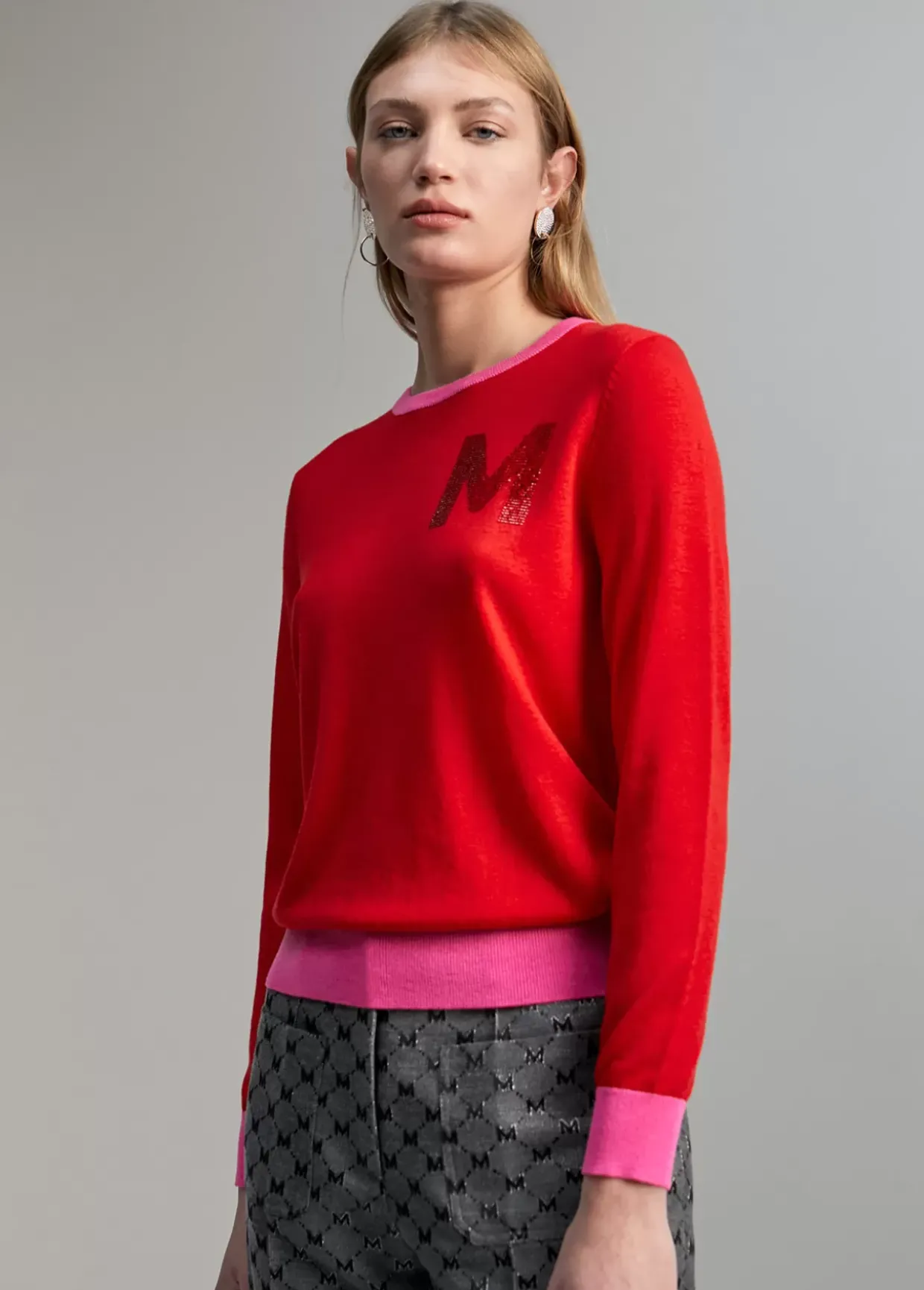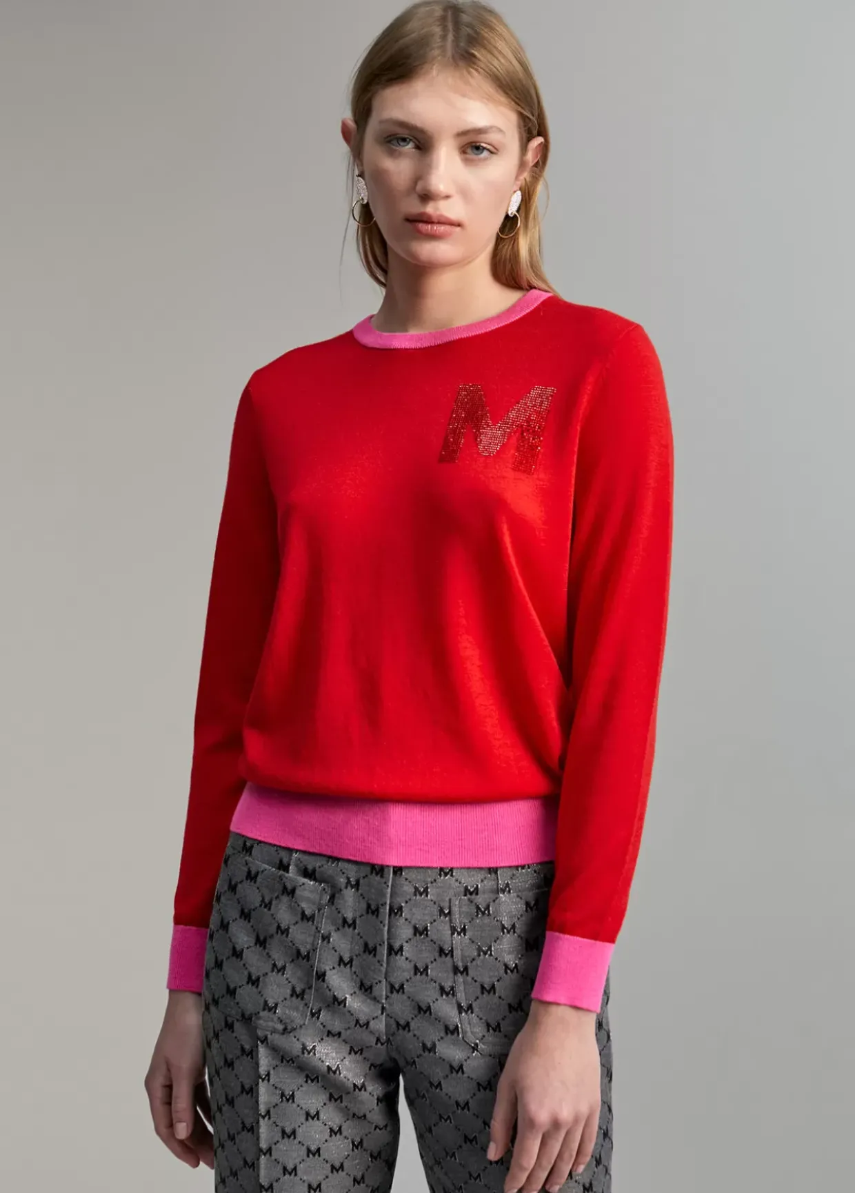 Jersey cuello caja y manga larga. Detalle de M en strass a tono en frontal. Rib de cuello, puños y bajo contrastado en otro color.