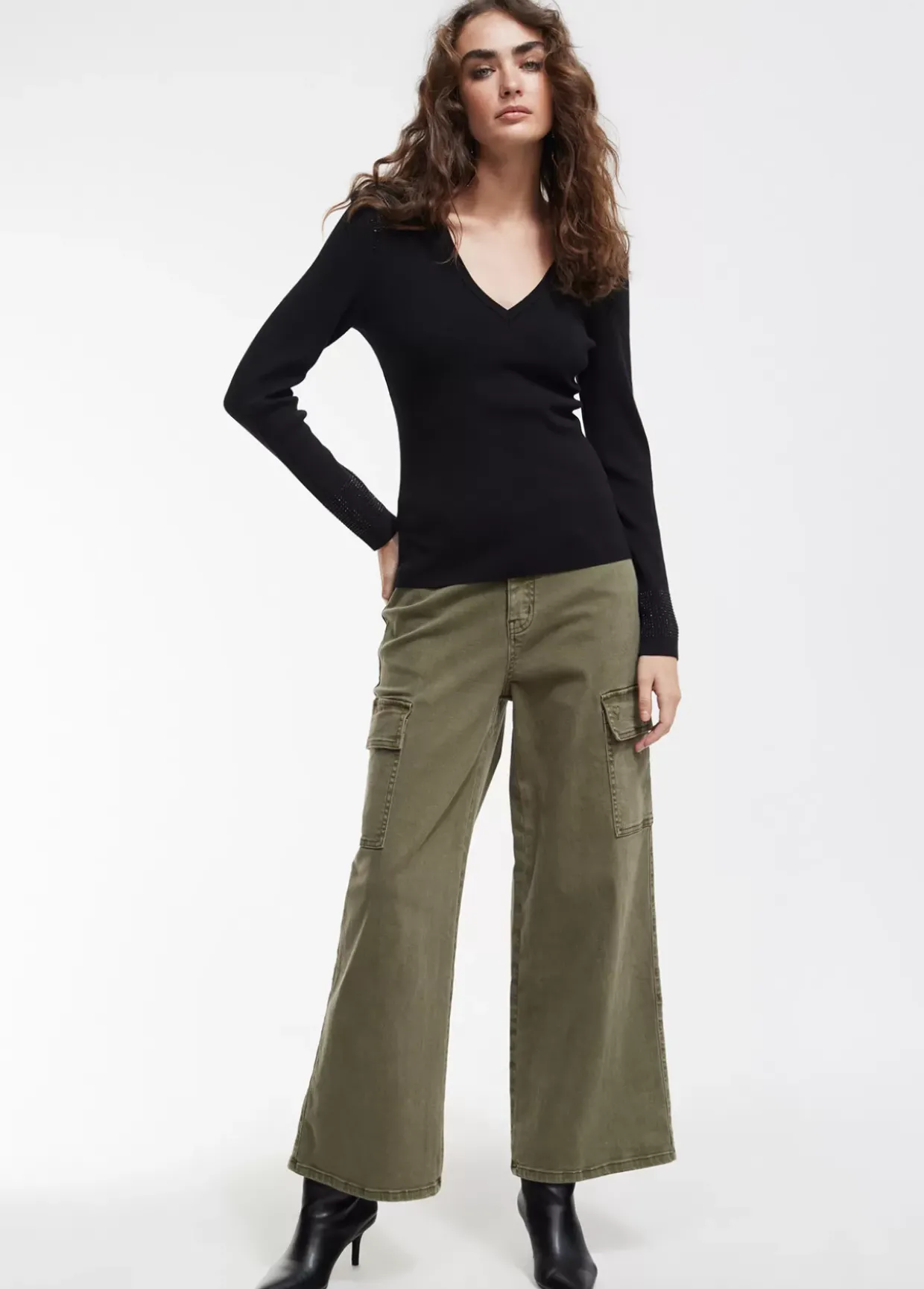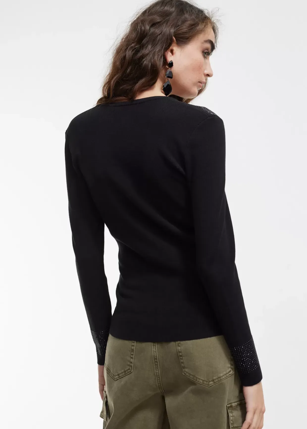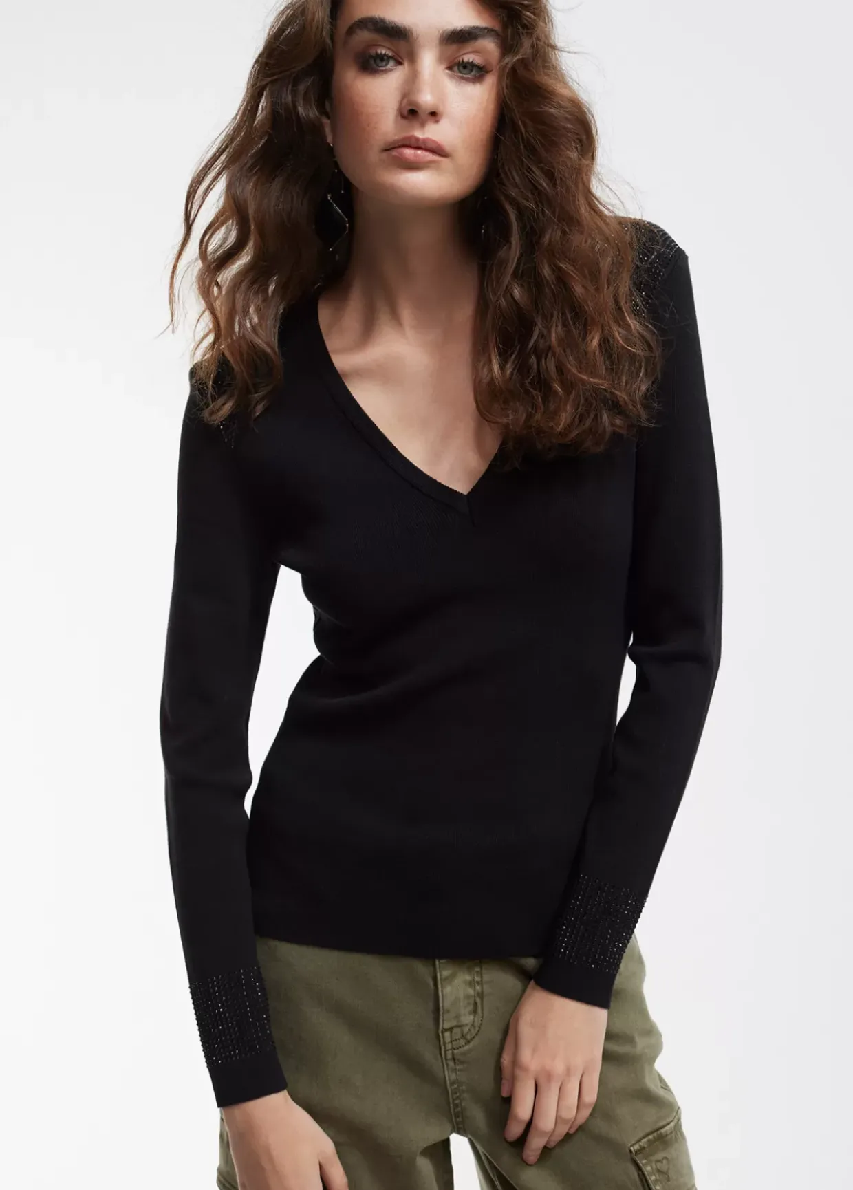 Jersey de cuello pico y manga larga. Detalle de strass a tono en hombros y puños de mangas.