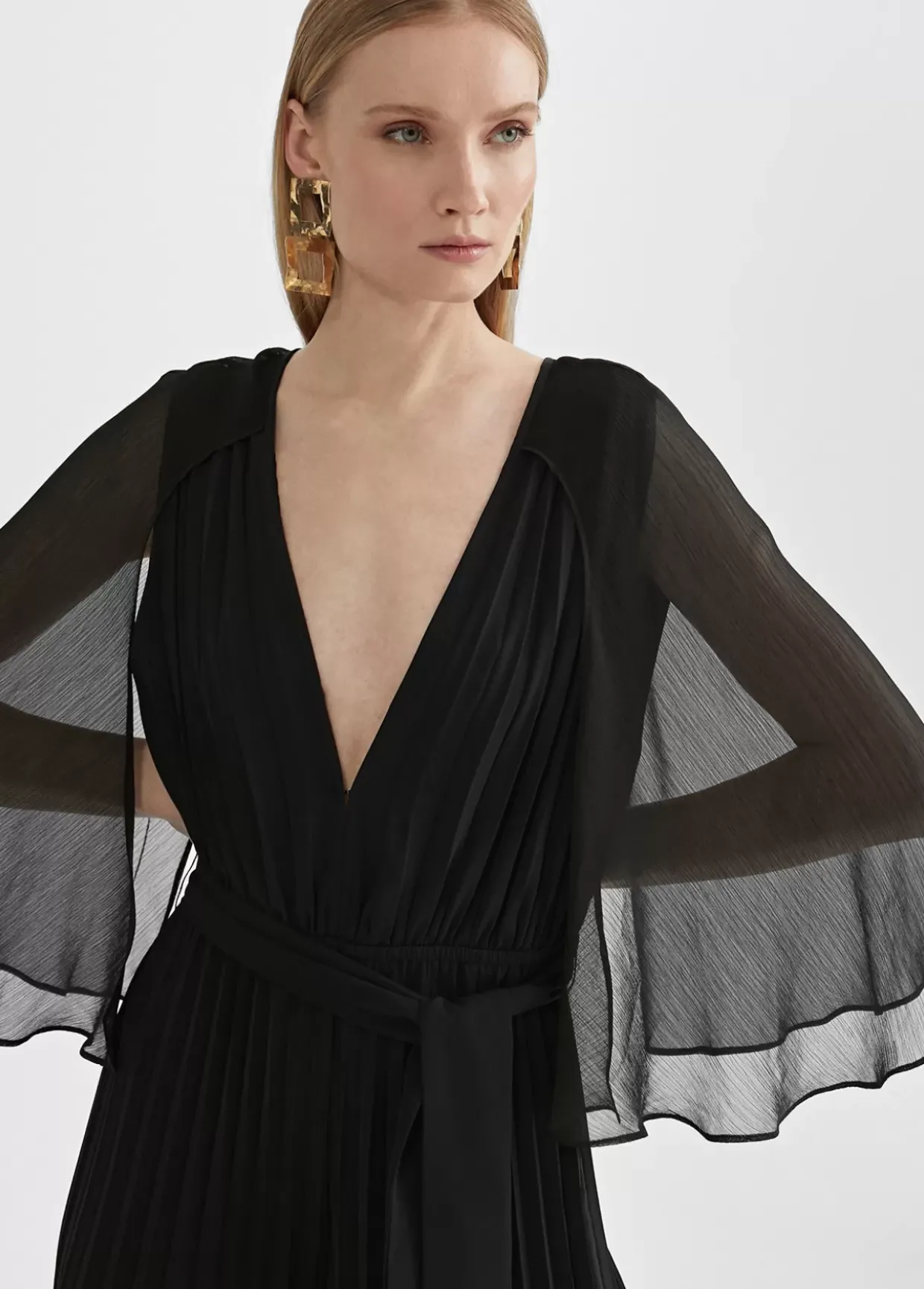 Mono largo plisado de tejido fluido. Escote pico en frontal y espalda. Cinturilla elástica. Mangas efecto capa. Cinturón del mismo tejido y color.