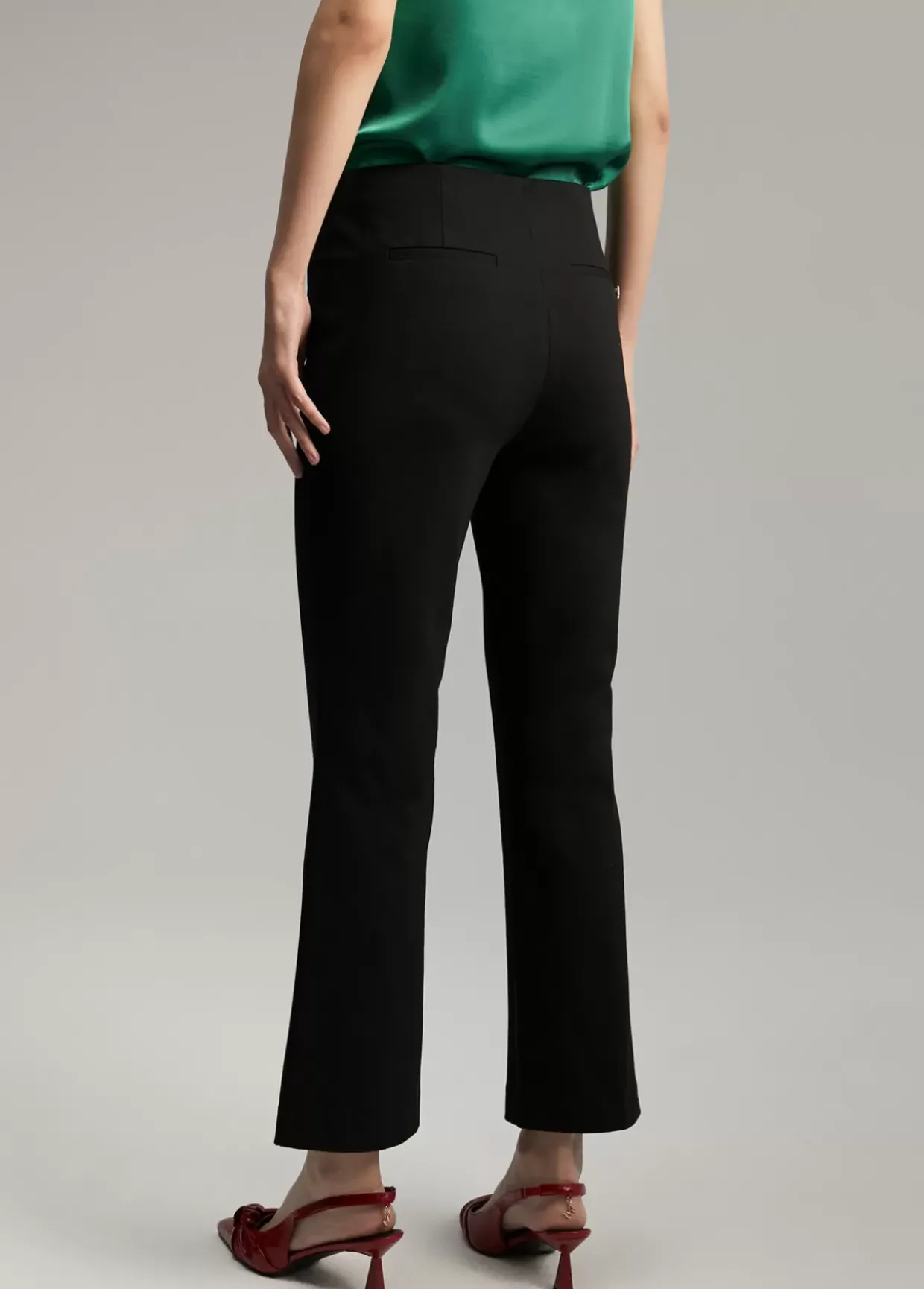 Pantalón de largo tobillero y ligeramente acampanado en bajo. Detalle de botones metálicos dorados en frontal. Cremallera lateral y falso bolsillos de vivo en espalda.