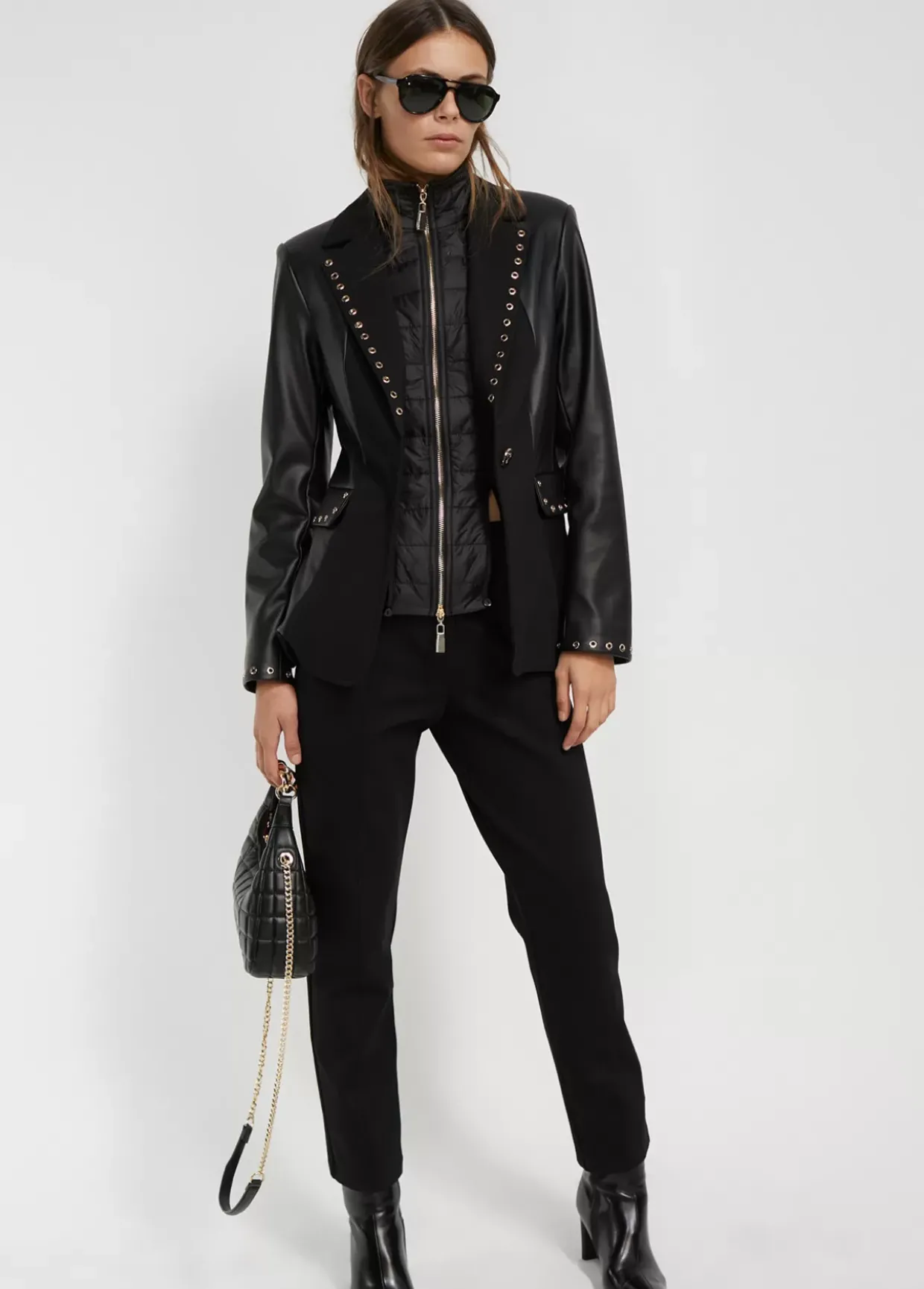 Pantalón de punto con eyelets dorados en cinturilla y bolsillos laterales. Cierre con cremallera central y ganchos metálicos interior.