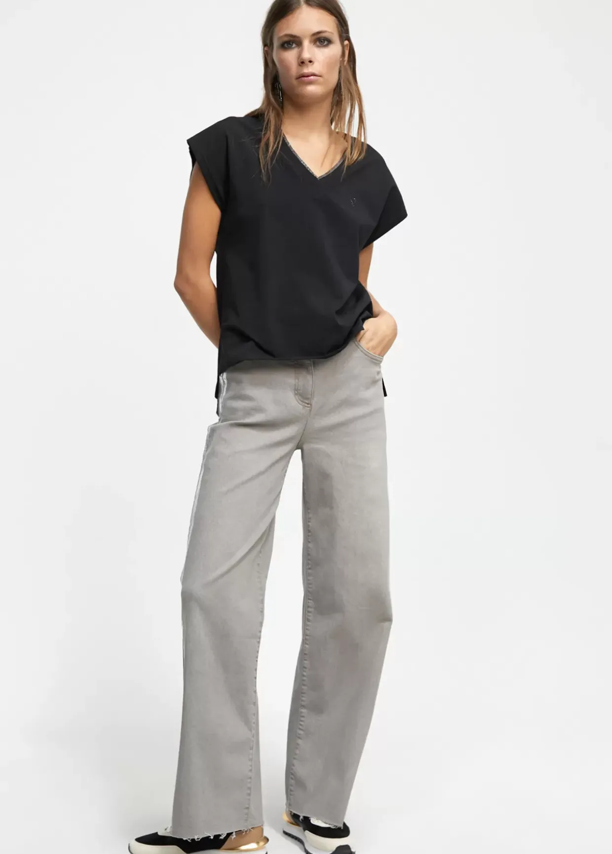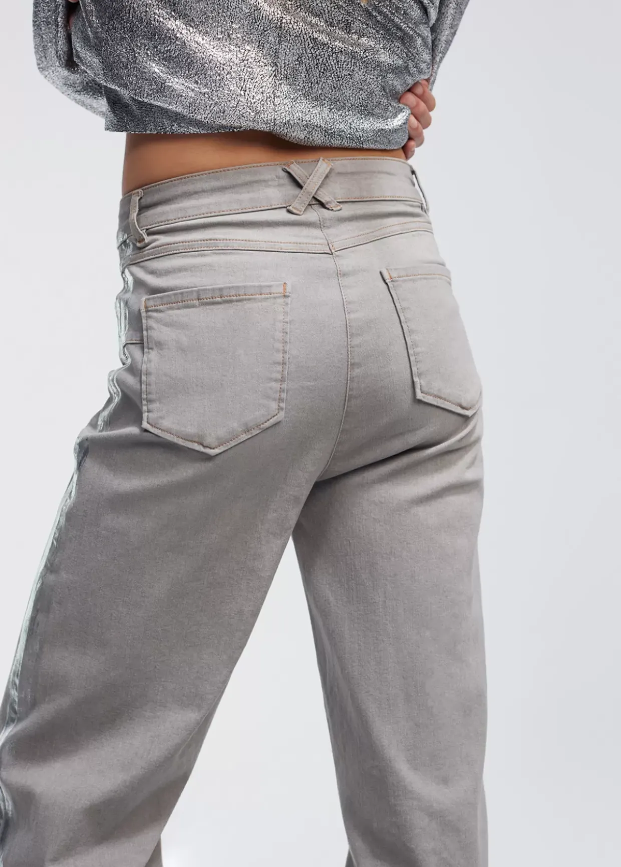 Pantalón tejano de tiro alto y pierna ancha. Cerrado con cremallera frontal. Bolsillos delanteros y traseros tipo plastrón. Detalle de banda laminada plateada en lateral perneras.