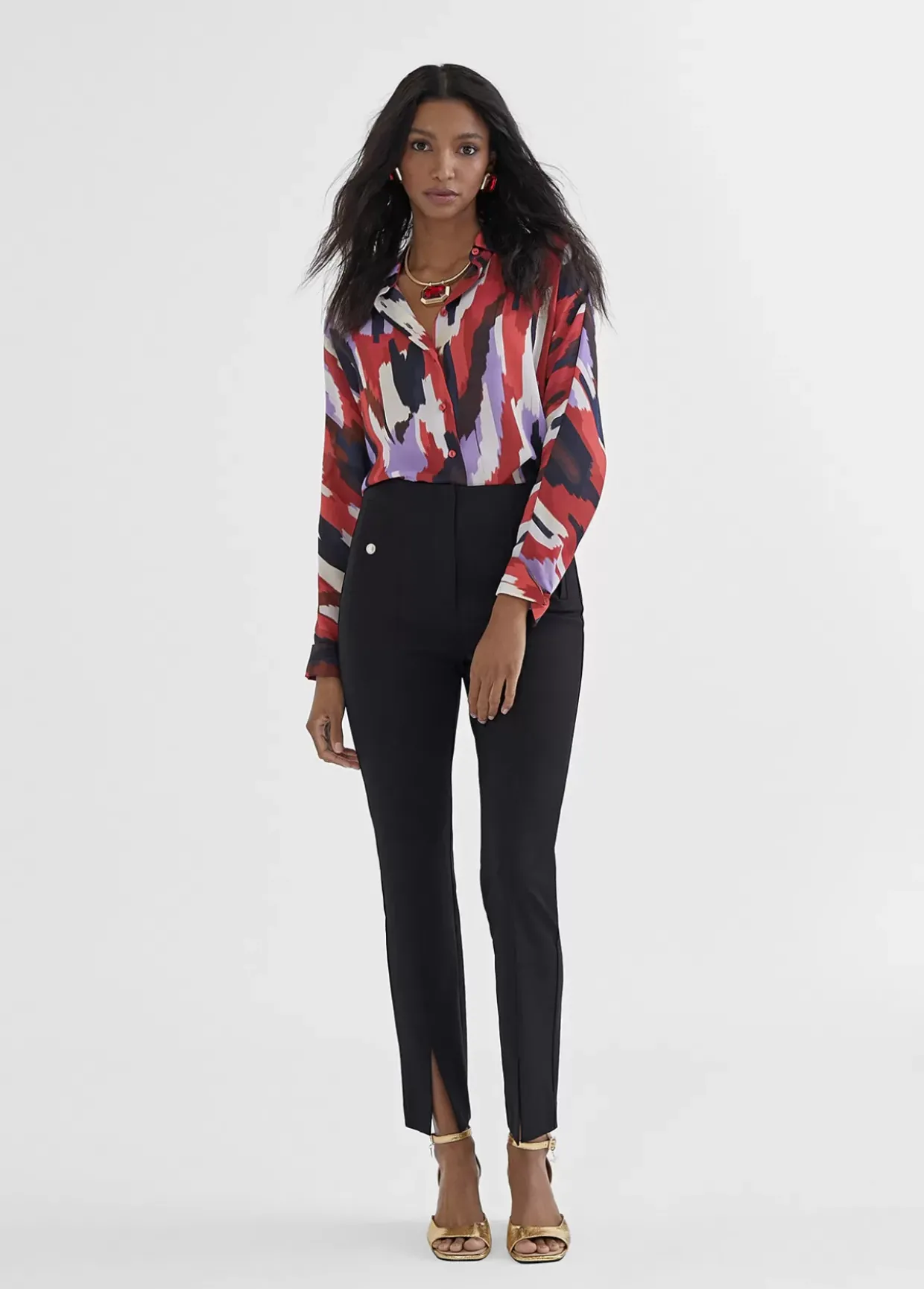 Pantalón pitillo de punto. De largo tobillero. Cierre con cremallera. Falsos bolsillos laterales con botón dorado. Aberturas frontales en bajo.