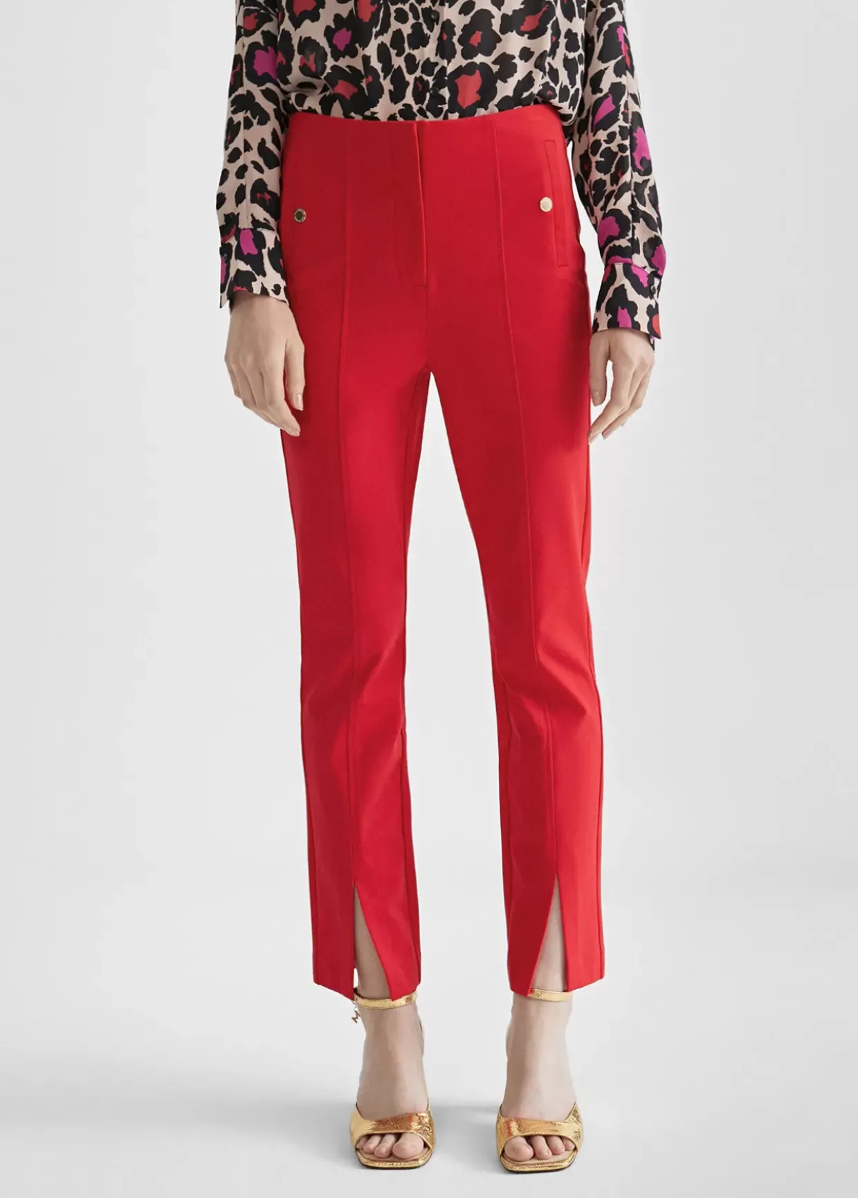 Pantalón pitillo de punto. De largo tobillero. Cierre con cremallera. Falsos bolsillos laterales con botón dorado. Aberturas frontales en bajo.