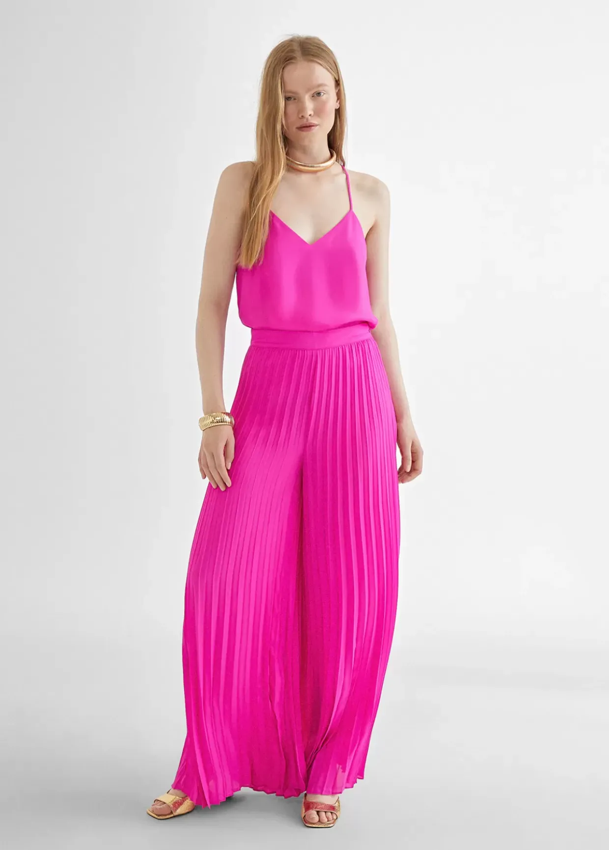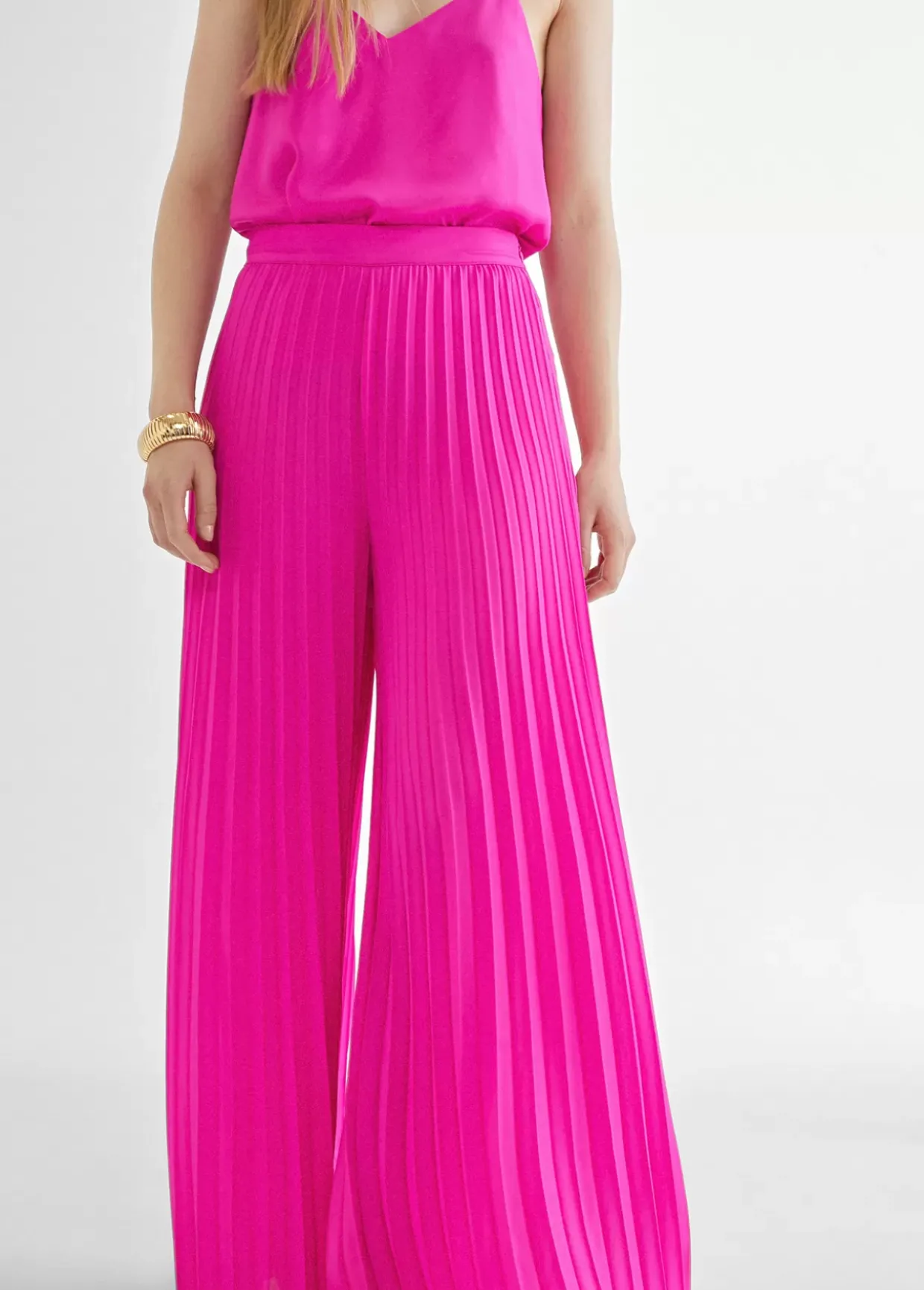 Pantalón monocolor largo y plisado. Cremallera lateral oculta.