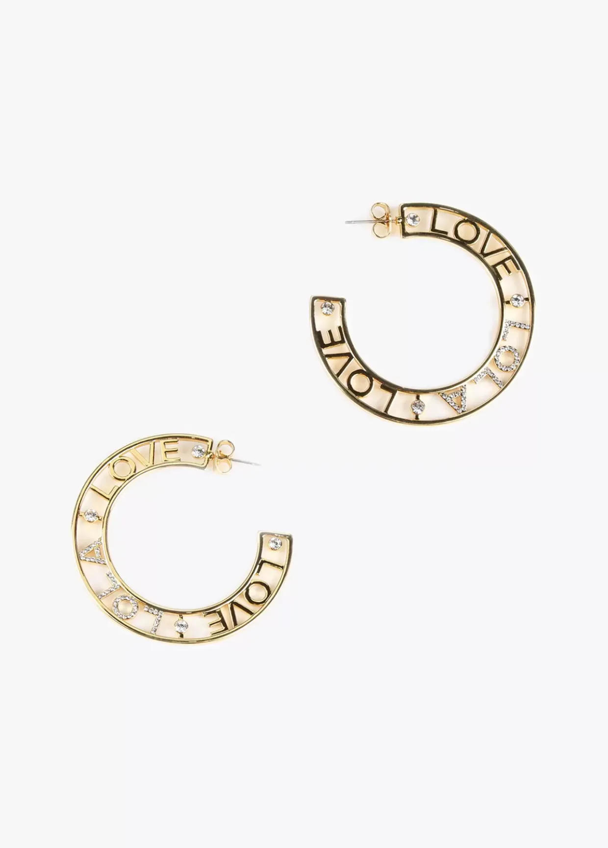 Pendientes de aro abierto y plano con letras Lola love y detalle piedras brillantes.