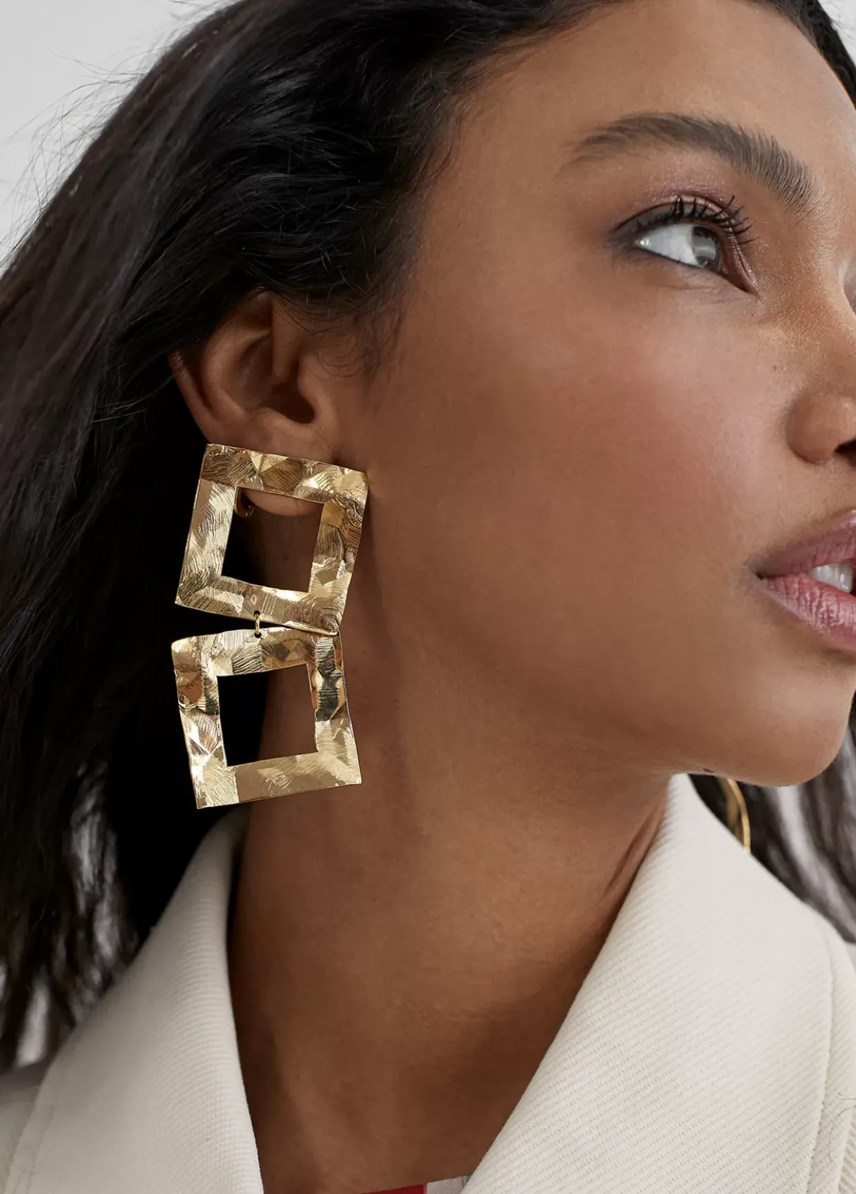 Pendientes dorados de doble cuadrado, planos y con textura rugosa y desigual.