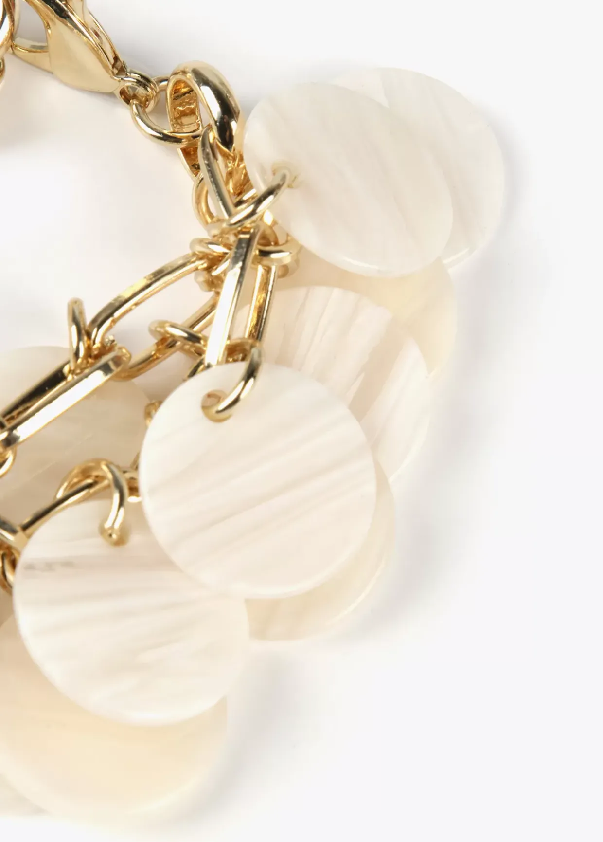 Pulsera dorada con piezas redondas nacaradas. Cierre ajustable y medallita logotipada.