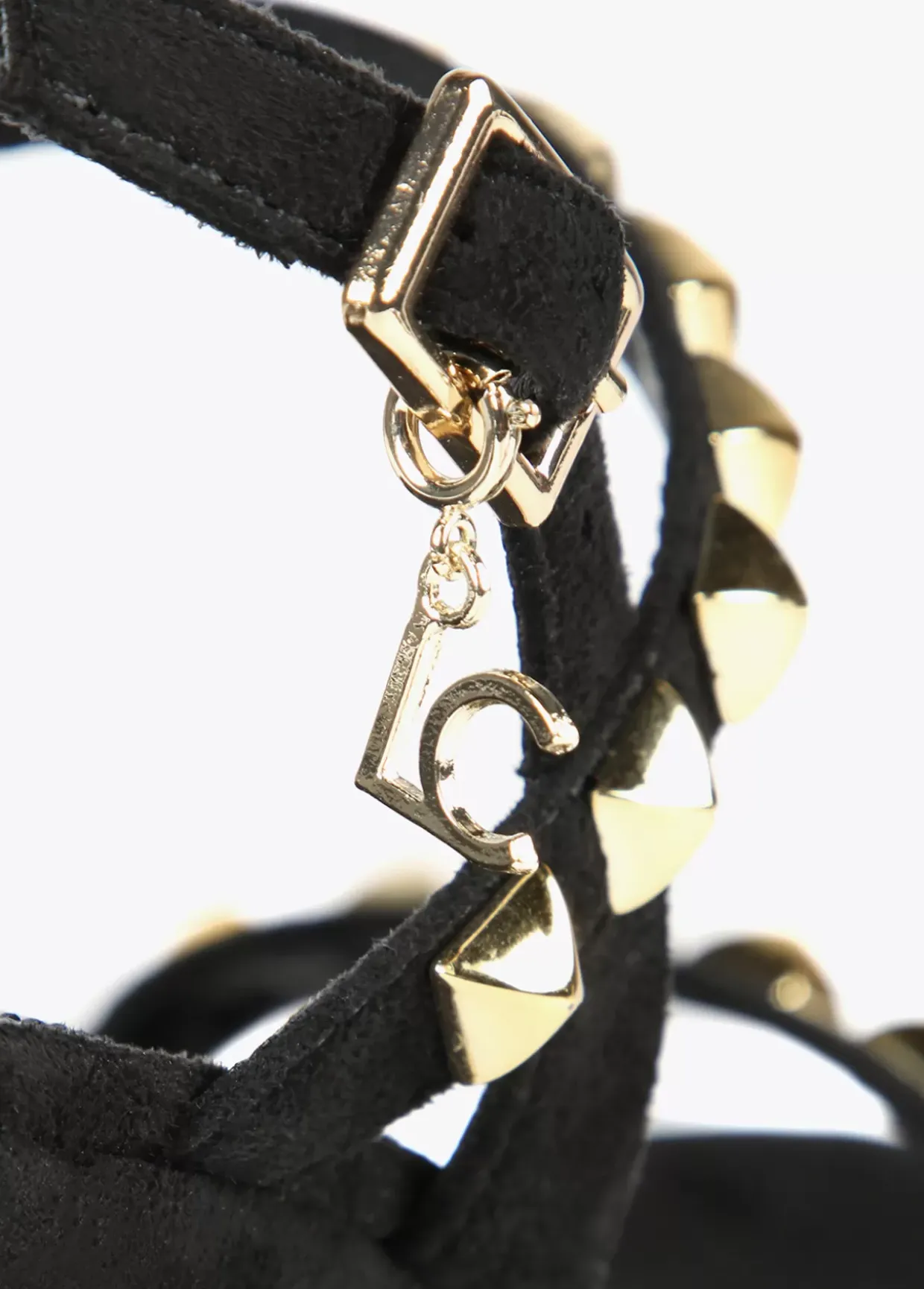 Sandalia de cuña en color negro combinada con tachas y detalles dorados. Plantilla logotipada y detalle medallita logotipo dorada en hebilla.