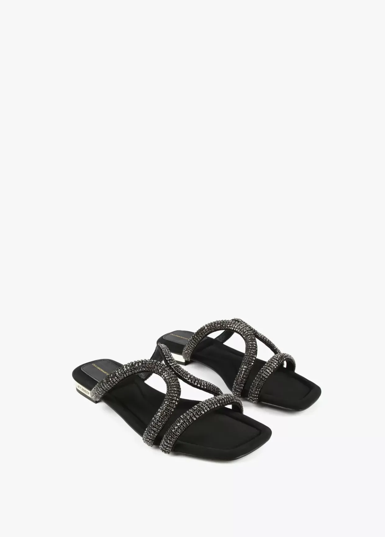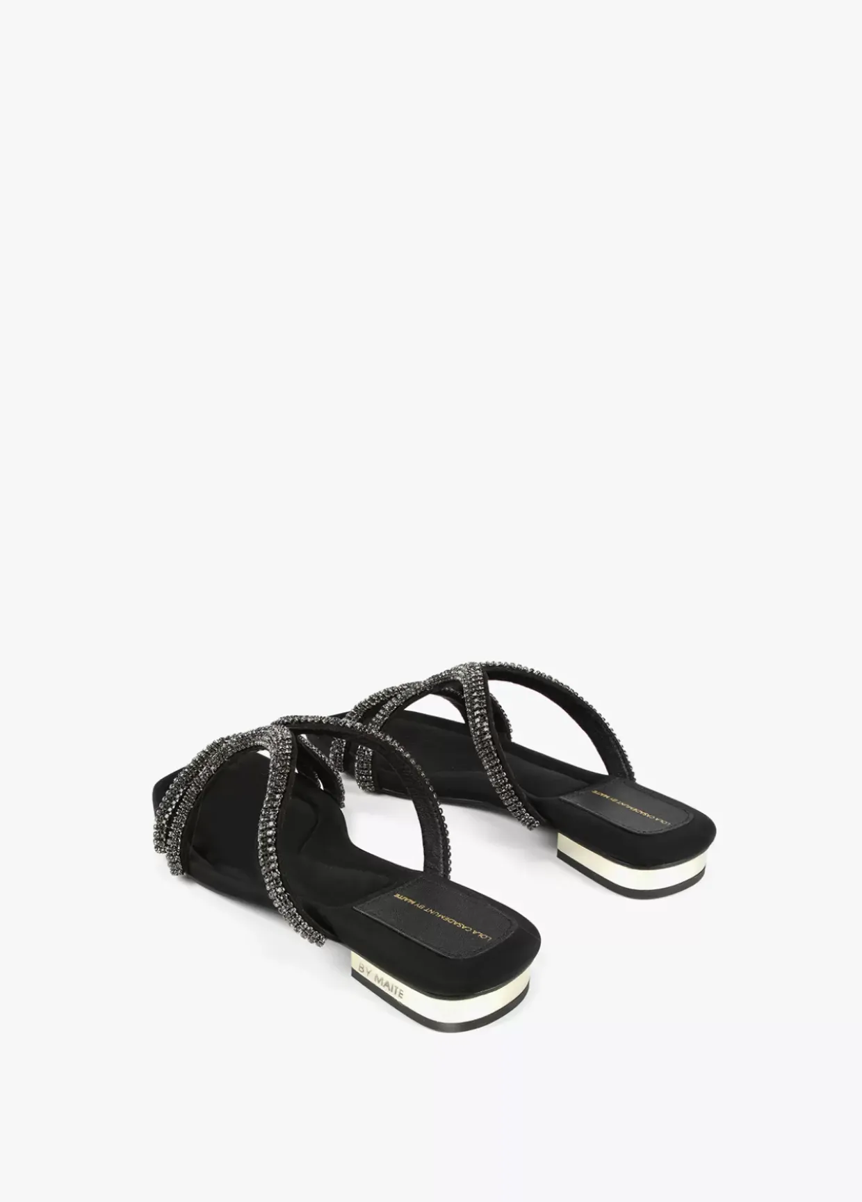 Sandalia plana con detalles en pedrería al tono y tacón dorado. Plantilla y tacón logotipado.