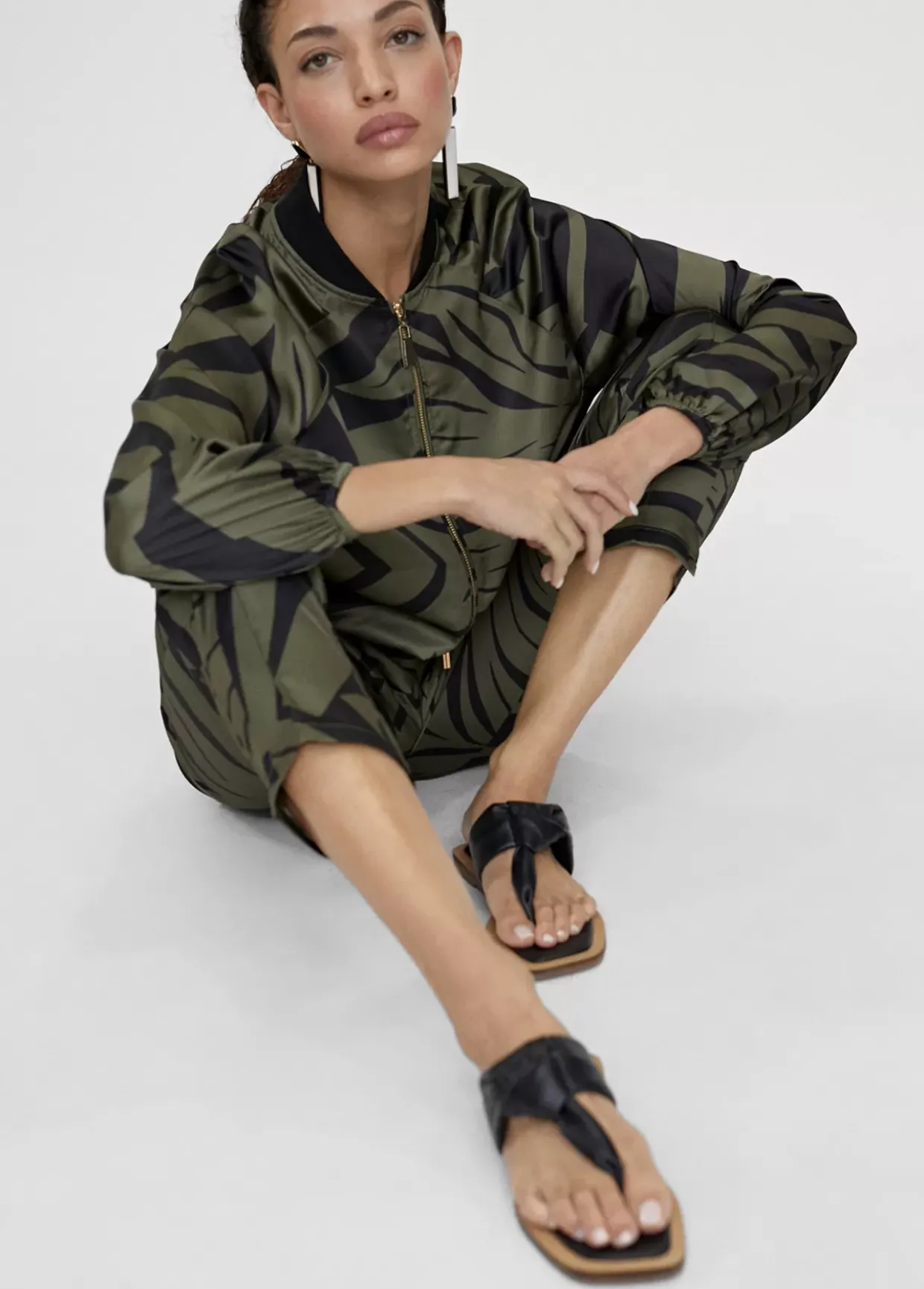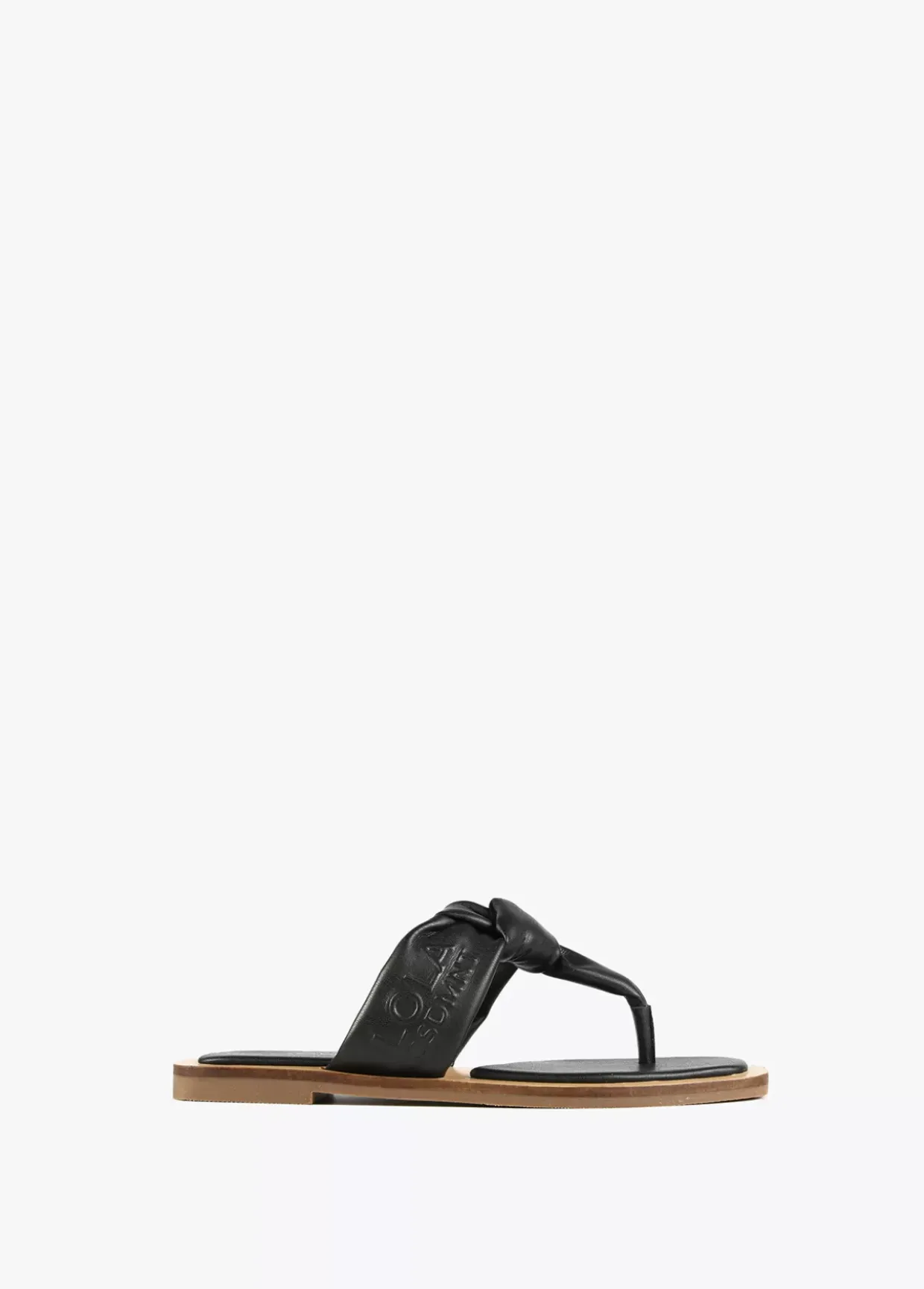 Sandalia plana de dedo en efecto piel y logo en relieve en el lateral.