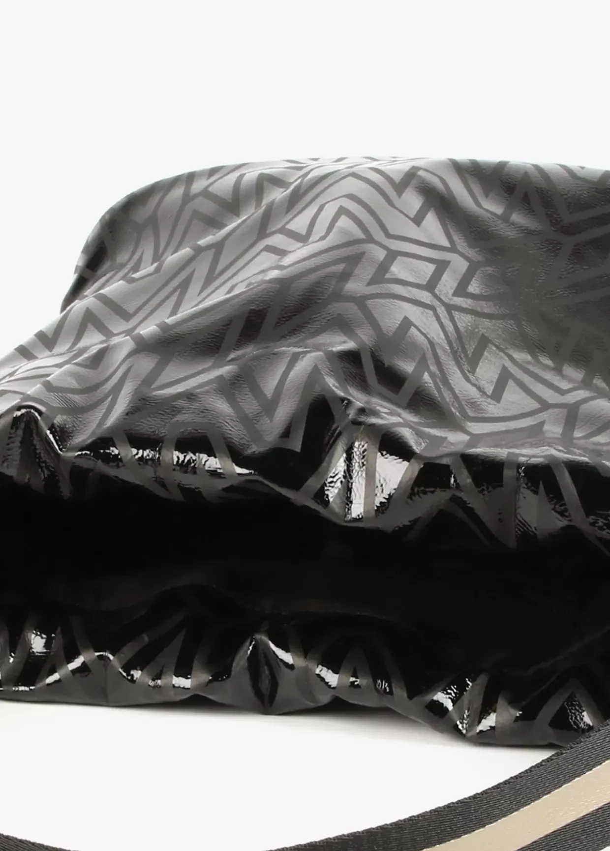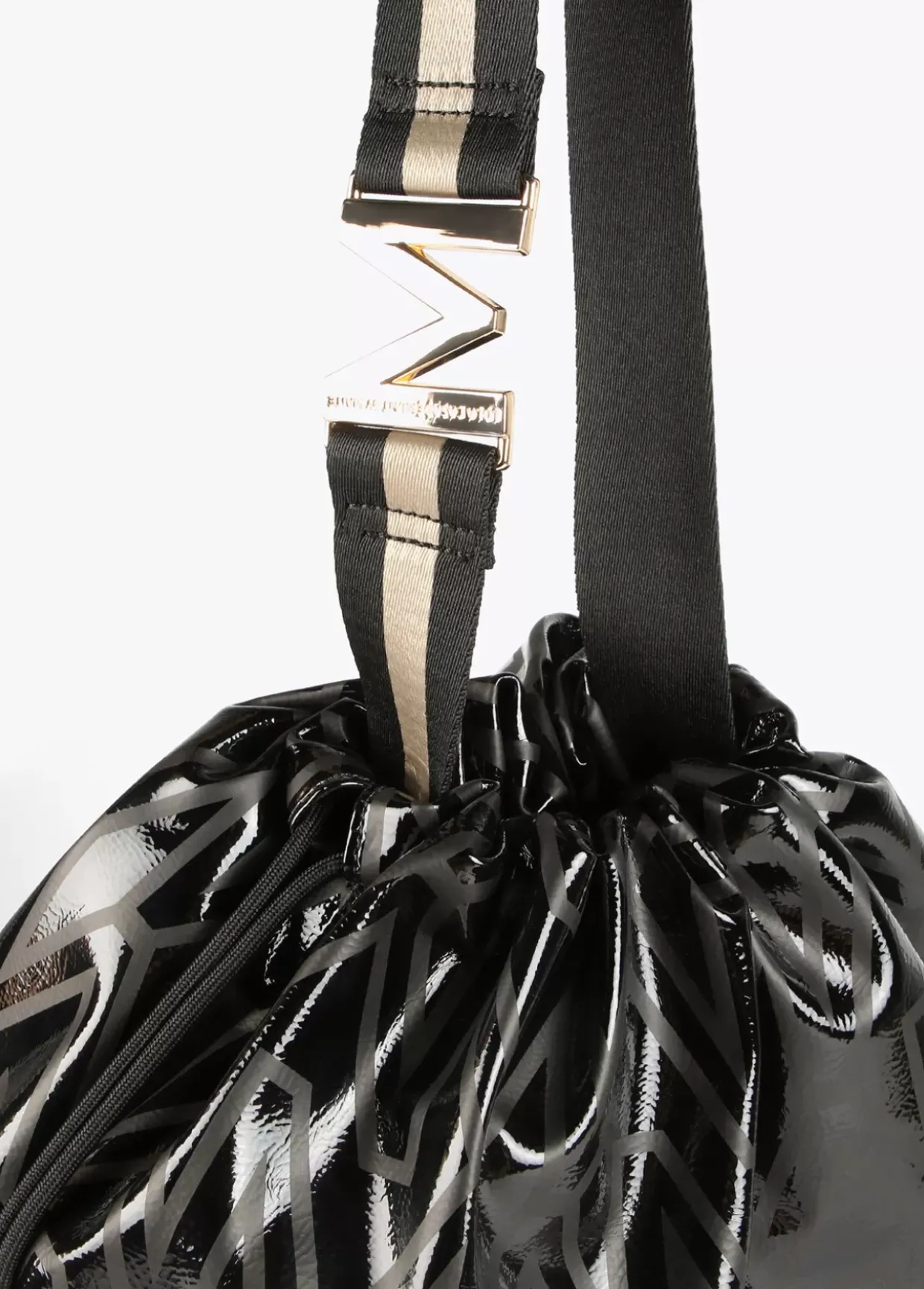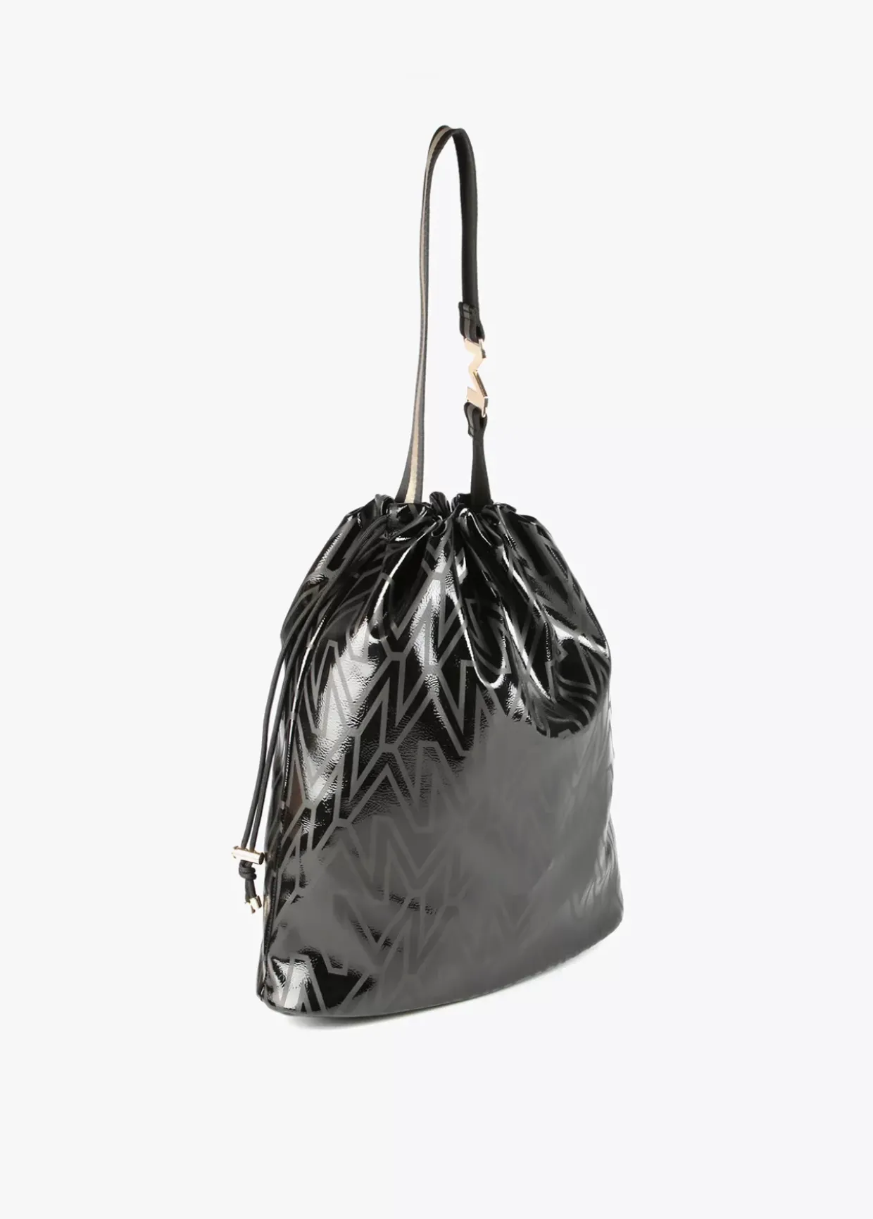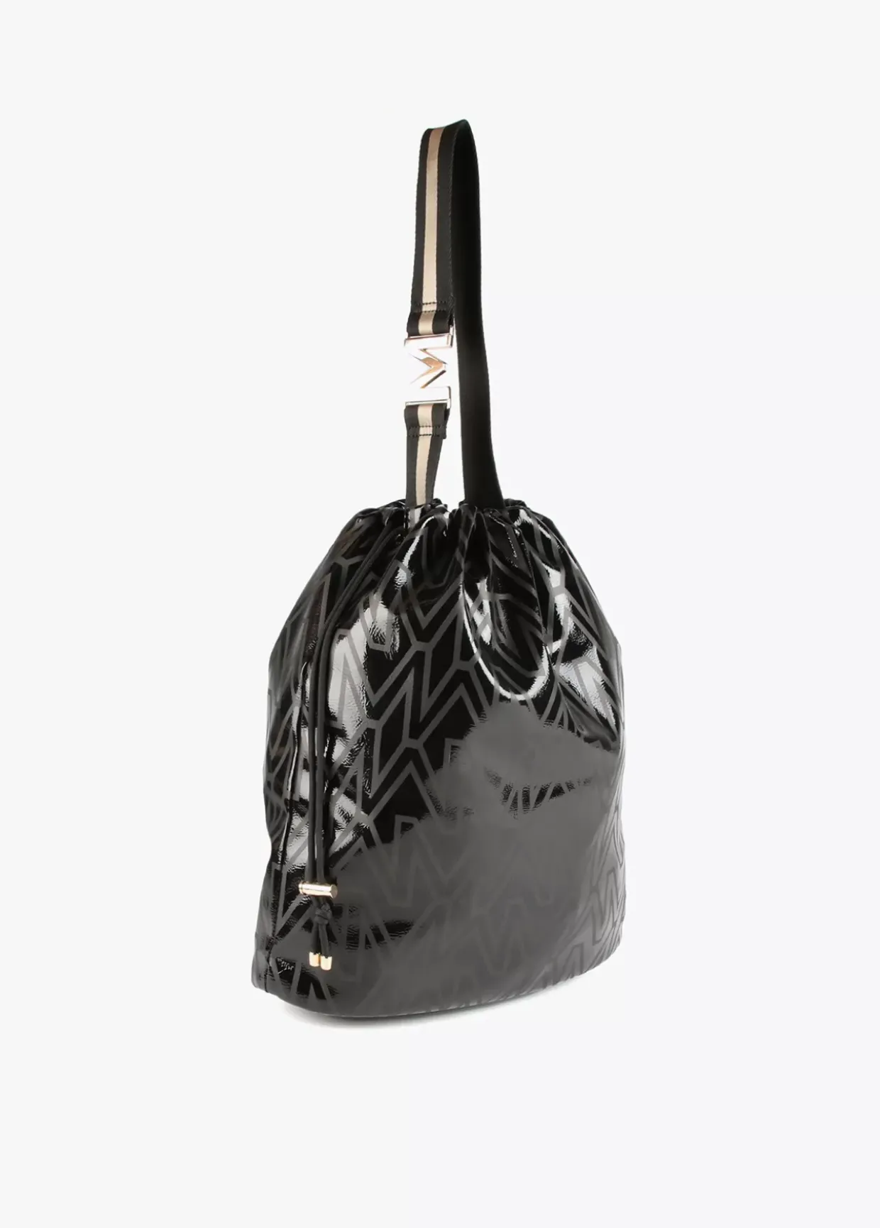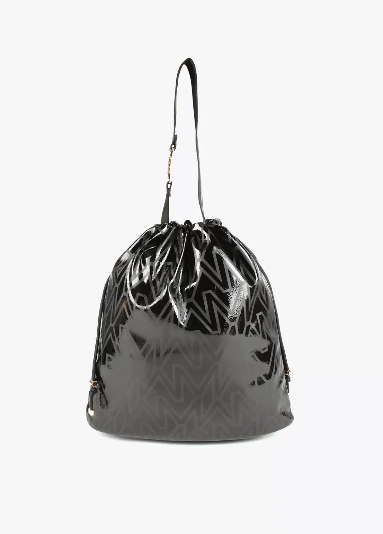Bolso shopper tipo saco con estampado monograma. Asa con letra logo dorada y cierre con cordón ajustable.