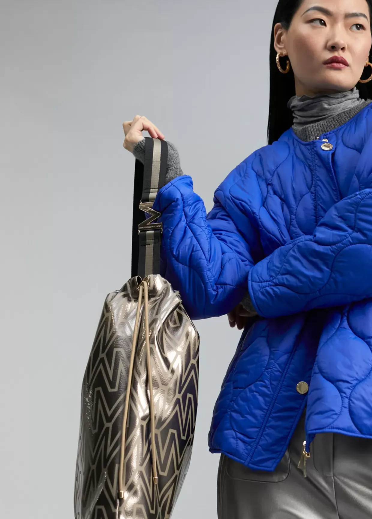 Bolso shopper tipo saco con estampado monograma. Asa con letra logo dorada y cierre con cordón ajustable.