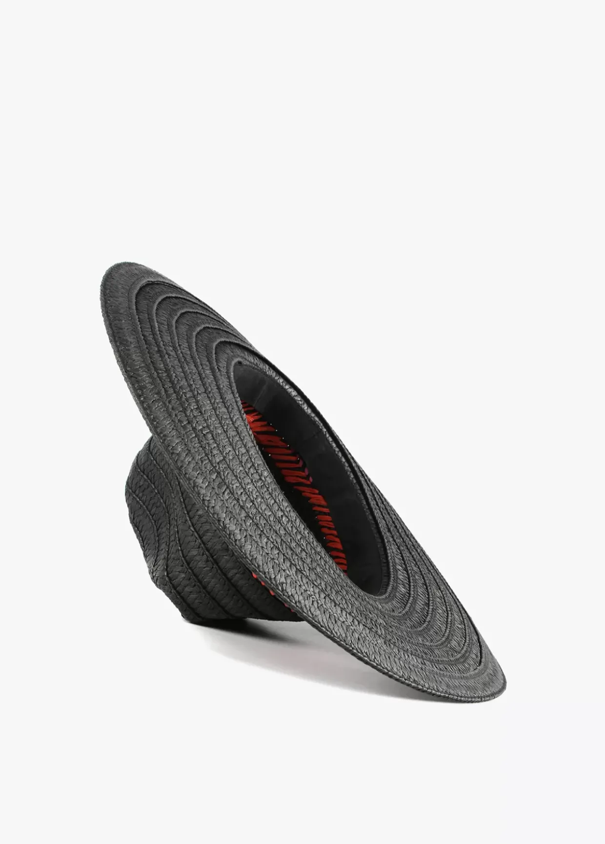 Sombrero negro con detalle bordado trenzado en colores rosa y naranja. Logo en efecto piel en la ala.