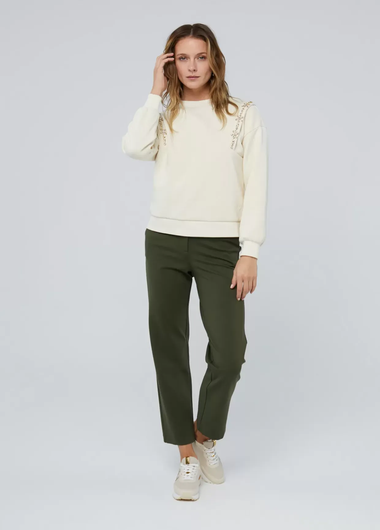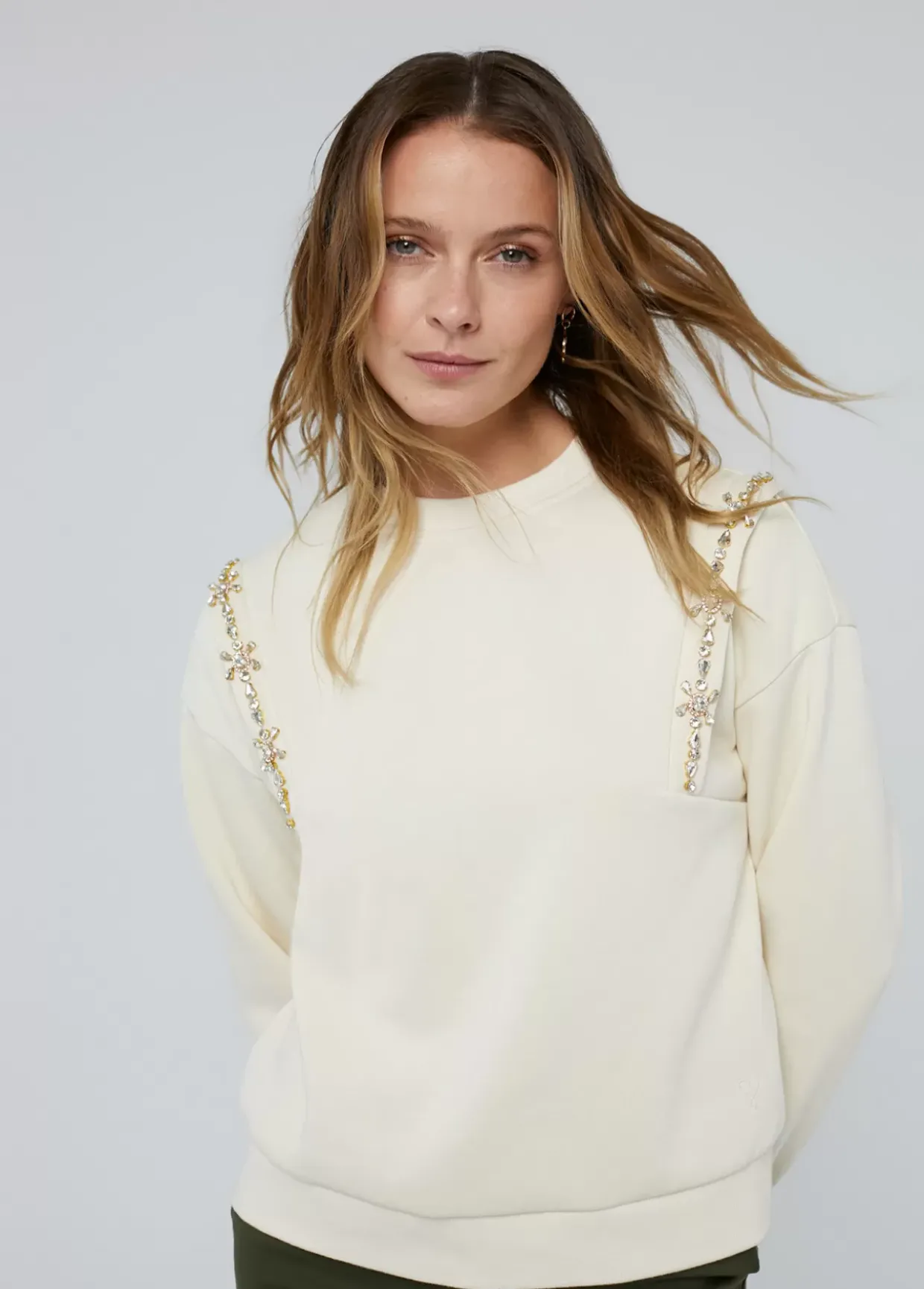Sudadera con detalle de pedrería a tono. Cuello caja y manga caída.