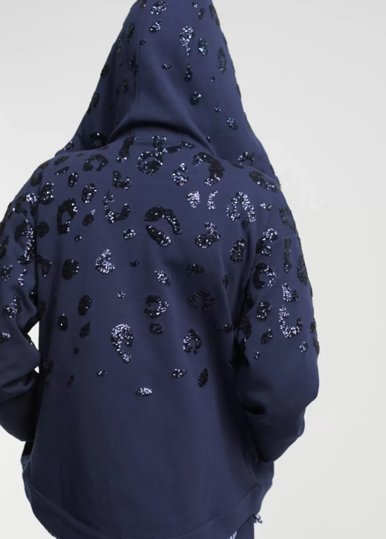 Sudadera con capucha. Detalle de lentejuela a tono en frontal y capucha. Cerrada con cremallera metálica. Bolsillos laterales.