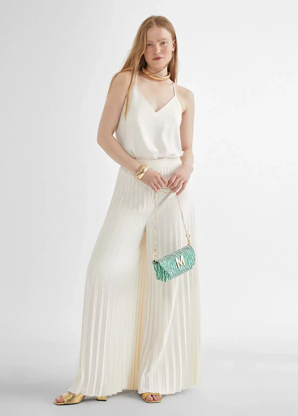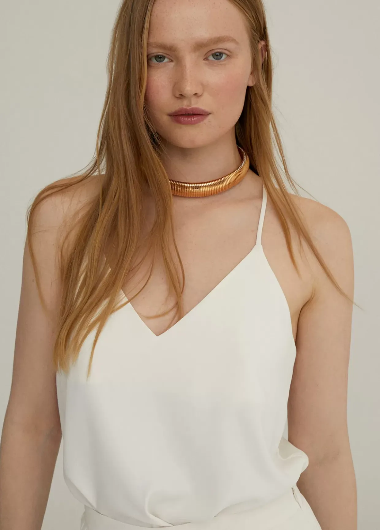 Top en escote pico y tirante fino no ajustable. Tejido fluido.