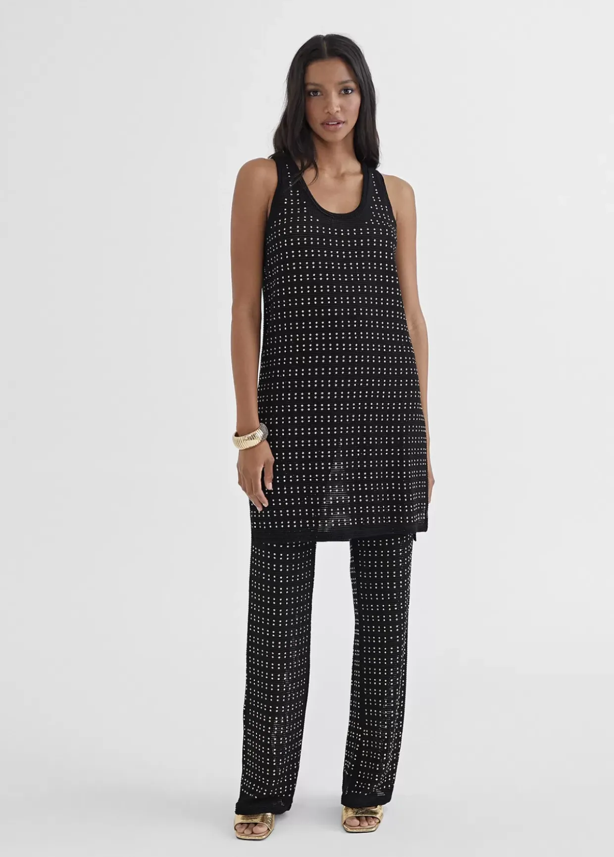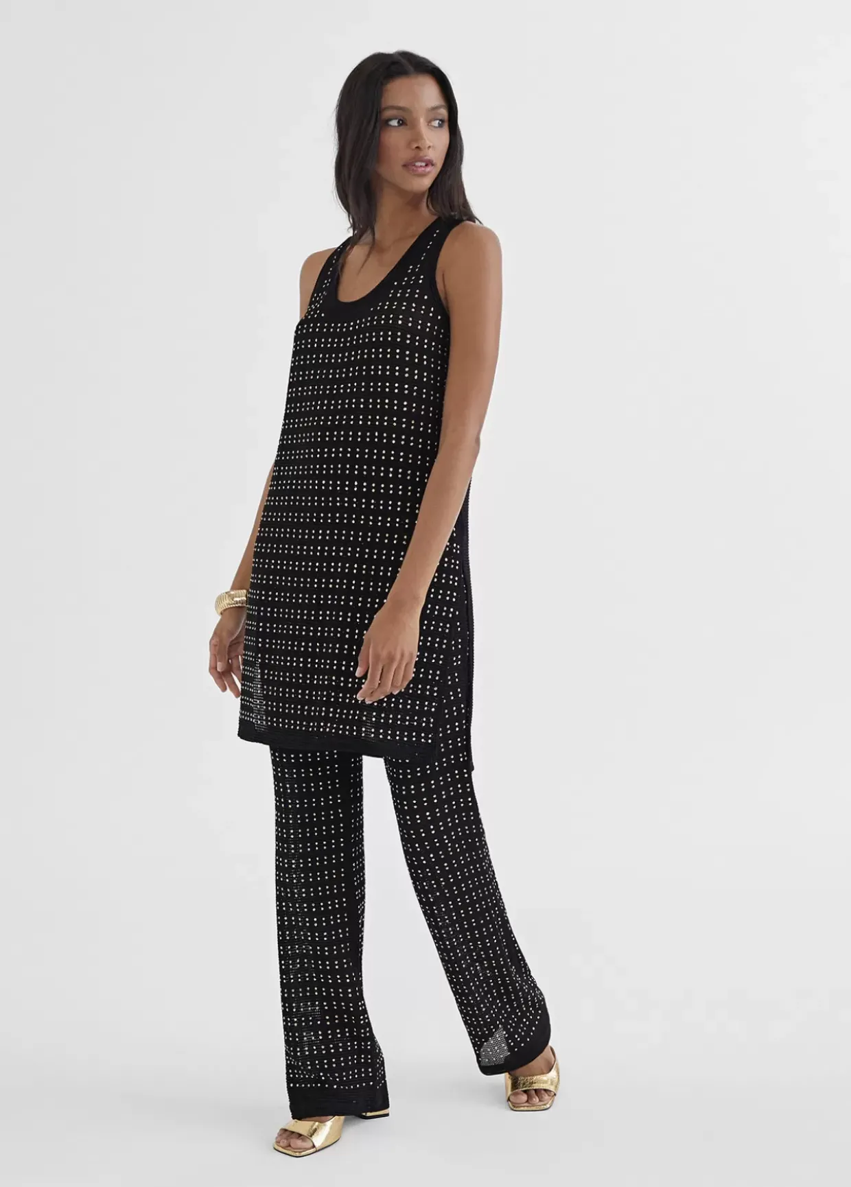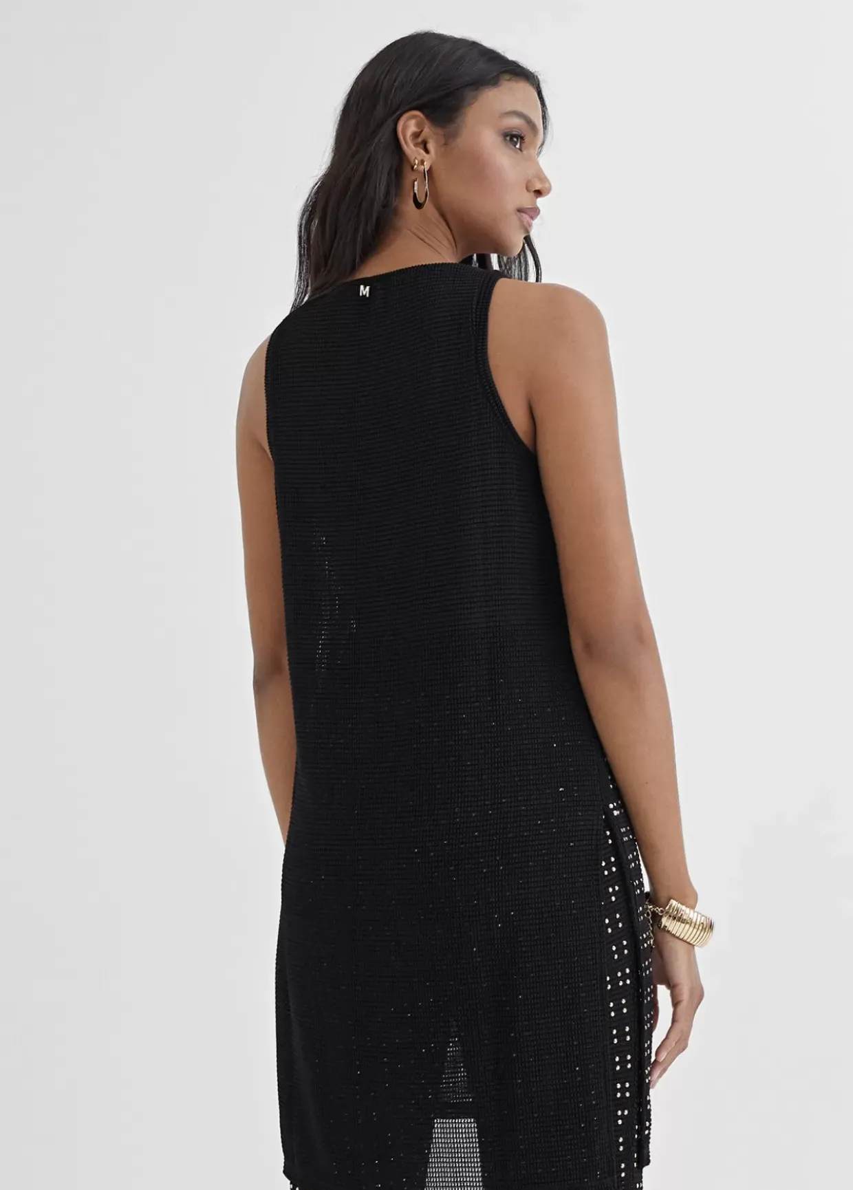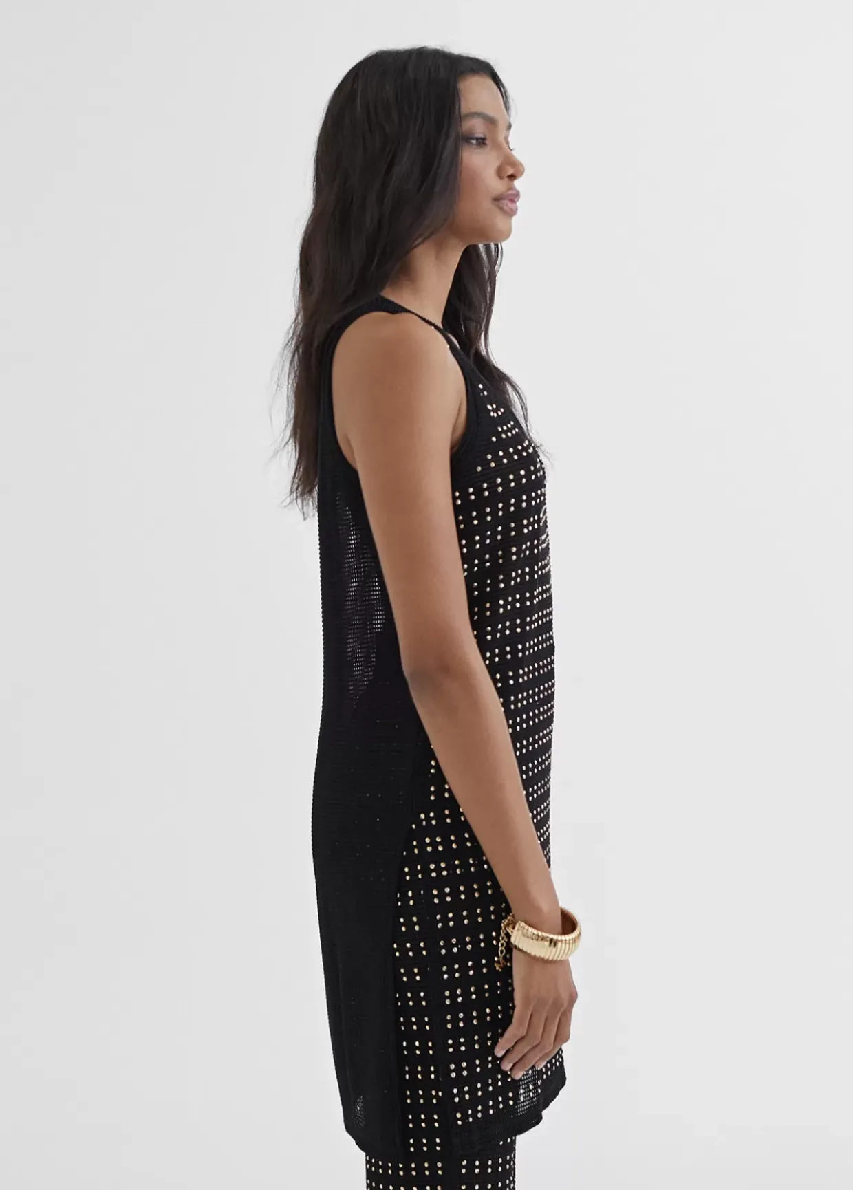 Top largo de punto con piezas metálicas en dorado. Espalda lisa y cortes laterales.