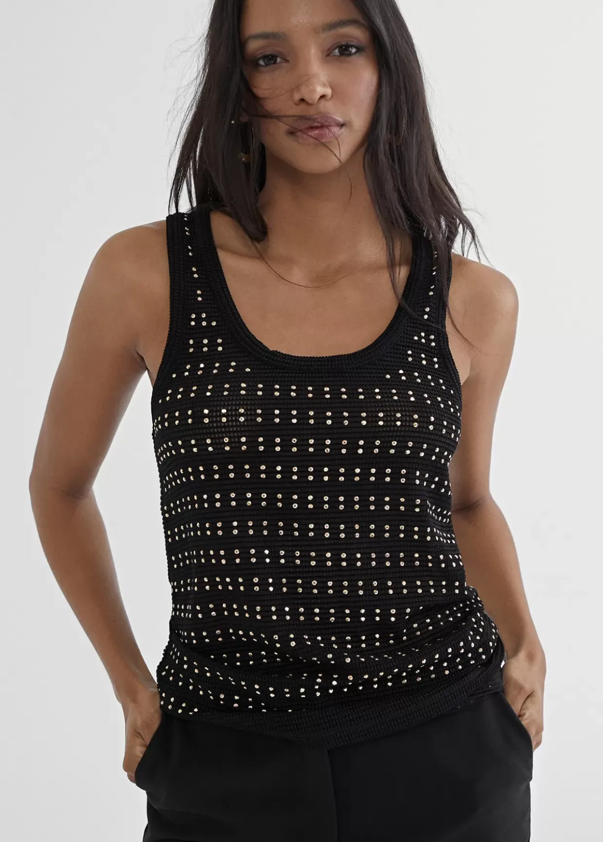 Top semi transparente en color negro y detalles brillantes en parte delantera. Logotipo dorado en parte trasera.
