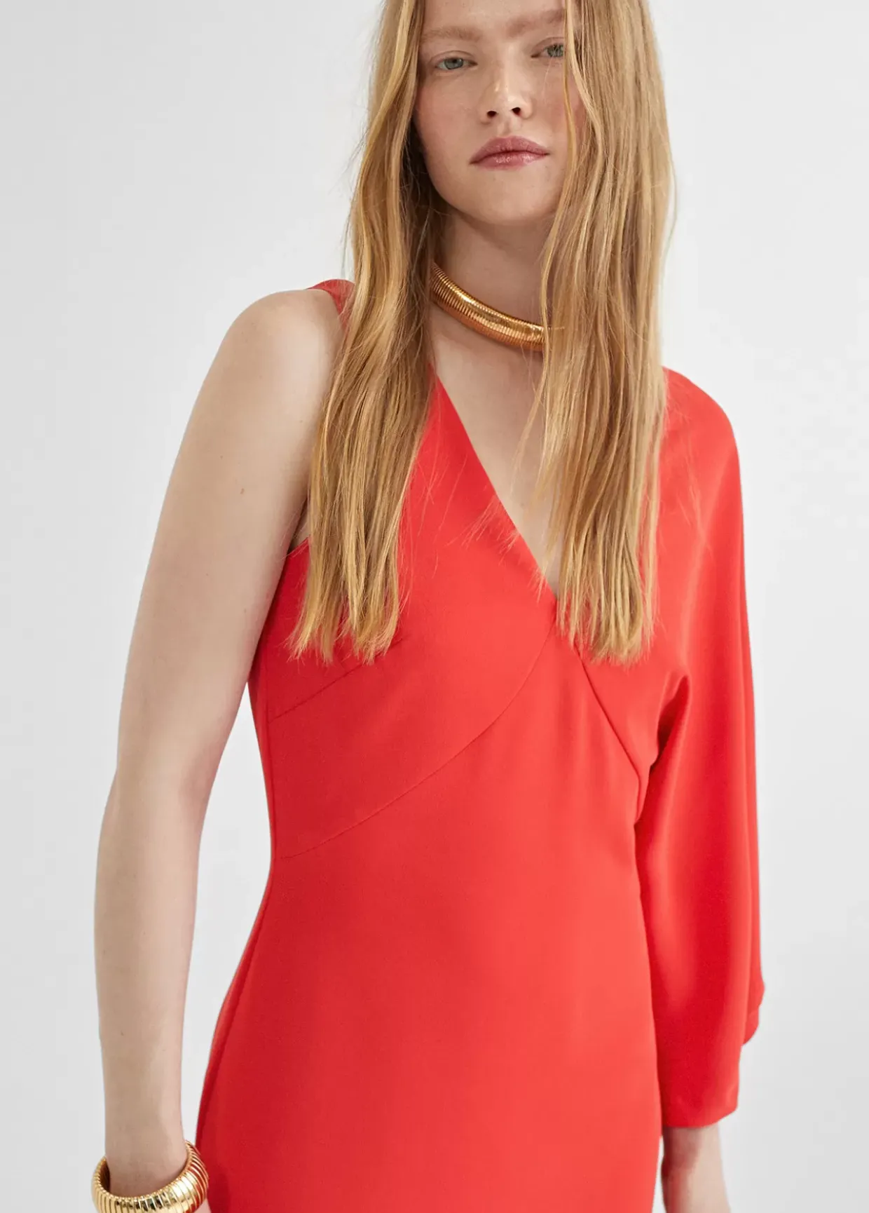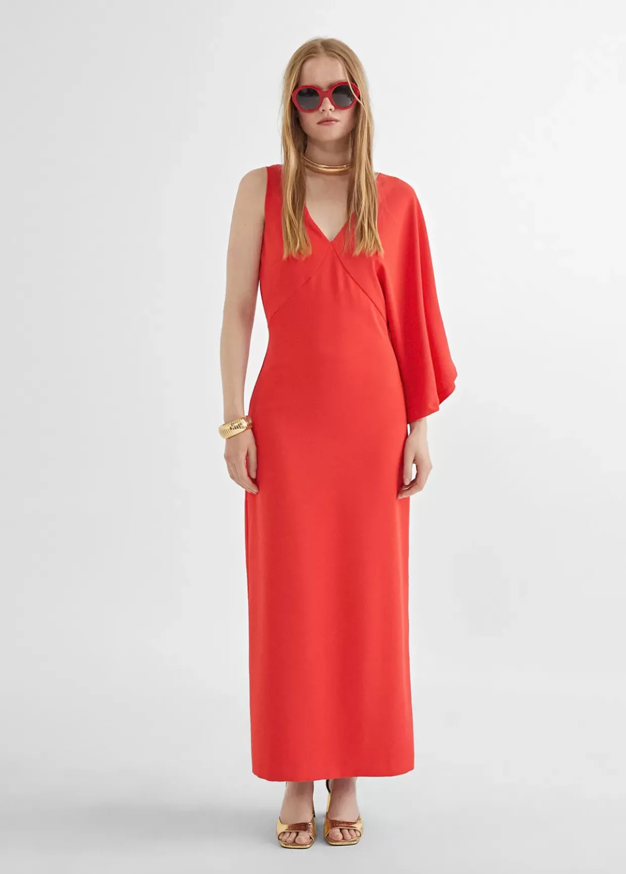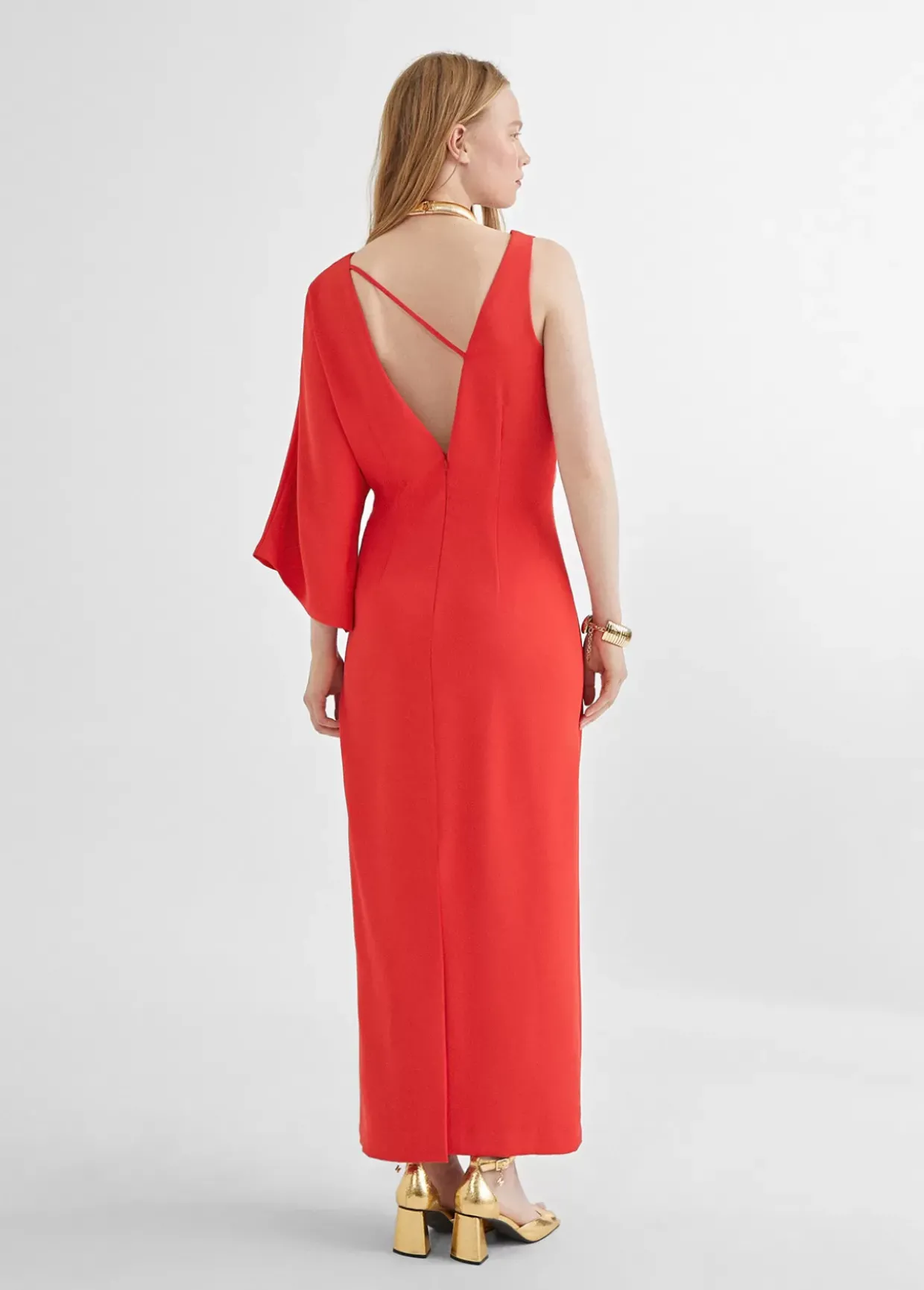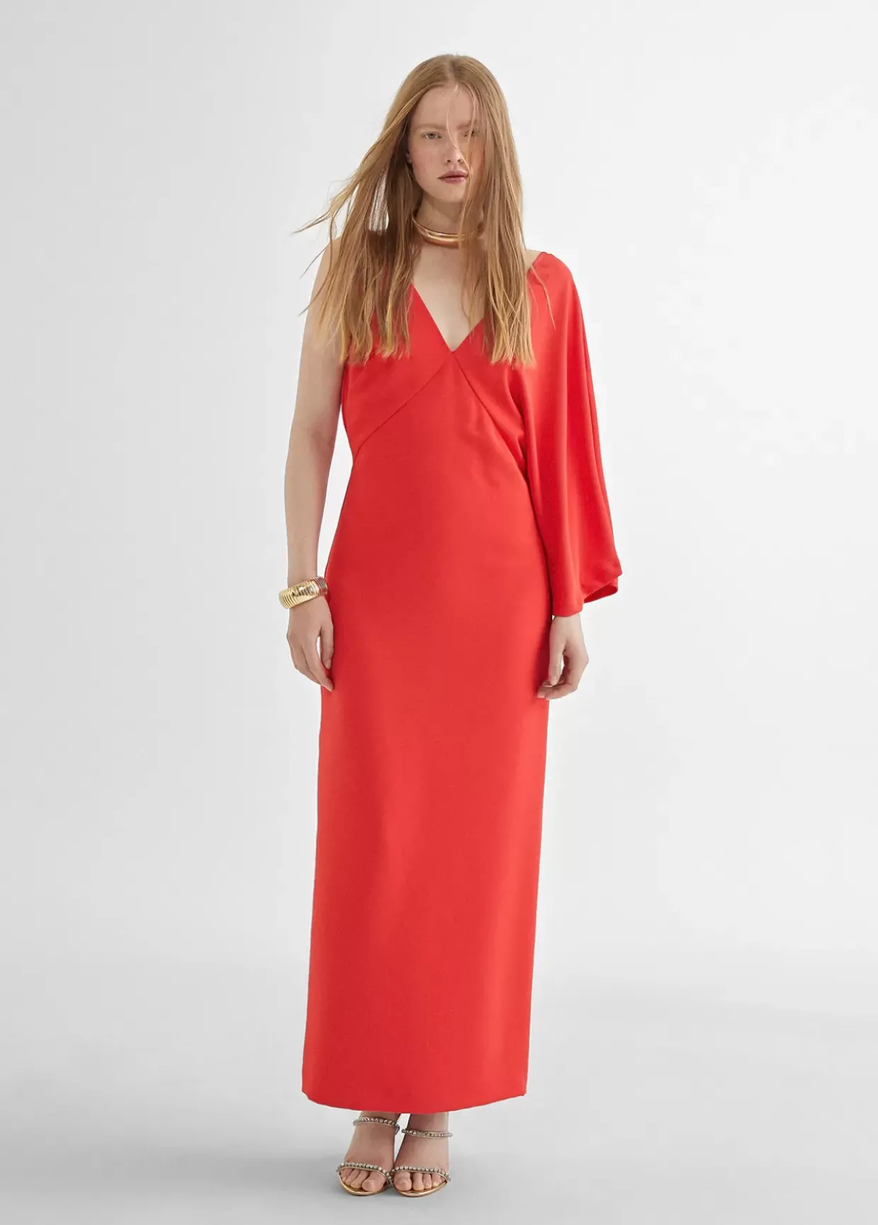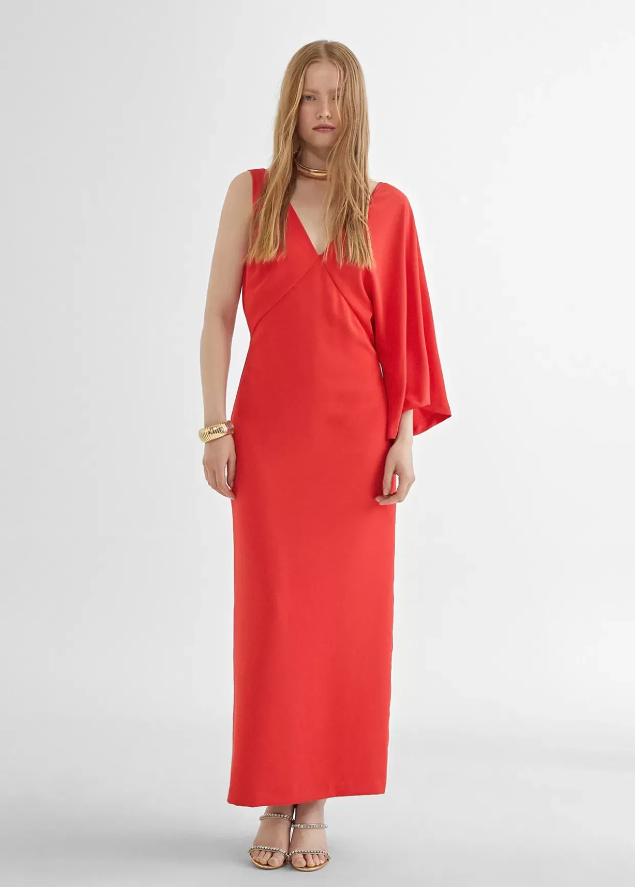 Vestido rojo con manga larga asimétrica, cuello pico y largo tobillero.