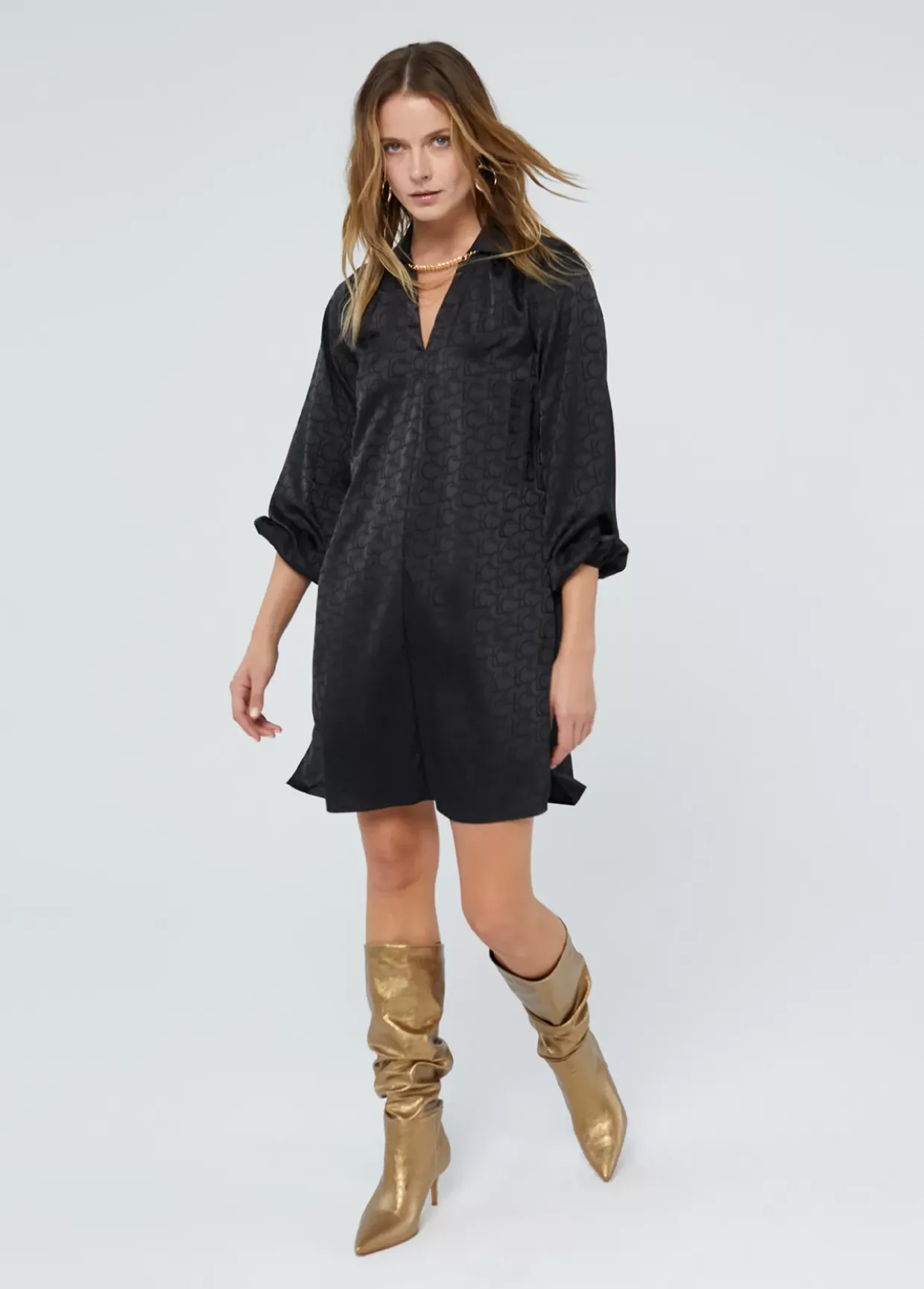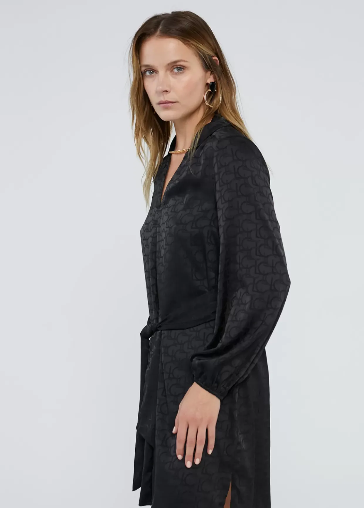Vestido corto con tejido logotipado a tono. Cuello pico, bolsillos laterales y lazada en cintura. Puños camiseros con botón dorado.