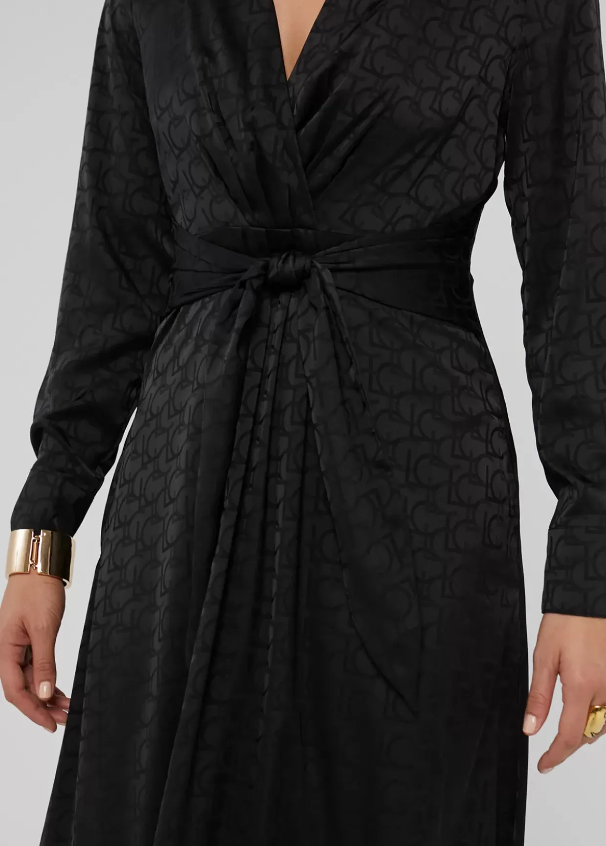 Vestido de largo midi. Tejido estampado logotipado a tono. Escote pico con lazada en cintura. Puños con detalle botón dorado.