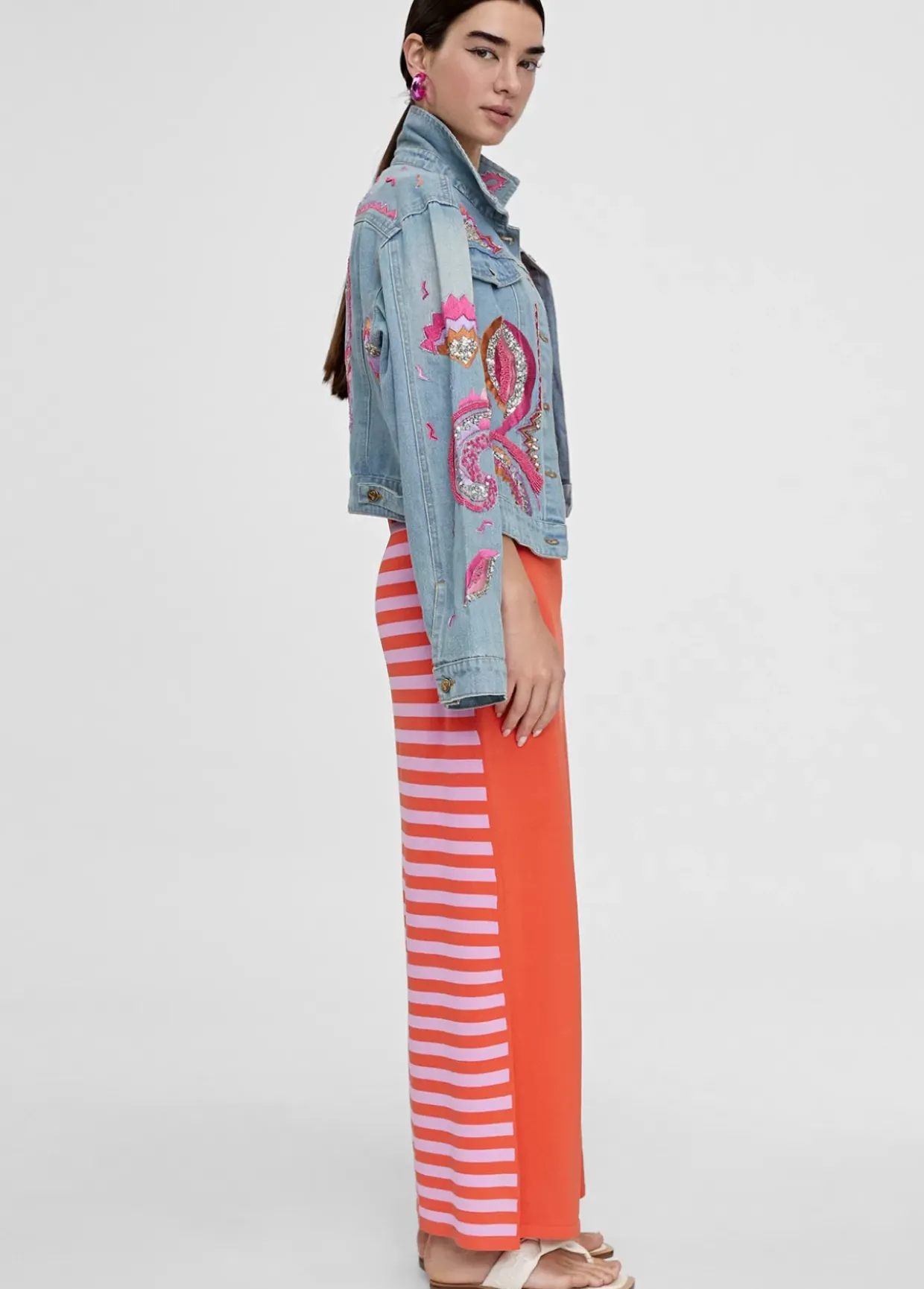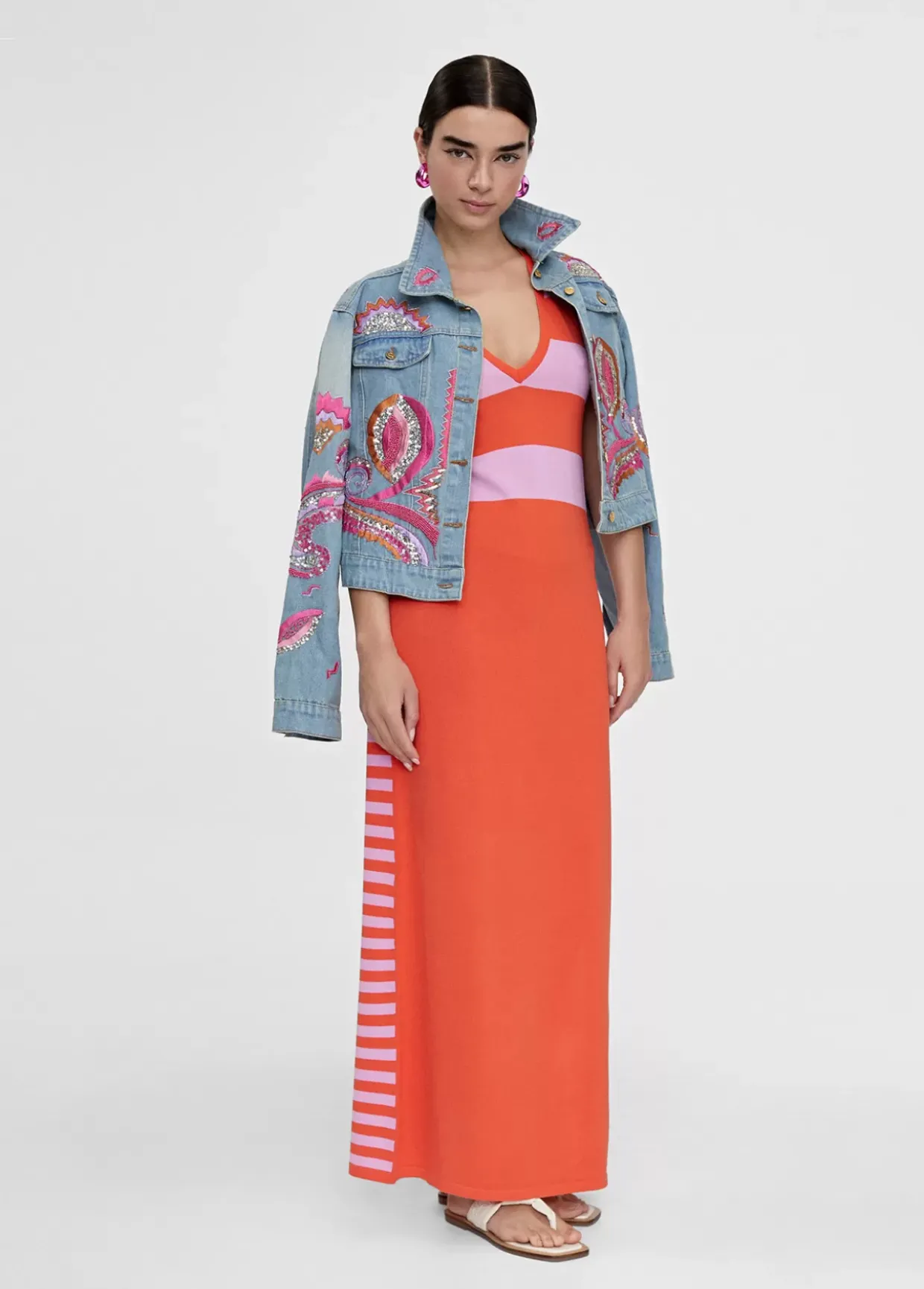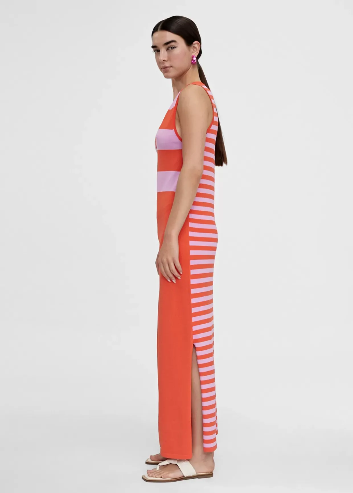 Vestido largo de punto. Rayas anchas bicolor en frontal cuerpo. Falda lisa. Escote pico y manga sisa. Aberturas laterales y espalda en rayas estrechas bicolor.
