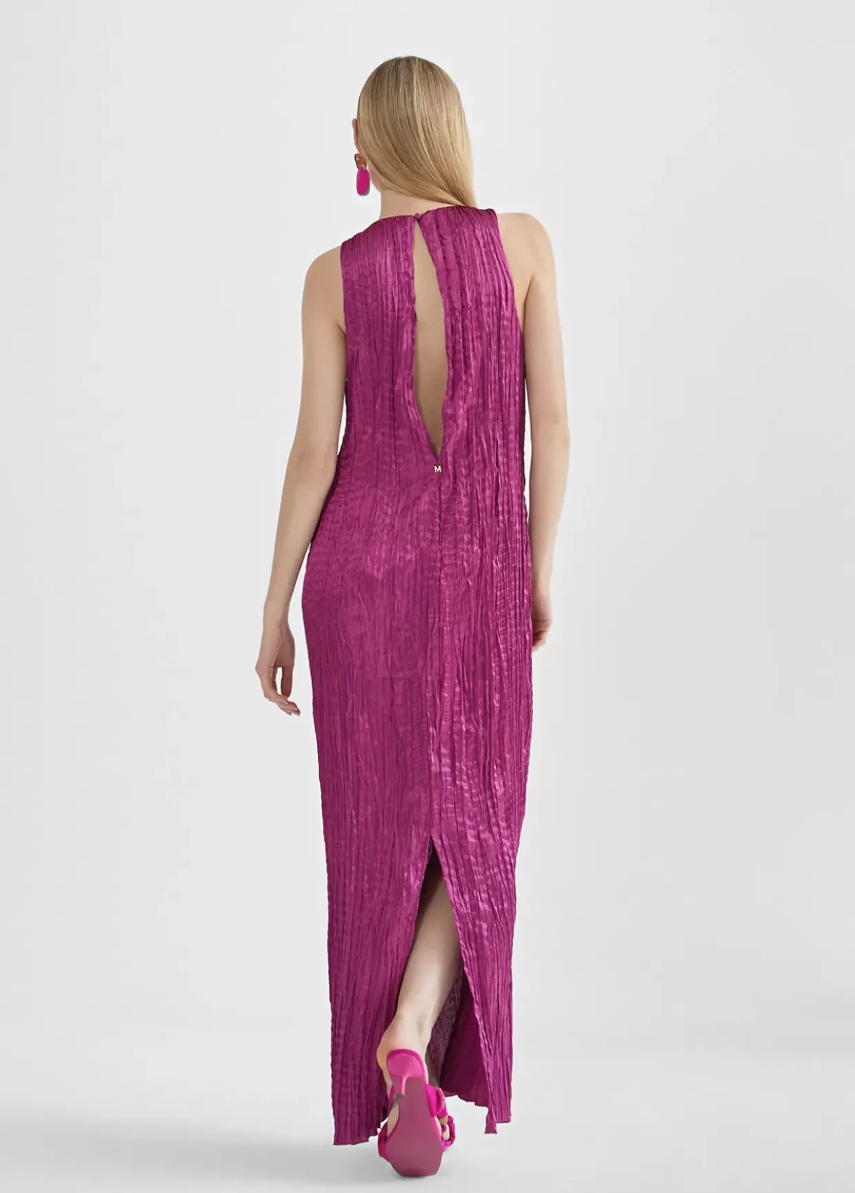 Vestido mono color, largo de cuello caja y sin mangas. Tejido satinado efecto arrugado Abertura en espalda.