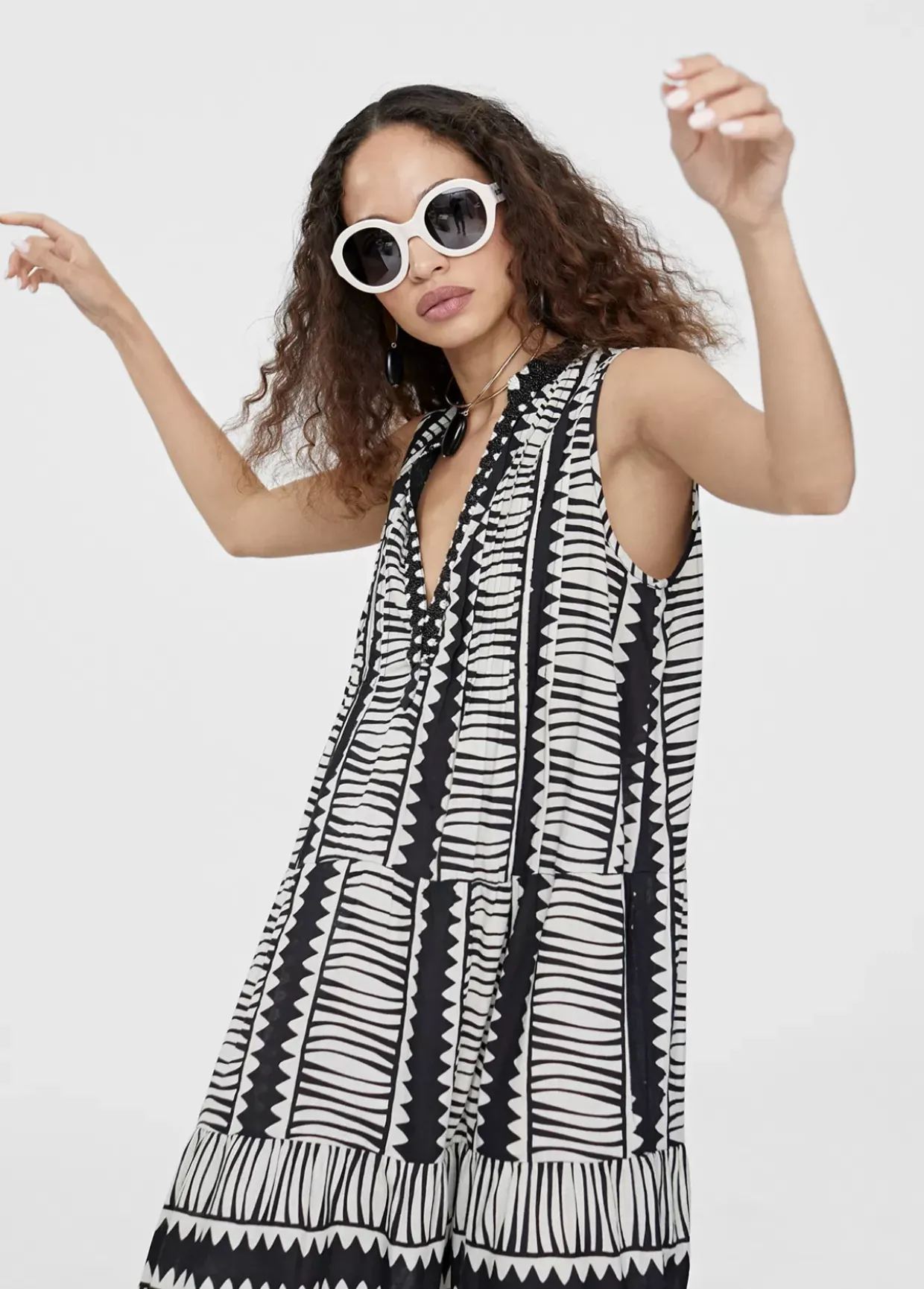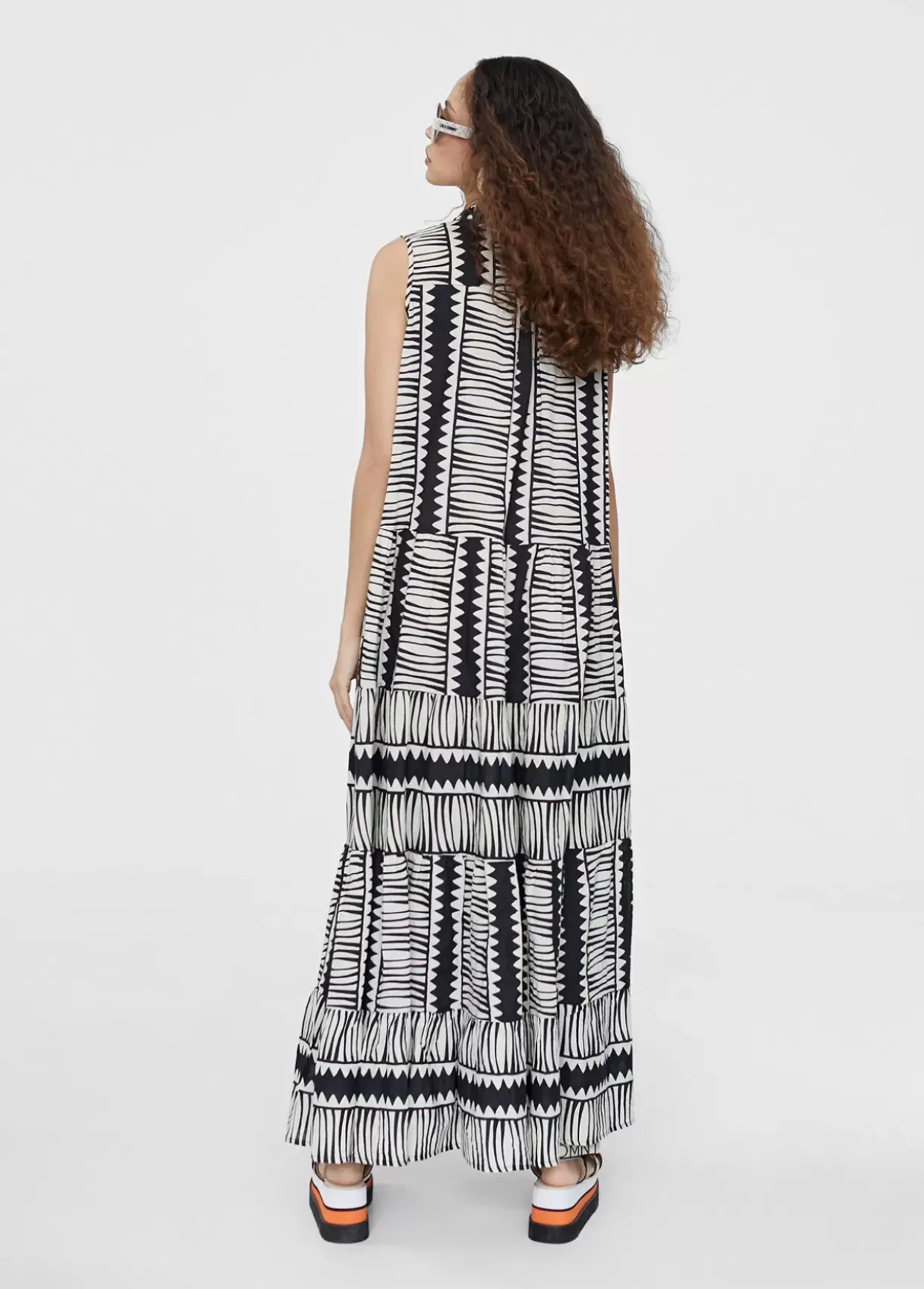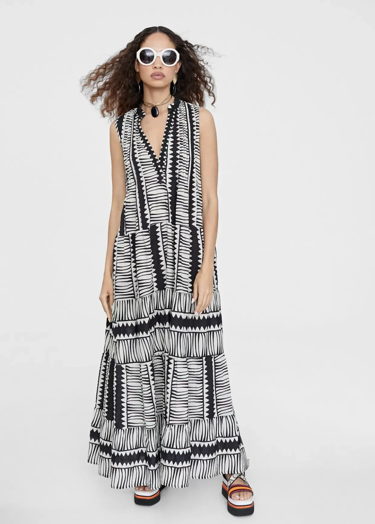 Vestido largo en estampado étnico bicolor. Cuello mao, escote pico con bordado y manga sisa. Bajo con volantes.