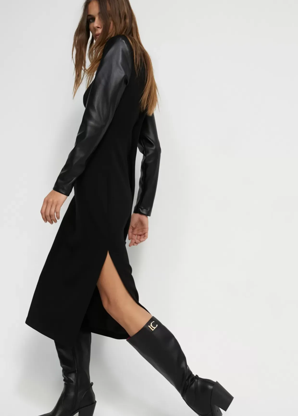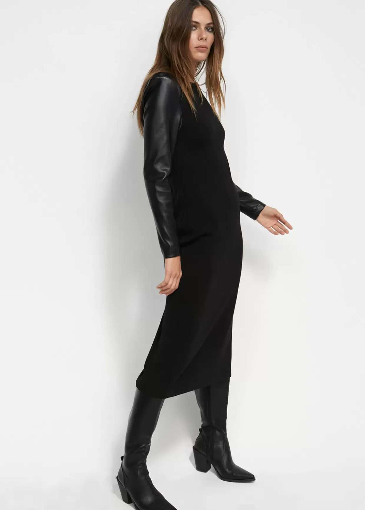 Vestido midi de punto roma. Cuello caja, hombreras y mangas en efecto piel. Abertura lateral en bajo.