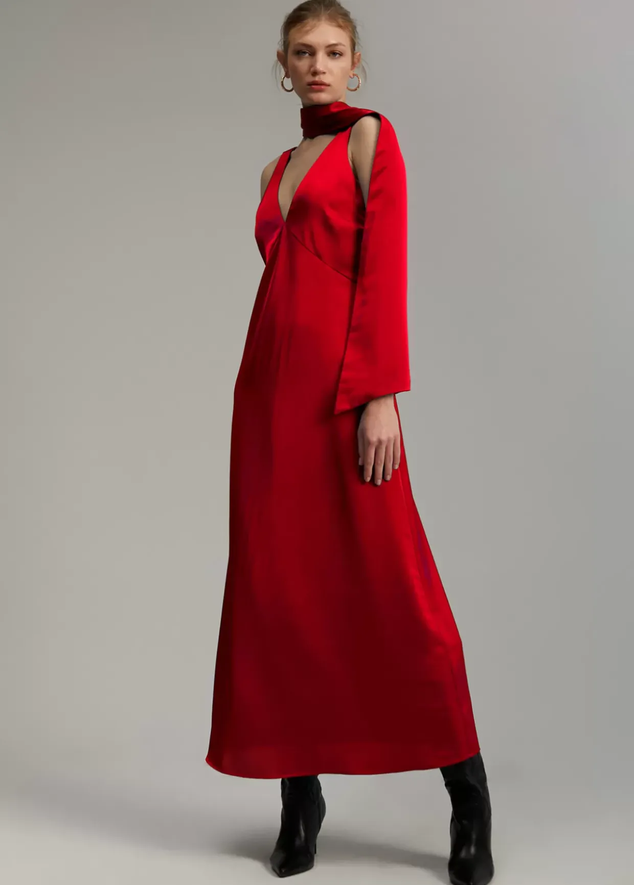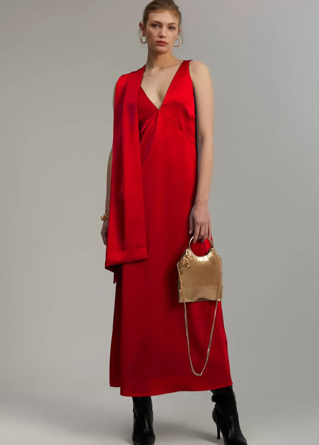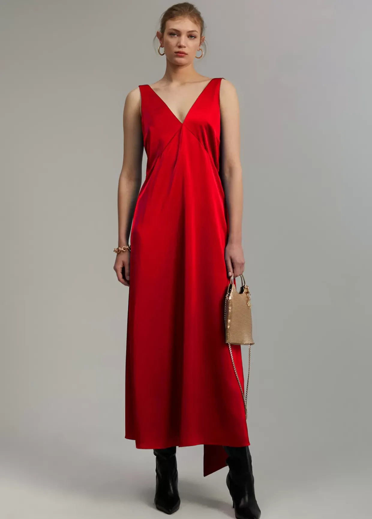 Vestido sin mangas, de largo midi efecto satén. Escote pico en frontal y espalda. Tirante efecto chal.