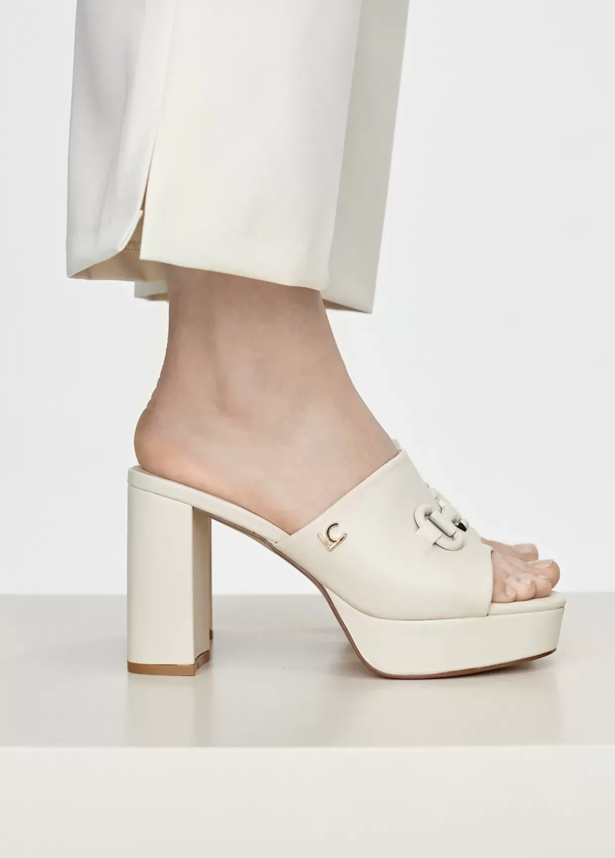 Zapato tipo zueco con tacón y hebilla al tono decorativa. Detalle letras logo doradas en parte lateral y plantilla logotipada.