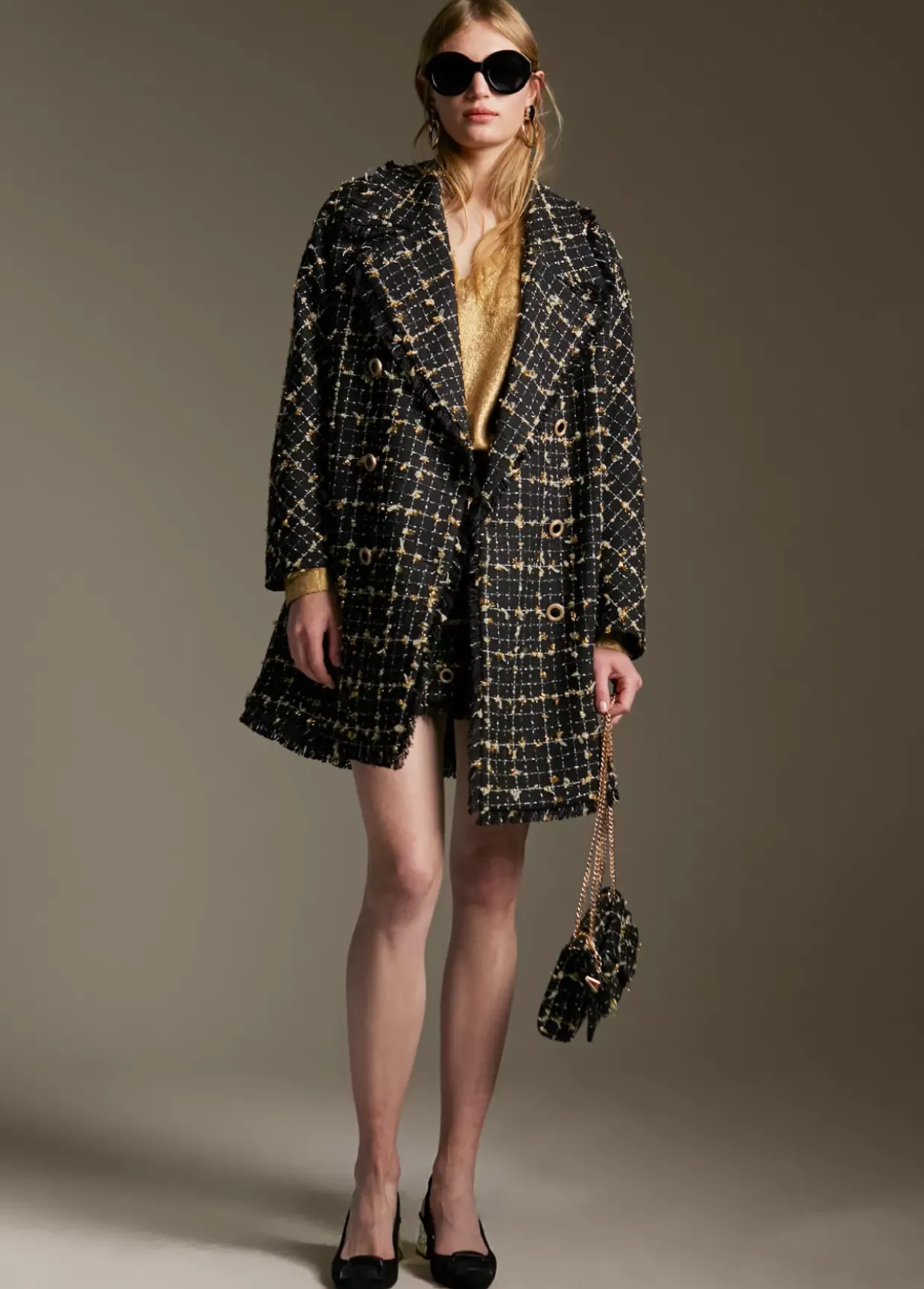 Abrigo corto de cuadros con detalle en lúrex- Cruzado, cuello solapa y cerrado con botones bicolor. Bolsillos laterales.