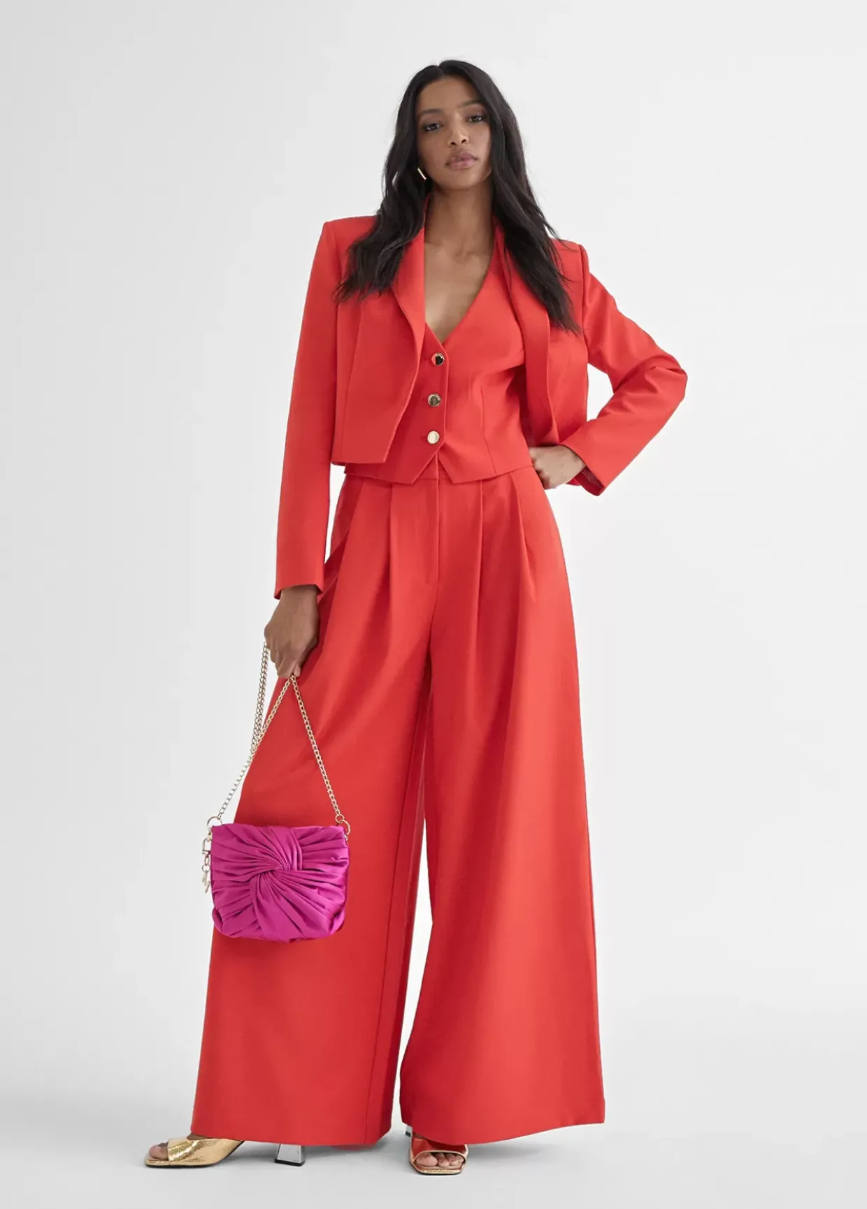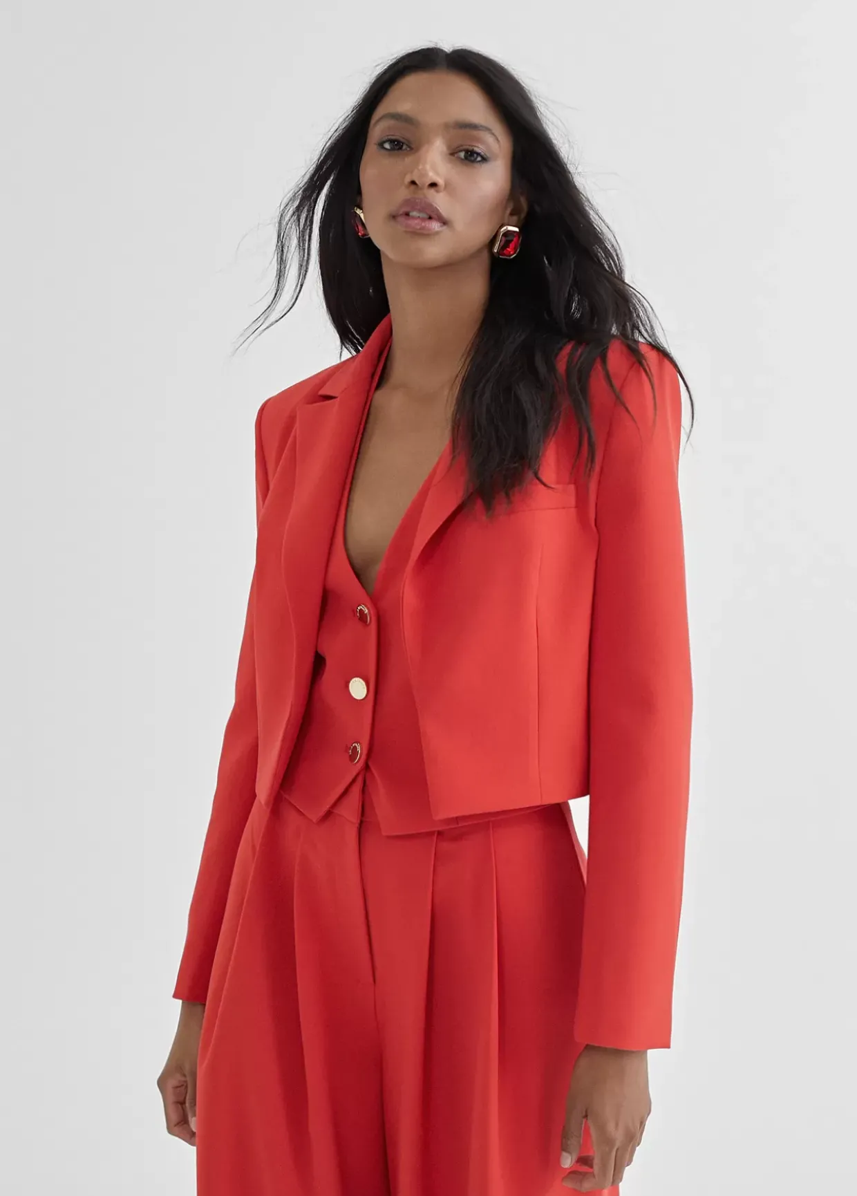 Americana cropped mono color. Cuello solapa y sin botones. Forro logotipado a contraste.