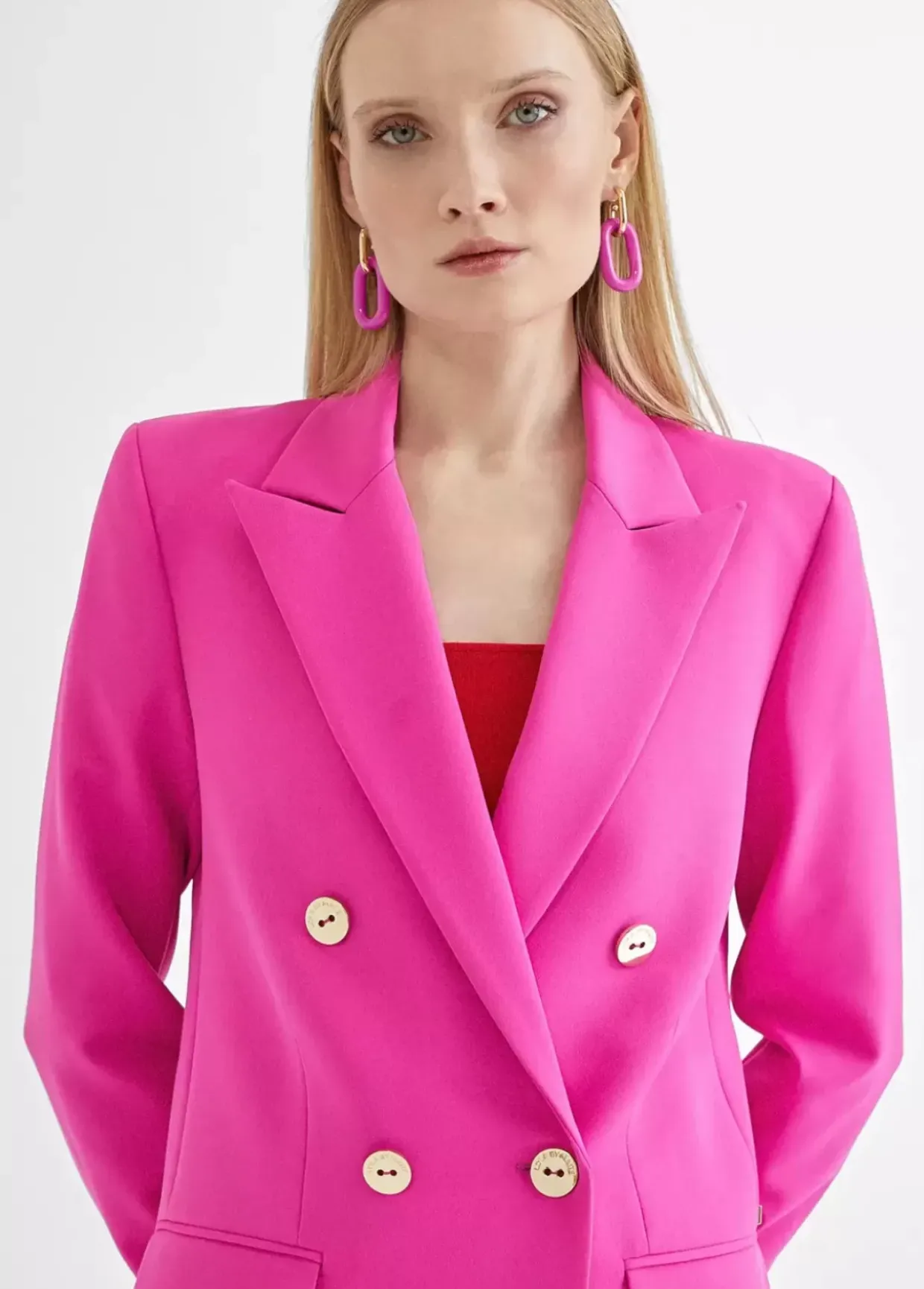 Blazer cruzada monocolor. Cuello solapa y cierre con botones dorados. Bolsillos de vivo con solapa en delantero. Forro en estampado animal print.